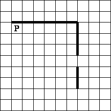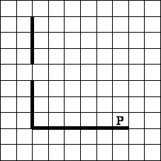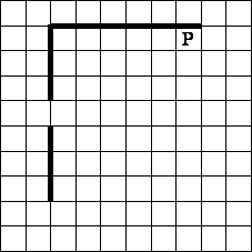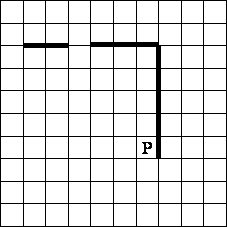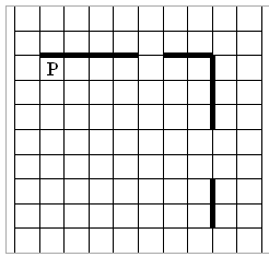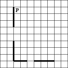 При исполнении алгоритма Робот не должен разрушиться, выполнение алгоритма должно завершиться. Конечное расположение Робота может быть произвольным. Алгоритм должен решать задачу для любого допустимого расположения стен и любого расположения и размера прохода внутри стены. Алгоритм может быть выполнен в среде формального исполнителя или записан в текстовом редакторе. Сохраните алгоритм в текстовом файле. Название файла и каталог для сохранения Вам сообщат организаторы экзамена. ?) показать одно из правильных решений Вопрос id:52365 Тема/шкала: 21,20.1 робот Исполнитель Робот умеет перемещаться по лабиринту, начерченному на плоскости, разбитой на клетки. Между соседними (по сторонам) клетками может стоять стена, через которую Робот пройти не может. У Робота есть девять команд. Четыре команды – это команды-приказы: вверх вниз влево вправо При выполнении любой из этих команд Робот перемещается на одну клетку соответственно: вверх ↑, вниз ↓, влево ←, вправо →. Если Робот получит команду передвижения сквозь стену, то он разрушится. Также у Робота есть команда закрасить, при которой закрашивается клетка, в которой Робот находится в настоящий момент. Ещё четыре команды – это команды проверки условий. Эти команды проверяют, свободен ли путь для Робота в каждом из четырёх возможных направлений: сверху свободно снизу свободно слева свободно справа свободно Эти команды можно использовать вместе с условием «eсли», имеющим следующий вид: если условие то последовательность команд все Здесь условие – одна из команд проверки условия. Последовательность команд – это одна или несколько любых команд-приказов. Например, для передвижения на одну клетку вправо, если справа нет стенки и закрашивания клетки, можно использовать такой алгоритм: если справа свободно то вправо закрасить все В одном условии можно использовать несколько команд проверки условий, применяя логические связки и, или, не, например: если (справа свободно) и (не снизу свободно) то вправо все Для повторения последовательности команд можно использовать цикл «пока», имеющий следующий вид: нц пока условие последовательность команд кц Например, для движения вправо, пока это возможно, можно использовать следующий алгоритм: нц пока справа свободно вправо кц Выполните задание. На бесконечном поле есть горизонтальная и вертикальная стены. Левый конец горизонтальной стены соединён с верхним концом вертикальной стены. Длины стен неизвестны. В вертикальной стене есть ровно один проход, точное место прохода и его ширина неизвестны. Робот находится в клетке, расположенной непосредственно под горизонтальной стеной у её правого конца. На рисунке указан один из возможных способов расположения стен и Робота (Робот обозначен буквой «Р»).