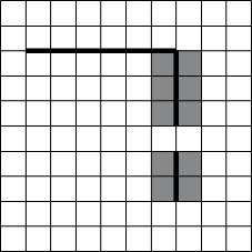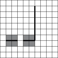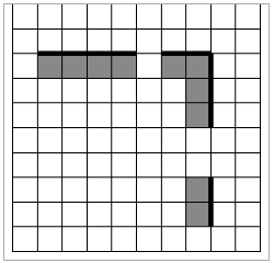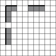 Напишите для Робота алгоритм, закрашивающий все клетки, расположенные непосредственно выше горизонтальной стены и правее вертикальной стены. Проходы должны остаться не закрашенными. Робот должен закрасить только клетки, удовлетворяющие данному условию. Например, для приведённого выше рисунка Робот должен закрасить следующие клетки (см. рисунок).