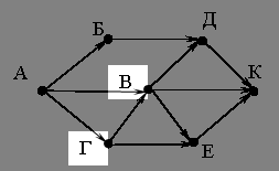 ?) 9 ?) 11 ?) 13 ?) 15 Вопрос id:50803 Тема/шкала: 11,11 схема дорог (Умение представлять и считывать данные в разных типах информационных моделей B9) На рисунке – схема дорог, связывающих города А, Б, В, Г, Д, Е, К. По каждой дороге можно двигаться только в одном направлении, указанном стрелкой. Сколько существует различных путей из города А в город К? Вопрос id:50804 Тема/шкала: 3,03 длина пути (Умение представлять и считывать данные в разных типах информационных моделей A2) Между населёнными пунктами A, B, C, D, E, F построены дороги, протяжённость которых (в километрах) приведена в таблице.