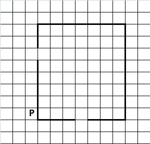 Выполните задание. На бесконечном поле имеются четыре стены, соединённые между собой, которые образуют прямоугольник. Длины стен неизвестны. В левой вертикальной стене есть ровно один проход, в нижней горизонтальной стене также есть ровно один проход. Проход не может примыкать к углу прямоугольника. Точные места проходов и ширина проходов неизвестны. Робот находится около нижнего конца левой вертикальной стены, снаружи прямоугольника и выше нижней стены. На рисунке указан один из возможных способов расположения стен и Робота (Робот обозначен буквой «Р»).