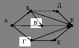 (Ширина < 15) И (Вид="черно-белый")? В ответе укажите одно число – искомое количество записей. Вопрос id:52477 Тема/шкала: 11,11 схема дорог (Умение представлять и считывать данные в разных типах информационных моделей B9) На рисунке – схема дорог, связывающих города А, Б, В, Г, Д, Е, К. По каждой дороге можно двигаться только в одном направлении, указанном стрелкой. Сколько существует различных путей из города А в город К?