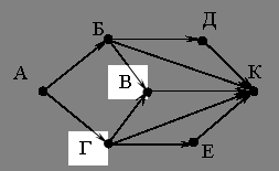 Вопрос id:52484 Тема/шкала: 4,04 каталоги В некотором каталоге хранился файл Общая, имевший полное имя D:\Фото\2012\Общая. Пользователь, находившийся в этом каталоге, поднялся на два уровня вверх, создал подкаталог 9 класс и переместил в созданный подкаталог файл Общая. Каково стало полное имя этого файла после перемещения? ?) D:\Фото\9 класс\Общая ?) D:\Фото\2012\9 класс\Общая ?) D:\9 класс\Общая ?) D:\2012\9 класс\Общая Вопрос id:52485 Тема/шкала: 13,13 системы счисления ( Знания о системах счисления и двоичном представлении информации в памяти компьютера A1) Переведите число 147 из десятичной системы счисления в двоичную систему счисления. Сколько единиц содержит полученное число? В ответе укажите одно число – количество единиц. Вопрос id:52486 Тема/шкала: 11,11 схема дорог (Умение представлять и считывать данные в разных типах информационных моделей B9) На рисунке – схема дорог, связывающих города А, Б, В, Г, Д, Е, К. По каждой дороге можно двигаться только в одном направлении, указанном стрелкой. Сколько существует различных путей из города А в город К?