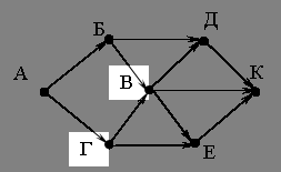 ?) =A1+2 ?) =С1/D1 ?) =C1/A1 ?) =D1+1 Вопрос id:52575 Тема/шкала: 11,11 схема дорог (Умение представлять и считывать данные в разных типах информационных моделей B9) На рисунке – схема дорог, связывающих города А, Б, В, Г, Д, Е, К. По каждой дороге можно двигаться только в одном направлении, указанном стрелкой. Сколько существует различных путей из города А в город К?
