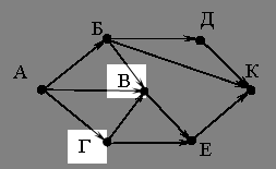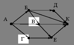 Вопрос id:52604 Тема/шкала: 13,13 системы счисления ( Знания о системах счисления и двоичном представлении информации в памяти компьютера A1) Переведите число 144 из десятичной системы счисления в двоичную систему счисления. Сколько единиц содержит полученное число? В ответе укажите одно число – количество единиц. Вопрос id:52605 Тема/шкала: 11,11 схема дорог (Умение представлять и считывать данные в разных типах информационных моделей B9) На рисунке – схема дорог, связывающих города А, Б, В, Г, Д, Е, К. По каждой дороге можно двигаться только в одном направлении, указанном стрелкой. Сколько существует различных путей из города А в город К?