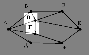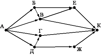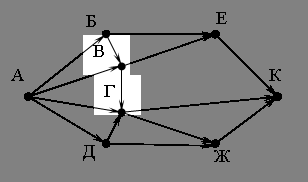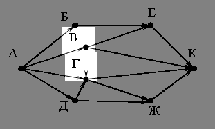 (Категория поезда = «пассажирский») ИЛИ (Вокзал = «Белорусский»)? В ответе укажите одно число – искомое количество записей. Вопрос id:52628 Тема/шкала: 13,13 системы счисления ( Знания о системах счисления и двоичном представлении информации в памяти компьютера A1) Переведите двоичное число 1101101 в десятичную систему счисления. Вопрос id:52629 Тема/шкала: 11,11 схема дорог (Умение представлять и считывать данные в разных типах информационных моделей B9) На рисунке – схема дорог, связывающих города А, Б, В, Г, Д, Е, Ж и К. По каждой дороге можно двигаться только в одном направлении, указанном стрелкой. Сколько существует различных путей из города А в город К?