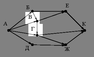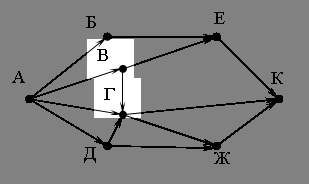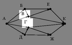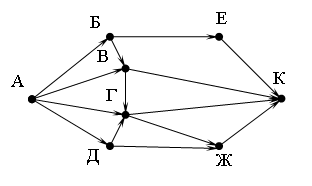 Вопрос id:52678 Тема/шкала: 11,11 схема дорог (Умение представлять и считывать данные в разных типах информационных моделей B9) На рисунке – схема дорог, связывающих города А, Б, В, Г, Д, Е, Ж и К. По каждой дороге можно двигаться только в одном направлении, указанном стрелкой. Сколько существует различных путей из города А в город К?