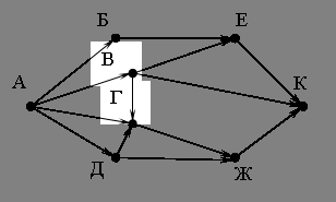 Некоторые шифровки можно расшифровать не одним способом. Например, 00010101 может означать не только СКА, но и СНК. Даны три кодовые цепочки: 1010110 11110001 100000101 Найдите среди них ту, которая имеет только одну расшифровку, и запишите в ответе расшифрованное слово. Вопрос id:51033 Тема/шкала: 13,13 системы счисления ( Знания о системах счисления и двоичном представлении информации в памяти компьютера A1) Переведите число 121 из десятичной системы счисления в двоичную систему счисления. Сколько единиц содержит полученное число? В ответе укажите одно число – количество единиц. Вопрос id:51034 Тема/шкала: 11,11 схема дорог (Умение представлять и считывать данные в разных типах информационных моделей B9) На рисунке – схема дорог, связывающих города А, Б, В, Г, Д, Е, Ж и К. По каждой дороге можно двигаться только в одном направлении, указанном стрелкой. Сколько существует различных путей из города А в город К? |