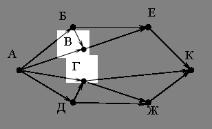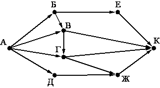 Если таких алгоритмов более одного, то запишите любой из них. Вопрос id:51150 Тема/шкала: 8,08 определить значение переменной ( Использование переменных. Операции над переменными различных типов в языке программирования. B5) В программе «:=» обозначает оператор присваивания, знаки «+», « – », «*» и «/» – соответственно операции сложения, вычитания, умножения и деления. Правила выполнения операций и порядок действий соответствует правилам арифметики. Определите значение переменной b после выполнения алгоритма: a := 1 b := 4 a := 2*a+3*b b := a/2*b В ответе укажите одно целое число – значение переменной b Вопрос id:51151 Тема/шкала: 13,13 системы счисления ( Знания о системах счисления и двоичном представлении информации в памяти компьютера A1) Переведите двоичное число 1110011 в десятичную систему счисления. Вопрос id:51152 Тема/шкала: 11,11 схема дорог (Умение представлять и считывать данные в разных типах информационных моделей B9) На рисунке – схема дорог, связывающих города А, Б, В, Г, Д, Е, Ж и К. По каждой дороге можно двигаться только в одном направлении, указанном стрелкой. Сколько существует различных путей из города А в город К? ![]() Вопрос id:51153 Тема/шкала: 3,03 длина пути (Умение представлять и считывать данные в разных типах информационных моделей A2) Между населёнными пунктами A, B, C, D, E построены дороги, протяжённость которых (в километрах) приведена в таблице.