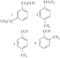 Список вопросов базы знанийХимияВопрос id:66244 Тема/шкала: Органическая химия Определите структуру вещества с молекулярной формулой С8Н10О, если оно не дает цветной реакции с хлоридом железа(III), с бромводородом образует соединение состава С8Н9Вr, а с перманганатом калия окисляется, образуя вещество С8Н6O4. ![]() ?) 2, 4 ?) 1 ?) 1, 3 ?) 4 Вопрос id:66245 Тема/шкала: Органическая химия Определите структуру углеводорода(ов), которая(ые) обесцвечивает(ют) бромную воду, при окислении перманганатом калия образует(ют) терефталевую кислоту, а с аммиачным раствором окиси серебра не образует(ют) осадков ![]() ?) 2 ?) 3 ?) 1, 3, 4 ?) 2, 3 Вопрос id:66246 Тема/шкала: Органическая химия При взаимодействии ароматического углеводорода состава С9Н12 со смесью концентрированных азотной и серной кислот получена смесь четырех изомеров состава C9H11NO2. Укажите исходный углеводород (не учитывать нитрование боковой цепи). ?) пропилбензол ?) 1-метил-2-этилбензол ?) 1-метил-4-этилбензол ?) изопропилбензол Вопрос id:66247 Тема/шкала: Органическая химия Определите строение ароматического углеводорода(ов) состава С8Н10, если при его (их) окислении образуется бензолдикарбоновая кислота, а при нитровании (в присутствии H2SO4) образуется два вещества состава C8H9NO2(не учитывать нитрование боковой цепи). ![]() ?) 2, 4 ?) 2 ?) 1, 3 ?) 4 Вопрос id:66248 Тема/шкала: Органическая химия Определите структуру углеводорода(ов), которая(ые) обесцвечивает(ют) бромную воду, при окислении перманганатом калия образует(ют) дикарбоновую кислоту, а с аммиачным раствором окиси серебра – осадок.