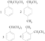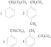 ?) 3, 4 ?) 1 ?) 1, 3, 4 ?) 2 Вопрос id:66249 Тема/шкала: Органическая химия При взаимодействии 56,4 г фенола с азотной кислотой (в присутствии H2SO4) образовались о-нитрофенол, п-нитрофенол и пикриновая кислота в мольном соотношении 1:2:3 соответственно. Определите массу (г) азотной кислоты, участвовавшей в реакции. ?) 75,6 ?) 113,4 ?) 37,8 ?) 189 Вопрос id:66250 Тема/шкала: Органическая химия При взаимодействии ароматического углеводорода состава С9Н12 со смесью концентрированных азотной и серной кислот получена смесь двух изомеров соединения состава C9H11NO2. Укажите исходный ароматический углеводород (не учитывать нитрование боковой цепи). ?) 1-метил-2-этилбензол ?) 1-метил-4-этилбензол ?) 1-метил-4-изопропилбензол ?) этилбензол Вопрос id:66251 Тема/шкала: Органическая химия При взаимодействии карболовой и 50,4 г азотной кислот (в присутствии H2SO4) образовались 2-нитрофенол, 4-нитрофенол и пикриновая кислота в мольном соотношении 1:2:3 соответственно. Определите массу (г) карболовой кислоты, участвовавшей в реакции. ?) 17,4 ?) 37,6 ?) 75,2 ?) 112,8 Вопрос id:66252 Тема/шкала: Органическая химия При хлорировании 0,6 моль толуола (в присутствии света) образовались C6H5CH2Cl, С6Н5СНСl2 и С6Н5ССl3 в мольном соотношении 3:2:1 соответственно. Определите объем (л, н.у.) израсходованного хлора. ?) 22,4 ?) 67,2 ?) 11,2 ?) 44,8 Вопрос id:66253 Тема/шкала: Органическая химия Определите строение ароматического углеводорода(ов) состава С8Н10, если при его (их) окислении образуется бензолдикарбоновая кислота, а при нитровании (в присутствии H2SO4) образуется только одно вещество состава C8H9NO2 (не учитывать нитрование боковой цепи). ![]() ?) 1, 3 ?) 4 ?) 2, 4 ?) 2 Вопрос id:66254 Тема/шкала: Органическая химия Определите строение ароматического углеводорода(ов) состава С9Н12, если при его (их) окислении образуется бензолдикарбоновая кислота, а при нитровании (в присутствии H2SO4) – смесь четырех изомеров состава C9H11NO2 (не учитывать нитрование боковой цепи). ![]() ?) 2, 4 ?) 1, 2, 3 ?) 4 ?) 2 Вопрос id:66255 Тема/шкала: Органическая химия При воздействии на ароматический углеводород состава С8Н10 смесью концентрированных азотной и серной кислот получена смесь двух изомеров состава C8H9NO2. Укажите исходный(е) ароматический(е) углеводород(ы) (не учитывать нитрование боковой цепи). ?) о-ксилол; ?) п-ксилол. ?) пропилбензол; ?) винилбензол; Вопрос id:66256 Тема/шкала: Органическая химия При воздействии на ароматический углеводород состава С8Н10 смесью концентрированных азотной и серной кислот получена смесь двух изомеров состава C8H9NO2. Укажите исходный(е) ароматический(е) углеводород(ы) (не учитывать нитрование боковой цепи). ?) этилбензол; ?) 1,2-диметилбензол; ?) 1,4-диметилбензол. ?) винилбензол; Вопрос id:66257 Тема/шкала: Органическая химия При взаимодействии ароматического углеводорода состава С9Н12 со смесью концентрированных азотной и серной кислот получена смесь четырех изомеров соединения состава C9H11NO2. Укажите исходный ароматический углеводород (не учитывать нитрование боковой цепи). ?) 1,2-диэтилбензол; ?) 1- метил-2-этилбензол. ?) этилбензол; ?) 1-метил-4- этилбензол; Вопрос id:66258 Тема/шкала: Органическая химия В реакции 112,8 г фенола и бромной воды образовались 2-бромфенол,4-бромфенол и 2,4,6-трибромфенол в мольном соотношении 1:2:3 соответственно. Определите массу (г) брома, участвовавшего в реакции. ?) 384 ?) 192 ?) 448 ?) 240 Вопрос id:66259 Тема/шкала: Органическая химия Определите строение ароматического углеводорода(ов) состава С9Н