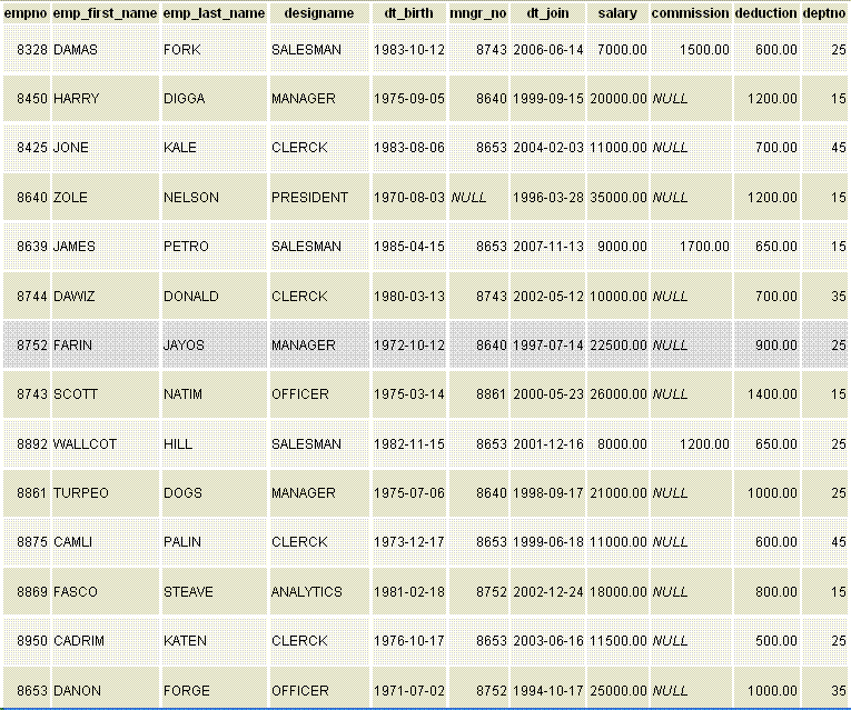Какой результат вернет данный запрос? SELECT sum1(9, NULL) IS NULL, sum2(9, NULL); ?) t | NULL ?) NULL | 9 ?) 9 | 9 ?) t | 9 ?) NULL | NULL Вопрос id:84107 Тема/шкала: Операторы манипуляции данными (Data Manipulation Language, DML) В таблицу orderinfo необходимо внести данные о новом заказе клиента с именем Mike и фамилией Howard. Заказ был сделан 1 Апреля 2012 года, дата отправки 10 Апреля 2012 года, цена отправки 10 долларов. Какой из запросов наиболее подходящий? ?) INSERT INTO orderinfo VALUES(1, (select customer_id FROM customer WHERE fname='Mike' and lname='Howard'), '01-04-2012', '10-04-2012', 10); ?) INSERT INTO orderinfo VALUES(1, (select customer_id FROM customer WHERE fname='Mike'), '01-04-2012', '10-04-2012', 10); ?) INSERT INTO orderinfo VALUES(1, (select customer_id FROM customer), '01-04-2012', '10-04-2012', 10); ?) INSERT INTO orderinfo VALUES(1, (select customer_id FROM customer WHERE lname='Howard'), '01-04-2012', '10-04-2012', 10); ?) INSERT INTO orderinfo VALUES(1, (select customer_id FROM customer WHERE fname='Mike Howard'), '01-04-2012', '10-04-2012', 10); Вопрос id:84108 Тема/шкала: Администрирование сервера С помощью какого запроса можно узнать, подключен ли сейчас пользователь username к базе данных PostgreSQL? ?) SELECT datname FROM pg_stat_activity WHERE usename = 'username'; ?) SELECT datname FROM pg_activity WHERE usename; ?) SELECT datname FROM pg_stat_activity WHERE usename = username; ?) SELECT datname FROM pg_activity WHERE usename = username; ?) SELECT datname FROM pg_activity WHERE usename = 'username'; Вопрос id:84109 Тема/шкала: Функции и операторы В таблице выше представлены данные товаров. Какие из записей таблицы будут результатом запуска данного запроса SELECT * FROM item WHERE description ~* '^[PR].*E$';? ?) Запись с item_id = 5 ?) Запись с item_id = 2, 5, 6 и 7 ?) Все ?) Запись с item_id = 2 и 5 ?) Запись с item_id = 2 Вопрос id:84110 Тема/шкала: Администрирование сервера Какие из следующих изменений в базе данных Slony не охватывает при репликации? 1. Изменения в записях таблиц 2. Изменения в структуре таблиц 3. Изменения в ролях и пользователях 4. Изменения в больших объектах(BLOB) ?) 3 и 4 ?) 1 и 2 ?) 1, 2, 3 и 4 ?) 2 и 3 ?) 2, 3 и 4 Вопрос id:84111 Тема/шкала: Операторы манипуляции данными (Data Manipulation Language, DML) В таблице employee необходимо перевести всех менеджеров(manager) моложе 40 в отделение(deptno) 15. Выберите наиболее правильный ответ. ?) UPDATE employee SET deptno=15 WHERE designame='MANAGER' and EXTRACT(year from AGE(dt_birth))<40; ?) UPDATE employee SET deptno=15 WHERE designame='MANAGER' and AGE(dt_birth)>40; ?) UPDATE employee SET deptno=25 WHERE designame='MANAGER' and AGE(dt_birth)<40; ?) UPDATE employee SET deptno=25 WHERE designame='MANAGER' and EXTRACT(year from AGE(dt_birth))<40; ?) UPDATE employee SET deptno=15 WHERE designame='MANAGER' and AGE(dt_birth)<40; Вопрос id:84112 Тема/шкала: Введение в PostgreSQL Какую из представленных платформ PostgreSQL не поддерживает? ?) Mac OS X ?) Linux ?) Solaris ?) Нет верного ответа ?) Windows Вопрос id:84113 Тема/шкала: Администрирование сервера С помощью каких команд регулируются права доступа пользователей на таблицы и схемы в PostgreSQL? ?) SET, REMOVE ?) SET, REVOKE ?) ADD, DELETE ?) GRANT, REVOKE ?) GRANT, REMOVE Вопрос id:84114 Тема/шкала: Операторы манипуляции данными (Data Manipulation Language, DML) В таблицу orderinfo необходимо внести данные о новом заказе клиента с id = 101. Заказ был сделан 28 Апреля 2013 года, дата отправки 5 мая 2013 года, цена 10 долларов. Какой из запросов наиболее подходящий? ?) INSERT INTO orderinfo(orderinfo_id, customer_id, date_placed, date_shipped, shipping) VALUES(1000, 101, '04-28-2000', '05-05-2000', 10); ?) INSERT INTO orderinfo(orderinfo_id, customer_id, date_placed, date_shipped, shipping) VALUES(1000, 101, '04-28-2013', '05-05-2013'); ?) INSERT INTO orderinfo(orderinfo_id, customer_id, date_placed, date_shipped, shipping) VALUES(1000, 101, '28-04-2013', '05-05-2013', 10); ?) INSERT INTO orderinfo VALUES(1000, '04-28-2013', '05-05-2013', 10, 101); ?) INSERT INTO orderinfo VALUES(1000, 101, '04-28-2010', '05-05-2010', 10); Вопрос id:84115 Тема/шкала: Операторы определения данных (Data Definition Language, DDL) Выберите правильный вариант SQL запроса для создания таблицы orderline ![]() ?) CREATE TABLE orderline(orderinfo_id integer, item_id integer, CONSTRAINT orderline_pk PRIMARY KEY(orderinfo_id, item_id), CONSTRAINT fk_orderline_item FOREIGN KEY(item_id) REFERENCES item(item_id)), CONSTRAINT fk_orderline_orderinfo FOREIGN KEY(order ?) CREATE TABLE orderline(orderinfo_id integer, item_id integer, CONSTRAINT fk_orderline_orderinfo FOREIGN KE