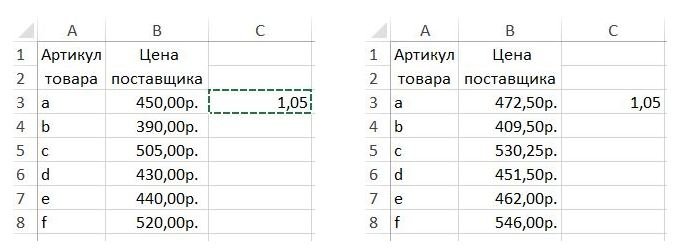 ![]() Каковы шаг и предельное значение прогрессий? ?) 3 и 8 ?) 3 и 36 ?) 8 и 36 ?) 3 и 44 ?) 8 и 43 Вопрос id:84158 Тема/шкала: Основы работы На снимке слева показан фрагмент прайс-листа. Необходимо оперативно увеличить цены на 5%, как показано в правой части снимка.