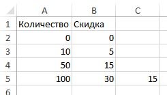 На снимке показана таблица скидок. Посредством функции ВПР в ячейке C5 была рассчитана скидка для купленного товара в количестве 56 единиц.