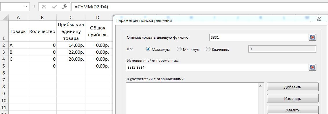 которых показана в ячейках C2:C4. С помощью средства "Поиск решения" нужно рассчитать максимально возможную прибыль от продажи, имея в виду, что общее количество проданных товаров должно быть 500, товара A должно быть продано не менее 100, а товара C - не более 100.