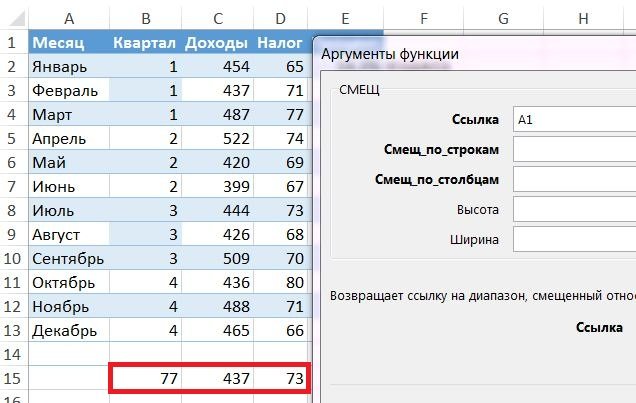 На снимке в ячейках B15:D15, выделенных красным, показаны результаты, возвращённые этой функцией при одинаковом аргументе "Ссылка" и разных аргументах "Смещ по строкам" и "Смещ по столбцам"