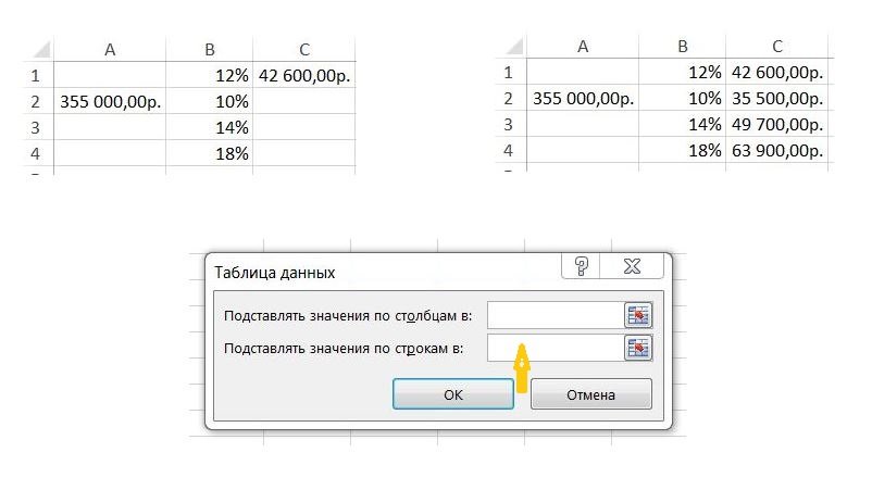 ![]() Укажите правильный вариант написания формулы ?) =$B$3*$C$3 ?) =B3*$C$3 ?) =B3*(1+$C$3) ?) =$B$3*(1+$C$3) ?) =$B$3*(1+C3) Вопрос id:84211 Тема/шкала: Аналитические задачи В ячейку A2 введена имеющаяся у вкладчика сумма, а в ячейке C1 - сумма начисленных процентов вклада при годовом проценте 12%. С помощью таблицы подстановки необходимо рассчитать начисленные проценты при показанных в ячейках B2:B4 других значениях годового процента. После выделения соответствующего диапазона ячеек и вызова команды подстановки таблицы возникает показанная в нижней части снимка окно.