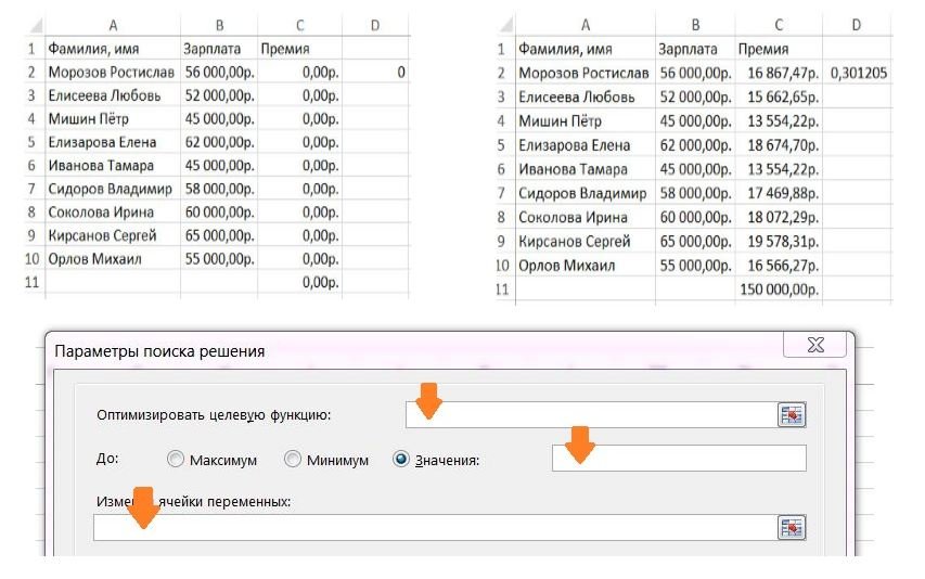 ![]() Какой диапазон ячеек необходимо выделить для размещения транспонированного массива и какое сочетание клавиш надо нажать, чтобы указать программе, что функция относится к категории массивов? ?) D1:M2 и Ctrl+Shift+Enter ?) D1:M2 и пробел+Enter ?) D1:D10 и Ctrl+Enter ?) D1:M1 и Shift+Enter ?) M1:M10 и Alt+Enter Вопрос id:84251 Тема/шкала: Аналитические задачи Посредством надстройки Excel "Поиск решения" надо рассчитать премию сотрудникам отдела пропорционально их зарплате. Общая сумма премии составляет 150000 руб.