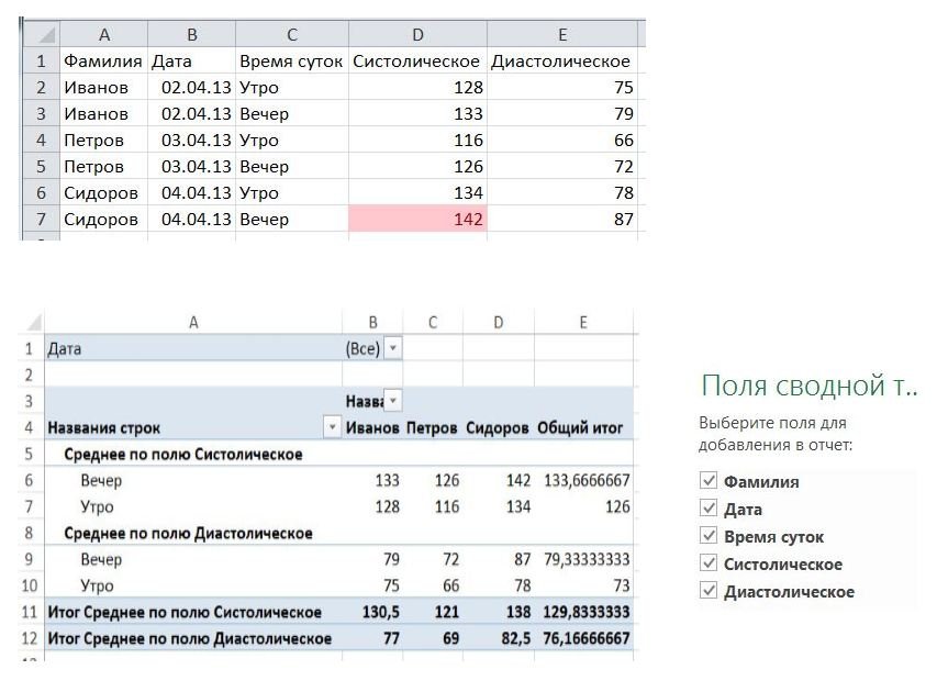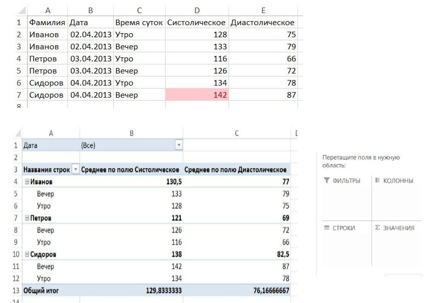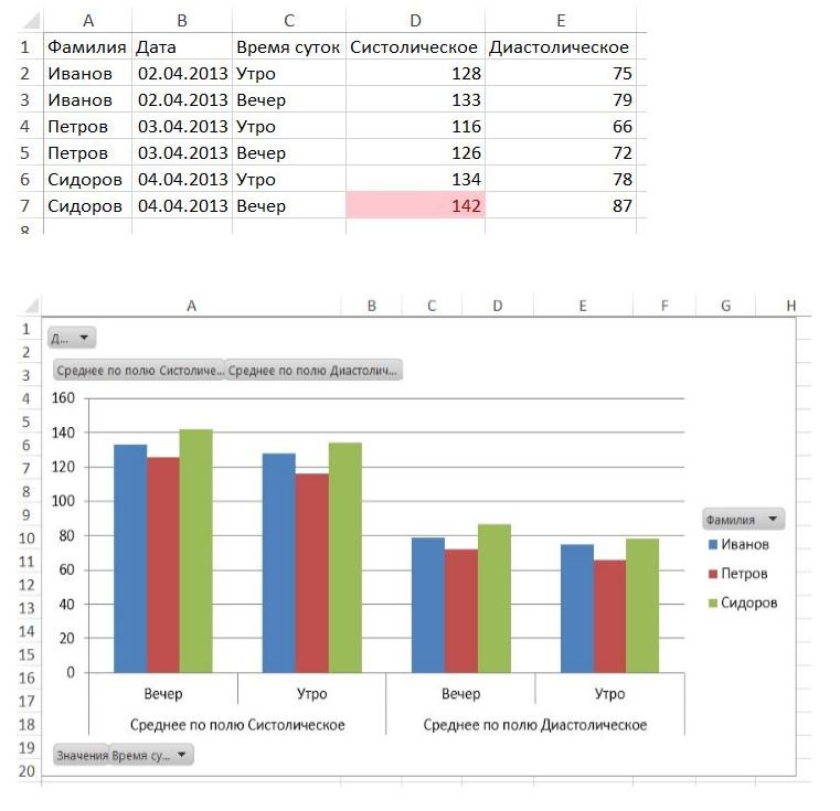 значения кровяного давления пациентов. Соответствующая сводная таблица показана в нижней части снимка.