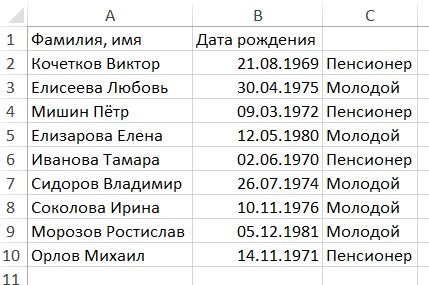 ![]() Сколько столбиков останется, если отфильтровать одну из трёх фамилий? А если одно из двух времён суток? ?) Соответственно 6 и 6 ?) Соответственно 4 и 8 ?) Соответственно 4 и 6 ?) Соответственно 8 и 8 ?) Соответственно 8 и 6 Вопрос id:84259 Тема/шкала: Формулы и функции Имеется показанный на снимке список сотрудников; один из столбцов списка содержит их дату рождения. Требуется добавить столбец, в котором сотрудников, возраст которых превышает 40 лет, нужно отметить словом "Пенсионер", в противном случае - словом "Молодой".