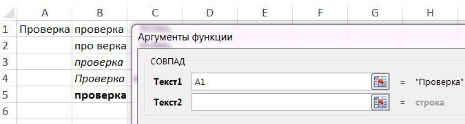 >Как можно добавить на построенную диаграмму дополнительные данные в процентах? ?) "Работа с диаграммами" -> "Конструктор" -> "Выбрать данные" ?) "Работа с диаграммами" -> "Конструктор" -> "Добавить элементы диаграммы" -> "Линия тренда" ?) После построения диаграммы выделить её, затем на ленте "Главная" нажать инструмент "Процентный формат" ?) После построения диаграммы выделить рублёвый диапазон и изменить формат ячеек на процентный ?) "Работа с диаграммами" -> "Конструктор" -> "Добавить элементы диаграммы" -> "Подписи данных" -> "Дополнительные параметры подписей данных" -> "Доли" Вопрос id:84263 Тема/шкала: Формулы и функции В категории текстовых функций есть функция СОВПАД, сравнивающая две строки текста и возвращающая результат ИСТИНА или ЛОЖЬ. С помощью этой функции текст ячейки A1 был последовательно сравнён с текстом в ячейках с B1 по B5.