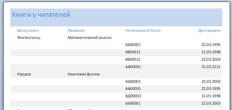 Private Sub Form_KeyDown(KeyCode As Integer, Shift As Integer)Вы случайно задели клавиатуру и появилось следующее сообщение при открытой форме: "Давно не виделись!". Какая кнопка была нажата? ?) Enter ?) Delete ?) F5 ?) Caps Lock ?) Shift Вопрос id:85947 Тема/шкала: Интерфейс MS Access 2010 Какими из перечисленных способов невозможно опустить панель (выделена на рисунке) под ленту? (Выделите два ответа) ![]() ?) В контекстном меню ленты выбрать "Настройка ленты" - "Разместить панель быстрого доступа под лентой" ?) В контекстном меню панели выбрать "Разместить панель быстрого доступа под лентой" ?) В контекстном меню ленты выбрать "Разместить ленту над панелью быстрого доступа" ?) В контекстном меню ленты выбрать "Разместить панель быстрого доступа под лентой" ?) В контекстном меню панели выбрать "Настройки панели быстрого доступа" - "Разместить панель быстрого доступа под лентой" Вопрос id:85948 Тема/шкала: Работа с формами и отчетами Создан отчет, который имеет следующий вид: Какой из следующих отчетов в режиме конструктора соответствуют данному? ?) ![]() ?) ![]() ?) ![]() ?) ![]() ?) ![]() Вопрос id:85949 Тема/шкала: Работа с таблицами Что нужно в первую очередь сделать с таблицей перед переименованием? ![]() ?) Открыть в режиме конструктора ?) Закрыть ?) Открыть в режиме таблицы ?) Открыть ?) Открыть в режиме сводной диаграммы Вопрос id:85950 Тема/шкала: Создание макросов и обработчиков событий в Visual Basic Создана таблица, которая содержит фамилию студента и название его дипломной работы. Создана форма, в которой поля связаны с соответствующими полями таблицы, а также кнопка Button.