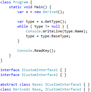 ?) Derived Base ?) Derived Base ICustomInterface1 ICustomInterface2 ?) Derived Base ICustomInterface1 ICustomInterface2 Object ?) Derived Base Object ?) Программа содержит ошибку и не скомпилируется. Вопрос id:86406 Тема/шкала: Компоненты платформы .NET и конфигурирование сборок Какой атрибут сборки задает её версию, участвующую в поиске нужной сборки по его полному имени? ?) FileVersionAttribute ?) MajorVersionAttribute ?) AssemblyVersionAttribute ?) AssemblyFileVersionAttribute ?) AssemblyInformationalVersionAttribute Вопрос id:86407 Тема/шкала: Основы, синтаксис Какие из перечисленных типов являются ссылочными: ?) object ?) string ?) int? ?) int ?) IEnumerable |