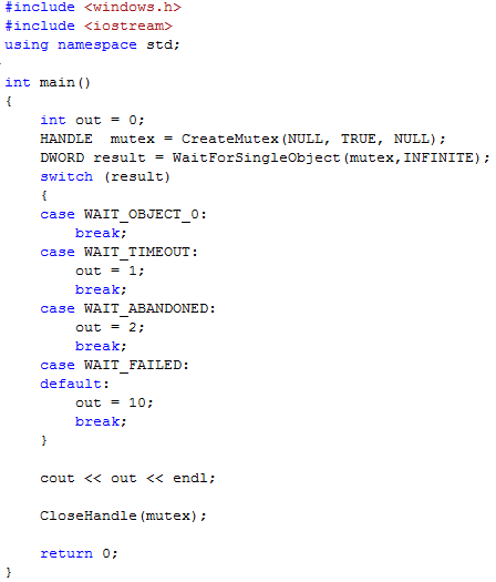 Список вопросов базы знанийПрограммирование с использованием Win32 APIВопрос id:86998 Тема/шкала: Общие вопросы программирования под Windows При работе с консольными приложениями (в том числе и посредством Win32 API) нередко приходится устанавливать кодировку. В каких из представленных популярных кодировок используется кириллица? ?) Windows-1250 ?) CP866 ?) CP1251 ?) CP437 ?) ANSI-1252 Вопрос id:86999 Тема/шкала: Общие вопросы программирования под Windows Программист написал функцию удаления каталога и всех его подкаталогов: ![]() Что нужно подставить вместо ___1___, чтобы она корректно работала? (будем считать, что CString – просто класс для работы со строками, удобная оболочка над строкой в стиле С): ?) RemoveDirectoryEx ?) RemoveDir ?) DeleteFile ?) MoveFileEx ?) RemoveDirectory Вопрос id:87000 Тема/шкала: Функции Win32 API Какой функции из перечисленных не существует в Win32 API? ?) TranslateMessage ?) WaitForMultipleObjects ?) VirtualFree ?) UnloadLibrary ?) MapViewOfFile Вопрос id:87001 Тема/шкала: Общие вопросы программирования под Windows Это сообщение посылается когда пользователь выбирает команду меню или посылает команду из элемента управления. ?) WM_CHOOSE ?) WM_COMMAND ?) WM_NOTIFY ?) WM_ACTIVATE ?) WM_SELECT Вопрос id:87002 Тема/шкала: Общие вопросы программирования под Windows Какой базовый стиль окна не входит в комбинированный стиль WS_OVERLAPPEDWINDOW? ?) WS_CAPTION ?) WS_MAXIMIZEBOX ?) WS_MINIMIZEBOX ?) WS_CHILD ?) WS_SYSMENU Вопрос id:87003 Тема/шкала: Потоки и процессы Если выполнить вызов Sleep(0), то … ?) поток приостановится и сразу встанет в очередь на выполнение ?) поток приостановится на 1 миллисекунду ?) поток приостановится на неопределенное время ?) Вызов Sleep() просто проигнорируется ?) поток не приостановится и не передаст управление другому потоку Вопрос id:87004 Тема/шкала: Другие На рисунке представлен пример матрицы управления доступами. ![]() Строки соответствуют субъектам, столбцы – объектам. В клетках прописаны соответствующие права. Определите, какое утверждение ложно. ?) Борис имеет право удалить файл Василия и свой файл, но не имеет прав чтения на Объект 1 ?) Исполнять Объект 2 могут только Александр, Никита и Менеджер ?) Александр имеет право на чтение файла Василия, Василий имеет право на запись файла Никиты, а Никита имеет право на чтение файлов Бориса и Василия ?) Михаил и Никита обладают одинаковыми правами только на файл Бориса и на Объект 1. ?) Менеджер имеет право устанавливать режимы доступа для всех перечисленных в таблице объектов, но передавать права управления объектами другим субъектам - только для файлов Бориса и Василия Вопрос id:87005 Тема/шкала: Обмен данными между процессами и DLL Следующий код использует Native API для перевода ПК в режим гибернации (работает для WinXP / Win 7): ![]() Какой вариант из представленных нужно вставить в строку 8, чтобы код успешно скомпилировался и выполнился? (код компилируется с поддержкой Unicode) ?) NTDll_PA NtInitiatePowerAction = GetProcAddress(Dll, "NtInitiatePowerAction"); ?) NTDll_PA NtInitiatePowerAction = GetProcAddress("NtInitiatePowerAction"); ?) NTDll_PA NtInitiatePowerAction = GetDllProcAddress("NtInitiatePowerAction"); ?) NTDll_PA NtInitiatePowerAction = (NTDll_PA)GetDllProcAddress("NtInitiatePowerAction"); ?) NTDll_PA NtInitiatePowerAction = (NTDll_PA)GetProcAddress(Dll, "NtInitiatePowerAction"); Вопрос id:87006 Тема/шкала: Структурная обработка исключений Какой фрагмент кода из представленных не содержит ошибок? ?) ![]() ?) ![]() ?) ![]() ?) ![]() ?) ![]() Вопрос id:87007 Тема/шкала: GDI Есть работоспособный фрагмент кода рисования в клиентской области окна: ![]() Какое число будет нарисовано в клиентской области окна в результате его выполнения? *Цифры изображаются в стиле начертания индекса на почтовых ко