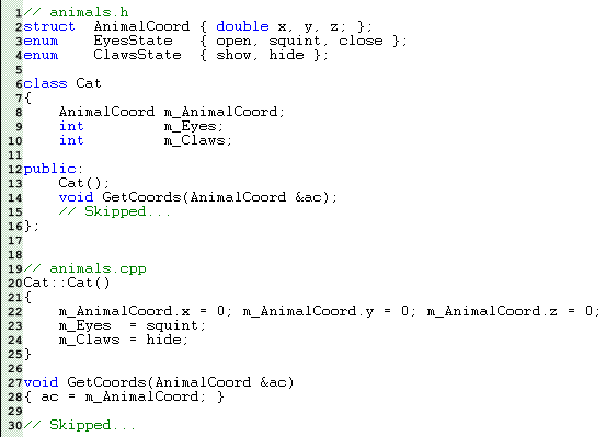 ![]() ?) 6 ?) 6, 11 ?) 12 ?) 6, 12 ?) 11, 12 Вопрос id:94500 Тема/шкала: Общие вопросы программирования на C++. Для вычисления значений тригонометрических функций во многих приложениях для ускорения применяются готовые таблицы для быстрой аппроксимации значений. На рисунке приведен пример такой таблицы для аппроксимации значений синуса от 0 до 30 градусов с шагом 3 градуса, который содержит некорректные синтаксические конструкции. В чем состоит ошибка? ![]() ?) Неверное количество значений инициализации ?) Неверно используется имя функции sin (синус) ?) Вместо «;» нужно было использовать «,», а вместо «,» - «.» ?) Вместо «;» нужно было использовать «,» ?) Вместо «,» нужно было использовать «.» Вопрос id:94501 Тема/шкала: Базовые конструкции и синтаксис языка. Какой из перечисленных типов данных не является фундаментальным? ?) bool ?) double ?) string ?) void ?) enum Вопрос id:94502 Тема/шкала: Общие вопросы программирования на C++. При сложении указателя на объект и значения целого типа offset результатом является … ?) Значение целого типа, равное сумме адреса указателя и offset ?) Значение NULL ?) Указатель, смещенный на количество байт offset ?) Указатель, смещенный на число offset объектов ?) Указатель, смещенный на количество слов offset Вопрос id:94503 Тема/шкала: Обработка исключений и RTTI. Какие два стандартных исключения могут возникнуть при использовании механизмов RTTI? ?) bad_cast ?) bad_typeid ?) out_of_range ?) bad_alloc ?) overflow_error Вопрос id:94504 Тема/шкала: Средства ООП. Для инициализации неконстантных статических членов класса (вне функций) можно использовать синтаксис вида … ?) <тип_статического_члена> <имя_класса>::<имя_статического_члена> = <значение> ?) <имя_статического_члена> = <значение> ?) <тип_статического_члена> <имя_статического_члена> = <значение> (внутри определения класса) ?) <имя_статического_члена> = <значение> (внутри определения класса) ?) <имя_класса>::<имя_статического_члена> = <значение> Вопрос id:94505 Тема/шкала: Средства ООП. Какое объявление класса соответствует следующей диаграмме UML? ![]() ?) ![]() ?) ![]() ?) ![]() ?) ![]() ?) ![]() Вопрос id:94506 Тема/шкала: Обработка исключений и RTTI. Никогда не следует запускать исключение в деструкторе. Если в деструкторе генерируется исключение и не будет там же перехвачено, а деструктор был вызван в результате запуска другого исключения (вызван в процессе раскрутки стека), то новое исключение может быть запущено раньше достижения секции catch текущего исключения, что автоматически приведет к вызову библиотечной функции … ?) fail() ?) _endthreadex() ?) unexpected() ?) terminate() ?) exit() Вопрос id:94507 Тема/шкала: Средства ООП. Ваша программа содержит следующий класс: ![]() Укажите порядок вызова конструкторов членов класса Record при создании объекта типа Record. ?) strF, intF2, floatF, intF1 ?) floatF, intF2, intF1, strF ?) strF, intF1, intF2, floatF ?) strF, intF2, intF1, floatF ?) strF, floatF, intF1, intF2 Вопрос id:94508 Тема/шкала: Общие вопросы программирования на C++. В каких строках представленного фрагмента кода содержатся ошибки синтаксиса? ![]() ?) 4 и 9 ?) 1, 2 и 6 ?) 3 и 7 ?) 4 и 7 ?) 2, 3 и 4 Вопрос id:94509 Тема/шкала: Общие вопросы программирования на C++. Для игровой программы, в которой используются простейшие математические модели животных, был реализован класс Cat. Но в процессе компиляции в строке 28 возникает ошибка: «m_AnimalCoord: неизвестный идентификатор». Какие действия следует предпринять, чтобы решить данную проблему. ![]() ?) Исправить текущее значение строки 27 на void Cat::GetCoords(AnimalCoord &ac) ?) Исправить текущее значение строки 28 на fri