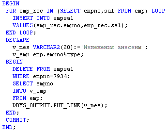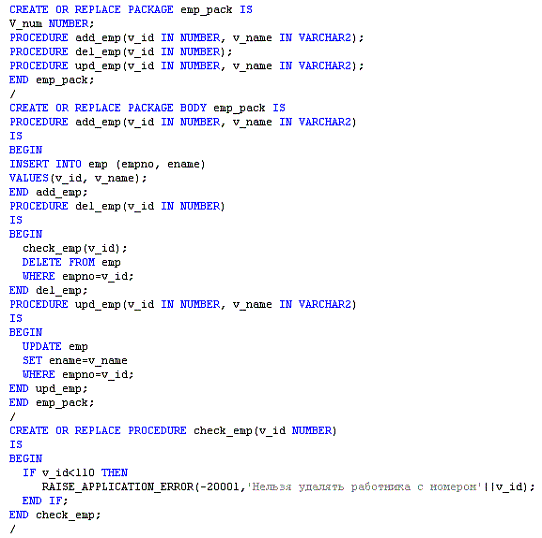 ![]() Какое выражение отобразит имя выбранного отдела? ?) DBMS_OUTPUT.PUT_LINE (name); ?) DBMS_OUTPUT.PUT_LINE (dname); ?) DBMS_OUTPUT.PUT_LINE (dept_rec (name)); ?) DBMS_OUTPUT.PUT_LINE (dept_rec.dname); ?) DBMS_OUTPUT.PUT_LINE (dept_rec.name); Вопрос id:94637 Тема/шкала: Основные синтаксические конструкции языка PL/SQL. На базе таблицы EMP создано представление EMP_VIEW: ![]() Каким будет результат выполнения команды: ![]() ?) Никаких изменений не произойдет ?) Данные работников десятого отдела (deptno=10) в столбце SAL таблицы EMP будут изменены на 20000 ?) Данные работников десятого отдела (deptno=10) в столбце TOT_SAL представления EMP будут изменены на 20000 ?) Данные работников десятого отдела (deptno=10) в столбце TOT_SAL таблицы EMP будут изменены на 20000 ?) Данные работников десятого отдела (deptno=10) в столбце SAL представления EMP будут изменены на 20000 Вопрос id:94638 Тема/шкала: Основные синтаксические конструкции языка PL/SQL. Рассмотрите следующий пакет: