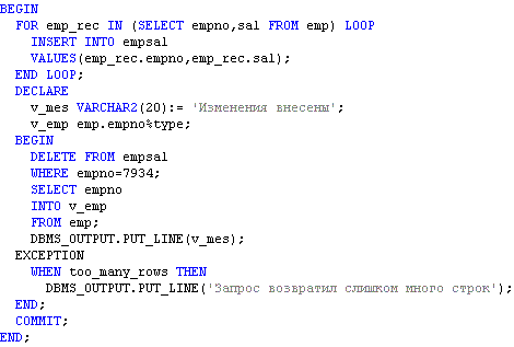 ?) ![]() ?) ![]() ?) ![]() ?) ![]() ?) ![]() Вопрос id:94649 Тема/шкала: Манипулирование данными. Каким будет результат выполнения следующего запроса: ![]() ?) Ошибка ORA-01476: делитель равен нулю ?) -30 ?) -38 ?) -37 ?) -29 Вопрос id:94650 Тема/шкала: Основные синтаксические конструкции языка PL/SQL. В базе данных были созданы пакет emp_pack и процедура check_emp: Вы внесли изменения в процедуру check_emp и перекомпилировали ее. Какое из следующих утверждений является верным? ?) Тело пакета emp_pack станет недостоверным и должно быть перекомпилировано вручную ?) Спецификация пакета emp_pack станет недостоверной и должна быть перекомпилирована вручную ?) Статус пакета emp_pack не изменится ?) Тело пакета emp_pack станет недостоверным и будет автоматически перекомпилировано при следующем вызове ?) Спецификация пакета emp_pack станет недостоверной и будет автоматически перекомпилирована при следующем вызове Вопрос id:94651 Тема/шкала: Типы данных PL/SQL. Какое из утверждений является верным? ?) Результат применения логического оператора NOT к NULL всегда FALSE ?) Результат применения логического оператора NOT к NULL всегда NULL ?) Результат применения логического оператора NOT к переменной, значение которой NULL, зависит от типа этой переменной ?) Применение логического оператора NOT к переменной, значение которой NULL, приводит к ошибке ?) Результат применения логического оператора NOT к NULL всегда TRUE Вопрос id:94652 Тема/шкала: Манипулирование данными. Какая команда позволяет выполнять вычисления над группами, указанными в команде BREAK? ?) Такой команды не существует ?) PERFORM ?) COMPUTE ?) FUNCTION ?) CALCULATE Вопрос id:94653 Тема/шкала: Основные синтаксические конструкции языка PL/SQL. Ниже приведены утверждения о вложенных блоках PL/SQL. Какое из них является правильным? ?) Переменные, объявленные во вложенном блоке, доступны из родительского блока ?) Переменные, объявленные в родительском блоке, доступны из вложенных блоков ?) Вложенный блок может находиться только в разделе объявлений родительского блока ?) Количество вложенных блоков не должно превышать 16 ?) Вложенными могут быть только анонимные блоки Вопрос id:94654 Тема/шкала: Манипулирование данными. Таблица empsal (empno NUMBER, sal NUMBER) не содержит ни одной строки. Сколько строк будет в ней после выполнения следующего блока, если в таблице EMP содержится 14 строк и существует запись, содержащая empno=7934? ![]() ?) 7 ?) 14 ?) 13 ?) 6 Вопрос id:94655 Тема/шкала: Применение языка PL/SQL. База данных содержит следующие таблицы и поля: employees(employee_id, first_name, last_name, salary, department_id), departments(department_id, department_name, location_id), locations(location_id, street_address, city). Необходимо выяснить название и адрес отделения, в котором работает сотрудник с номером 117. Какой запрос позволит решить поставленную задачу? ?) ![]() ?) ![]() ?) ![]() ?) ![]() Вопрос id:94656 Тема/шкала: Манипулирование данными. Что будет выведено на экран в результате выполнения следующего фрагмента кода: