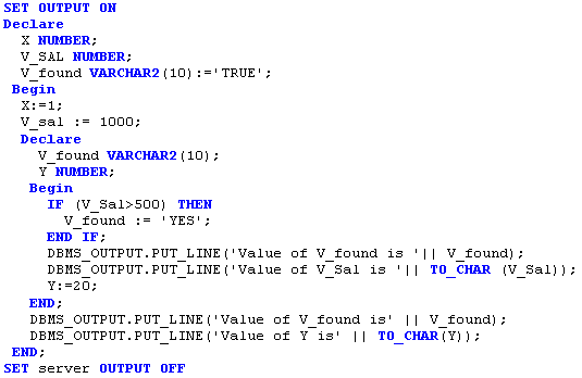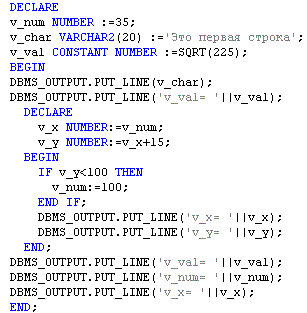 ![]() Каким образом можно присвоить значение переменной v_emp_num из SQL*Plus? ?) ![]() ?) ![]() ?) ![]() ?) ![]() ?) Невозможно присвоить значение переменной, так как она является приватной Вопрос id:94689 Тема/шкала: Применение языка PL/SQL. Ниже приведена подпрограмма: ![]() Какие сообщения будут выведены на экран в результате выполнения этой подпрограммы? ?) Это первая строка v_val= 15 v_x= 100 v_y= 115 v_val= 15 v_num=100 v_x= 35 ?) Это первая строка v_val= 15 v_x= 100 v_y= 115 v_val= 15 v_num= 100 v_x= 100 ?) Это первая строка v_val= 15 v_x= 35 v_y= 50 v_val= 15 v_num= 35 v_x= 35 ?) Сообщение об ошибке ?) Это первая строка v_val= 15 v_x= 35 v_y= 50 v_val= 15 v_num= 100 v_x= 35 Вопрос id:94690 Тема/шкала: Манипулирование данными. Вы создаете таблицу emp, используя следующую команду: ![]() Сколько индексов создает эта команда? ?) 1 ?) 4 ?) 2 ?) 6 Вопрос id:94691 Тема/шкала: Привилегии, роли, совместный доступ к данным. Каким образом можно добавить внешний ключ в поле dept_no в таблице EMP, указывающий на поле id таблицы DEPT? ?) Использовать команду ALTER TABLE в предложении ADD для таблицы DEPT ?) Эта задача невыполнима ?) Использовать команду ALTER TABLE в предложении ADD для таблицы EMP ?) Использовать команду ALTER TABLE в предложении MODIFY для таблицы DEPT ?) Использовать команду ALTER TABLE в предложении MODIFY для таблицы EMP Вопрос id:94692 Тема/шкала: Отладка кода PL/SQL. Какая из приведенных ниже команд отменяет определение переменной подстановки? ?) DEFINE ?) REMOVE ?) CANCEL ?) UNDEFINE ?) ACCEPT Вопрос id:94693 Тема/шкала: Манипулирование данными. Каким будет результат выполнения представленного ниже запроса: ![]() ?) 14 ?) 3 ?) 15 ?) 2 ?) Ошибка Вопрос id:94694 Тема/шкала: Основные синтаксические конструкции языка PL/SQL. Что является результатом выполнения данного фрагмента кода: ![]() ?) Value of V_found is YES Value of V_sal is 1000 Value of V_found is TRUE ?) PLS-00201: identifier ‘V_sal’ must be declared PLS-00201: identifier ‘Y’ must be declared ?) PLS-00201: identifier ‘Y’ must be declared ?) Value of V_found is YES Value of V_sal is 1000 Value of V_found is TRUE Value of Y is 20 ?) Value of V_found is YES Value of V_found is 1000 Value of V_found is TRUE Value of Y is 20 Вопрос id:94695 Тема/шкала: Применение языка PL/SQL. Вы хотите найти сотрудников-однофамильцев. Какой запрос позволит решить поставленную задачу? ?) ![]() ?) ![]() ?) ![]() ?) ![]() ?) ![]() Вопрос id:94696 Тема/шкала: Основные синтаксические конструкции языка PL/SQL. Какое представление содержит текст пользовательской функции? ?) USER_TEXT ?) USER_SOURCE ?) USER_OBJECTS ?) USER_FUNCTIONS ?) USER_PROCEDURES Вопрос id:94697 Тема/шкала: Манипулирование данными. Cоздана таблица EMPLOYEES и теперь необходимо добавить в нее первичный ключ. Какой оператор позволит решить поставленную задачу? ?) ![]() ?) ![]() ?) ![]() ?) ![]() ?) ![]() Вопрос id:94698 Тема/шкала: Основные синтаксические конструкции языка PL/SQL. Какое из утверждений о пакетах является верным? ?) Команда DROP PACKAGE удаляет спецификацию и тело пакета ?) Пакеты могут иметь параметры ?) Пакеты могут быть вложенными ?) Функции объявленные в спецификации пакета не могут быть использованы в SQL операторах ?) Можно удалить функцию из пакета используя команду ALTER PACKAGE Вопрос id:94699 Тема/шкала: Применение языка PL/SQL. Вы выполнили следующие команды: ![]() Каким будет результат выполнения приведенного ниже оператора? ?) 1010 ?) 1035 ?) 1040 ?) 1005 ?) 1020 Вопрос id:94700 Тема/шкала: Манипулирование данными. База данных содержит таблицу EMPLOYEES: