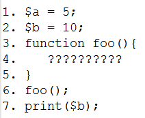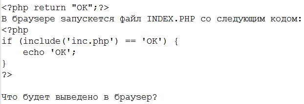 Список вопросов базы знанийОсновы PHP 5.2Вопрос id:13411 Тема/шкала: Управляющие конструкции Что будет выведено в браузер после выполнения кода? ![]() ?) Последовательность чисел от 51 до 100 ?) Последовательность чисел от 1 до 50 ?) Последовательность чисел от 1 до 100 ?) Последовательность чисел от 1 до 100 без числа 50 Вопрос id:13412 Тема/шкала: Файлы и сессии С помощью какой функции можно получить текущее смещение чтения/записи файла? ?) fseek() ?) ftell() ?) fread ?) feof() Вопрос id:13413 Тема/шкала: Файлы и сессии По умолчанию данные сессии хранятся: ?) Нет правильного ответа ?) В виртуальной памяти ?) В общей памяти ?) В базе данных ?) В файле Вопрос id:13414 Тема/шкала: Функции Какая функция должна быть использована на месте "????"? ![]() ?) file_read ?) readdir ?) readfile ?) dir_read Вопрос id:13415 Тема/шкала: Основы языка Результатом $a === $b будет: ![]() ?) Ошибка E_WARNING ?) Ошибка E_ERROR ?) False ?) Ошибка E_PARSE ?) True Вопрос id:13416 Тема/шкала: Функции Функция getdate() возвращает: ?) целое число (integer) ?) число с плавающей точкой (float) ?) массив (array) ?) булев тип (boolean) ?) строку (string) Вопрос id:13417 Тема/шкала: Основы языка Что будет выведено в браузер после выполнения кода? ![]() ?) 234 ?) hello334 ?) hello1234 Вопрос id:13418 Тема/шкала: Основы языка Что будет выведено в браузер после выполнения кода? ![]() ?) Ничего не будет выведено ?) Ошибка E_PARSE ?) 3 ?) 2 ?) 1 Вопрос id:13419 Тема/шкала: Основы языка Что будет выведено в браузер после выполнения кода? ![]() ?) Ничего не будет выведено ?) 111 ?) 123 ?) 000 ?) Ошибка E_ERROR Вопрос id:13420 Тема/шкала: Основы языка Что нужно прописать в строке 4, чтобы вывести в браузере значение 50? Выберите все правильные варианты. ![]() ?) $b = $a * $b; ?) globals($b = $a * $b); ?) $GLOBALS['b'] = $GLOBALS['a'] * $GLOBALS['b']; ?) global $a, $b; $b = $a * $b; Вопрос id:13421 Тема/шкала: Основы языка Файл "INC.PHP" имеет следующее содержимое: ![]() ?) Предупреждение E_WARNING ?) Ошибка E_ERROR ?) Ничего не будет выведено ?) OK Вопрос id:13422 Тема/шкала: Файлы и сессии Необходимо сохранять данные сессии в базе данных. Что для этого надо сделать? ?) Использовать функцию session_set_save_handler() ?) Использовать функцию session_save() ?) Использовать директиву php.ini session_save() ?) Использовать функцию session_save_path() Вопрос id:13423 Тема/шкала: Основы языка Что будет выведено в браузер после выполнения кода? ![]() ?) 20 ?) 11 ?) 10 ?) Ошибка E_PARSE Вопрос id:13424 Тема/шкала: Функции Как вернуть второй параметр переданный в функцию? ?) func_get_args(2) ?) func_num_args(2) ?) func_num_args(1) ?) func_get_arg(1) Вопрос id:13425 Тема/шкала: Основы языка Что будет выведено в браузер после выполнения кода? ![]() ?) Ошибка E_PARSE ?) One ?) Two Вопрос id:13426 Тема/шкала: Массивы и строки Что будет выведено в браузер после выполнения кода? ![]() ?) 3, 5, 7, 5 ?) 2, 4, 6, 4 ?) 1, 2, 3, 4 ?) 3, 5, 7, 4 ?) 3, 5, 7, 9 Вопрос id:13427 Тема/шкала: Основы языка Что будет выведено в браузер после выполнения кода? ![]() ?) 10 ?) Ошибка E_ERROR ?) 50 Вопрос id:13428 Тема/шкала: Основы языка Сколько типов данных поддерживает PHP? ?) 7 ?) 9 ?) 6 ?) 8 Вопрос id:13429 Тема/шкала: Массивы и строки Как обратиться к элементу массива, содержащему значение 'f'? ![]() ?) $array[5] ?) $array[0] ?) $array[4] ?) $array[1] ?) $array[6] Вопрос id:13430 Тема/шкала: Массивы и строки Что будет выведено в браузер после выполнения кода? ![]() ?) Array ( [a] => p [b] => s [c] => c ) ?) 2 ?) Array ( [a] => a [b] => b [c] => c ) ?) Array ( [a] => p [b] => s [c] => c [0] => a [1] => b ) ?) Array ( [0] => p [1] => s [2] => c [3] => a [4] => b ) Вопрос id:13432 Тема/шкала: Массивы и строки Какая функция проверяет, присутствует ли в массиве указанный ключ или индекс? ?) key_exists() ?) array_key_exists() ?) array_value() ?) array_keys() ?) in_array() Вопрос id:13433 Тема/шкала: Основы языка Файл "INC.PHP" имеет следующее содержимое: ![]() ?) 1Привет ?) Привет0 ?