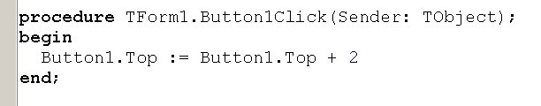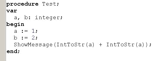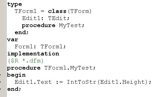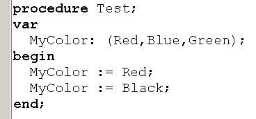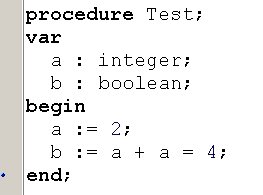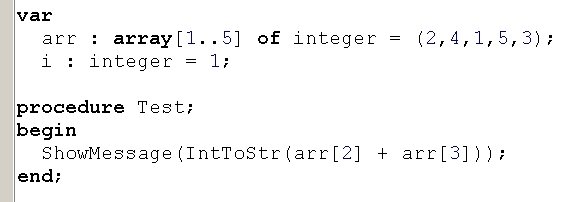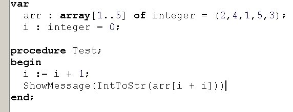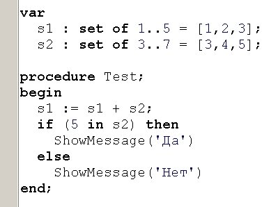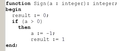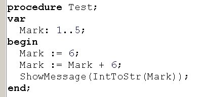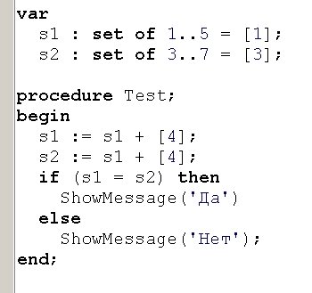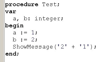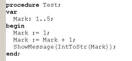 Вопрос id:13896 Тема/шкала: Основы Object Pascal и работа в среде Delphi При передаче по значению, что получает функция на входе? ?) Переменную со значением по-умолчанию ?) Переменную, содержащую значение ?) Результат вычисления выражения Вопрос id:13897 Тема/шкала: Основы Object Pascal и работа в среде Delphi Что произойдет при вызове процедуры Test? ![]() ?) Вызов будет невозможен, ошибка компиляции ?) Появится окно диалога с сообщением «Да» ?) Появится окно диалога с сообщением «Нет» Вопрос id:13898 Тема/шкала: Основы Object Pascal и работа в среде Delphi Что произойдет при вызове процедуры Test? ![]() ?) Вызов будет невозможен, ошибка компиляции ?) Переменная MyColors примет значение Blue ?) Переменная MyColors примет набор значений Red ?) Переменная MyColors примет значение Green Вопрос id:13899 Тема/шкала: Основы Object Pascal и работа в среде Delphi Какое значение вернет функция Test(0)? ![]() ?) -100 ?) -1 ?) 1 Вопрос id:13900 Тема/шкала: Основы Object Pascal и работа в среде Delphi Какой параметр называется фактическим? ?) Используемый при вызове процедуры или функции ?) Используемый в реализации процедуры или функции ?) Значение которого не используется в процедуре или функции Вопрос id:13901 Тема/шкала: Основы Object Pascal и работа в среде Delphi Delphi подходит для создания ?) Приложений Windows ?) Приложений для работы с базой данных Microsoft SQL Server ?) Приложений DOS Вопрос id:13902 Тема/шкала: Основы Object Pascal и работа в среде Delphi При передаче по ссылке, что получает функция на входе? ?) Результат вычисления выражения ?) Переменную со значением по-умолчанию ?) Переменную, содержащую значение Вопрос id:13903 Тема/шкала: Основы Object Pascal и работа в среде Delphi Что произойдет при вызове процедуры Test? ![]() ?) Появится окно диалога с сообщением 5 ?) Появится окно диалога с сообщением 4 ?) Появится окно диалога с сообщением 1 ?) Появится окно диалога с сообщением 3 ?) Появится окно диалога с сообщением 2 Вопрос id:13904 Тема/шкала: Основы Object Pascal и работа в среде Delphi Что произойдет при вызове метода MyTest? ![]() ?) Вызов будет невозможен, у форм (Form) нет метода MyTest ?) В Edit1 отобразится ширина Edit1 ?) В Edit1 отобразится высота Form1 ?) В Edit1 отобразится высота Edit1 Вопрос id:13905 Тема/шкала: Основы Object Pascal и работа в среде Delphi С какого ключевого слова начинается программа на Delphi? ?) unit ?) uses ?) program ?) begin Вопрос id:13906 Тема/шкала: Основы Object Pascal и работа в среде Delphi Как задать возвращаемое функцией значение ?) При помощи оператора (инструкции) return ?) Функция не может возвращать значение ?) При помощи переменной result Вопрос id:13907 Тема/шкала: Основы Object Pascal и работа в среде Delphi Какое из перечисленных утверждений НЕ верно? ?) К значению поля записи можно обратиться, указав имя поля после запятой ?) Запись – это набор переменных разного типа, объединенных именем ?) К значению поля записи можно обратиться, указав имя поля после точки Вопрос id:13908 Тема/шкала: Основы Object Pascal и работа в среде Delphi Зачем используется ключевое слово private? ![]() ?) Чтобы сделать переменные Fx, Fy доступными только в модуле Unit2 ?) Чтобы сделать переменные Fx, Fy доступными только для чтения ?) Чтобы сделать переменные Fx, Fy доступными только в функциях GetX, GetY Вопрос id:13909 Тема/шкала: Основы Object Pascal и работа в среде Delphi Какое значение вернет функция Sign(-100)? ![]() ?) 1 ?) -100 ?) -1 Вопрос id:13910 Тема/шкала: Основы Object Pascal и работа в среде Delphi Как создать элемент графического интерфейса, содержащий текст, который нельзя измененять, но можно взять в буфер обмена ?) Истользовать компонент Label, установить с