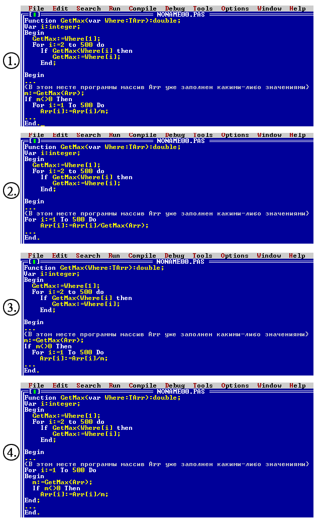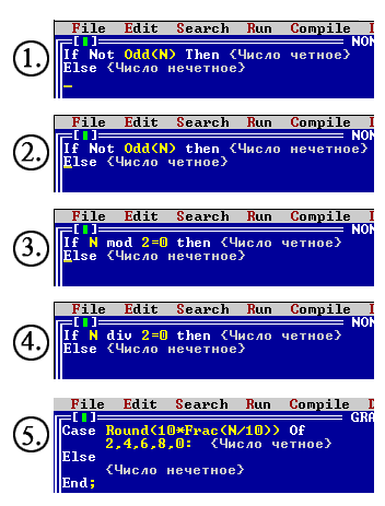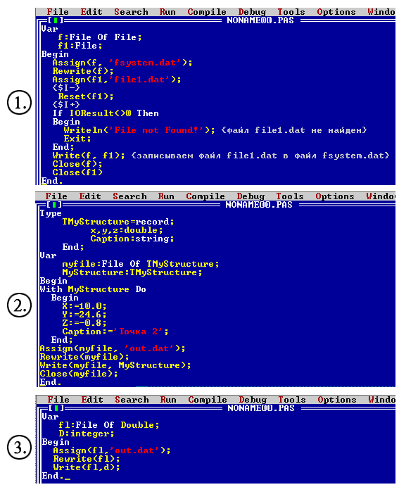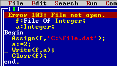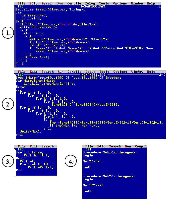 Список вопросов базы знанийПрограммирование на языке PascalВопрос id:14101 Ниже приведено описание файловой переменной. Функция FileSize(f) возвратила значение, равное 4. Чему равен размер файла? ![]() ?) 61 байт ?) 72 байта ?) 76 байт ?) 60 байт ?) 56 байт ?) 4 байта Вопрос id:14102 Сколько итераций выполнит приведенный ниже код? ![]() ?) 3 ?) 7 ?) 10 ?) 1 Вопрос id:14103 все используемые модули должны быть перечислены в разделе, который начинается со служебного слова ?) Procedure ?) Uses ?) Var ?) Begin ?) Type ?) Interface Вопрос id:14104 Укажите правильное описание констант ?) Const Pi2=2*Pi; ?) Var A:integer; Const B=A*A ?) Var Const A=5; ?) Const A=25; B=2*(A+1); Вопрос id:14105 В чем отличие процедуры открытия файла reset от процедуры rewrite? ?) Reset открывает уже существующий файл, а Rewrite используется для создания нового файла ?) Reset используется для открытия файла на чтение, а rewrite – на запись ?) Отличий нет ?) Reset открывает уже существующий файл, а Rewrite создает файл, если он не существует, и перезаписывает его, если он был создан ранее Вопрос id:14106 При помощи какой процедуры можно вывести на экран текст в графическом режиме? Укажите все варианты. ?) DrawFont ?) OutText ?) WriteLn ?) Write ?) OutTextXY Вопрос id:14107 Каков результат выполнения следующей программы? ![]() ?) будет напечатано число 12 ?) будет напечатано число 256 ?) будет напечатано число 4 ?) Выполнение этого кода вызовет ошибку: runtime error 201 – Range Check Error Вопрос id:14108 Как расположены в памяти элементы следующего массива ![]() ?) 4,2,3,1 ?) 1,2,3,4 ?) 1,3,2,4 ?) 1,4,2,3 Вопрос id:14109 Укажите при помощи какой процедуры осуществляется преобразование типов из целого в строковый? ?) Val ?) Convert ?) Eval ?) Str Вопрос id:14110 Какая процедура из модуля CRT изменяет цвет выводимого текста? ?) ChangeColor ?) SetColor ?) TextColor ?) BkColor Вопрос id:14111 Какую функцию выполняет приведенная ниже программа? ![]() ?) Об этом может знать только программист, написавший эту программу ?) Подсчет количества парных пробелов (т.е. двух подряд идущих пробелов) в строке s ?) Подсчет количества слов в строке s ?) Определение самой длинной последовательности пробелов с троке s ?) Подсчет количества пробелов в строке s Вопрос id:14112 Что будет напечатано в результате выполнения следующей программы? ![]() ?) String:1 --SubString1 --SubString2 String:2 --SubString1 --SubString2 String:3 --SubString1 --SubString2 ?) String:1 String:2 String:3 --SubString1 --SubString2 ?) String:1 String:2 String:3 ?) String:1 --SubString1 --SubString2 String:2 String:3 --SubString1 --SubString2 Вопрос id:14113 Переменная х описана в программе как целое число. Какие из операторов недопустимы в этой программе ?) Х:=Х+5 ?) X:=X/2 ?) Х:=5E-10 ?) Х:=1.56 ?) Х:=-100 div X ?) Х:=0030 Вопрос id:14114 Путь к файлу в операционной системе MS DOS – это ... ?) Траектория, по которой двигается программист, для того, чтобы взять диск или другой носитель информации ?) программа, готовая к применению ?) последовательность из имен каталогов или символов "..", разделенных символом "\" ?) специальное место на диске, в котором хранятся все данные о файле Вопрос id:14115 Файл - это ... ?) документ ?) структурированная законченная информация ?) именованная область на внешнем носителе ?) программа, готовая к применению ?) такая прозрачная папочка, в которой обычно носят различные рефераты и курсовые Вопрос id:14116 Укажите наиболее общее, из приведенных ниже, определение переменной ?) Это именованный участок памяти, содержимое которого можно изменять во время выполнения программы ?) Это идентификаторы, описанные в разделах var и в заголовках подпрограмм ?) Это идентификатор, описанный в разделе делараций ?) Это идентификатор, описанный в разделе var Вопро