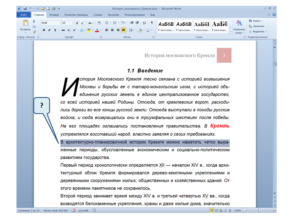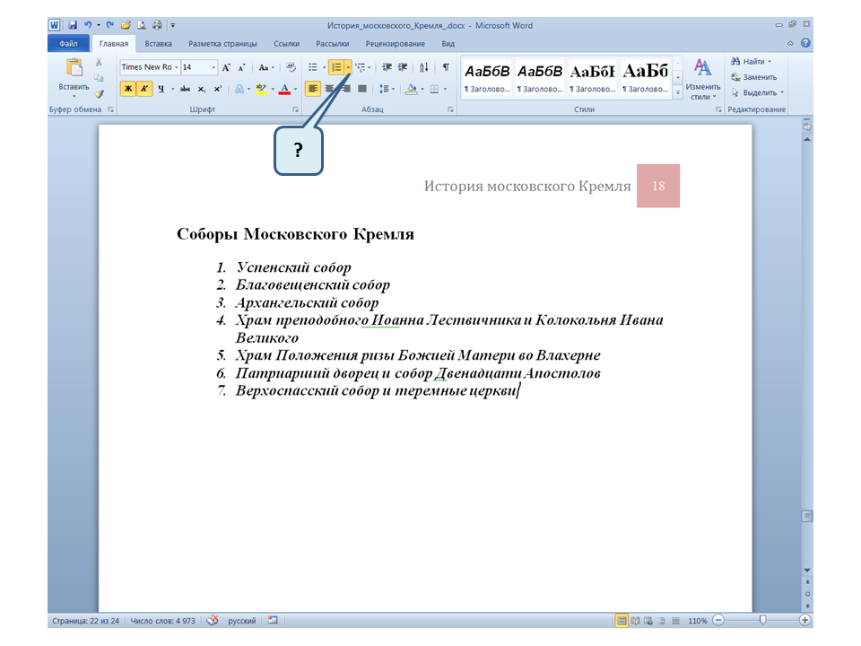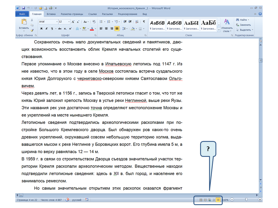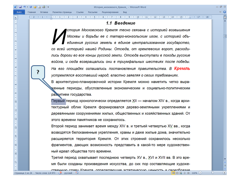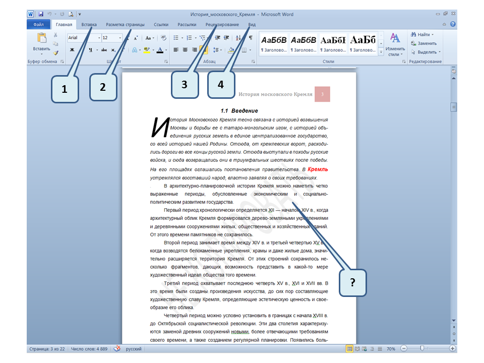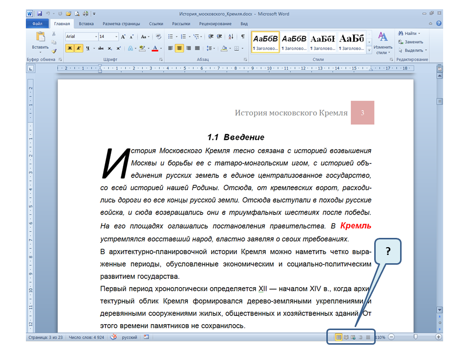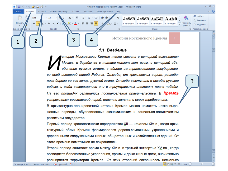 Список вопросов базы знанийПользователь Microsoft Word 2010Вопрос id:14667 В каких случаях для создания оглавления можно использовать указанный способ? ![]() ?) Заголовки в документе оформлены с использованием шрифта «Arial» ?) Заголовки в документе должны начинаться с новой страницы ?) Заголовки в документе оформлены с использованием стилей «Заголовок 1», «Заголовок 2» и т.д. ?) Оформление заголовков отличается от оформления основного текста документа Вопрос id:14668 Что необходимо сделать, чтобы в области навигации отображались заголовки документа? ![]() ?) При оформлении заголовков использовать стили ?) При оформлении заголовков использовать специальные символы ?) При оформлении заголовков использовать эффект Анимации ?) При оформлении заголовков использовать начертание полужирный курсив Вопрос id:14669 В документе уже вставлен верхний колонтитул, что произойдет при вставке нового верхнего колонтитула? ![]() ?) Откроется диалоговое окно с запросом на замену верхнего колонтитула ?) Новый колонтитул заменит старый ?) В документ будет вставлено два варианта колонтитулов ?) Пока старый колонтитул не будет удален, новый не вставиться Вопрос id:14670 Что произойдет если на Панели быстрого доступа нажать значок «Быстрая печать»? ![]() ?) Распечатается только текст, картинки и таблицы распечатываться не будут ?) Весь документ распечатается полностью в одном экземпляре ?) Распечатается текущая страница, т.е. страница, которая видна на экране ?) Появиться запрос о режиме печати Вопрос id:14671 Какой вкладкой следует воспользоваться для расстановки переносов в документе? ![]() ?) Главная (1) ?) Вставка (2) ?) Разметка страницы (3) ?) Вид (4) Вопрос id:14672 Каким элементом горизонтальной линейки следует воспользоваться для установки отступа слева первой строки абзаца? ![]() ?) 1 ?) 2 ?) 4 ?) 3 Вопрос id:14673 Для каких целей используется указанный элемент? ![]() ?) Для установки интервалов между символами текста ?) Для установки интервалов между строками в тексте ?) Для установки интервалов между словами в предложении ?) Для установки интервалов между абзацами Вопрос id:14674 Что номеруют нумерованные списки? ![]() ?) Слова в предложении ?) Страницы в документе ?) Абзацы в тексте ?) Строки в абзаце Вопрос id:14675 В приведенном предложении слово подчеркнуто красной волнистой линией, в чем причина и как убрать это подчеркивание? ![]() ?) В этом слове грамматическая ошибка, нужно исправить ошибку ?) Один из символов в этом слове написан на английском языке, нужно исправить символ ?) Для этого слова выбрано оформление - нижняя граница, линия красного цвета, нужно очистить формат ?) Для этого слова выбрано начертание Подчёркнутый, линия красного цвета, нужно очистить формат Вопрос id:14676 Как выделить весь текст в документе? ![]() ?) Трижды щелкнуть на левом поле напротив любого абзаца текста левой клавишей мышки ?) Воспользоваться вкладкой Главная ?) Трижды щелкнуть на правом поле напротив любого абзаца текста левой клавишей мышки ?) Воспользоваться вкладкой Файл Вопрос id:14677 Для каких целей можно использовать этот значок в окне вкладки Файл? ![]() ?) Чтобы этот документ не смог открыть другой пользователь ?) Для удаления документа из этого списка ?) Для закрепления документа в этом списке ?) Чтобы этот документ открывался в режиме "только чтение" Вопрос id:14678 Какой режим просмотра документа изображен на рисунке? ![]() ?) Чтение ?) Разметка ст