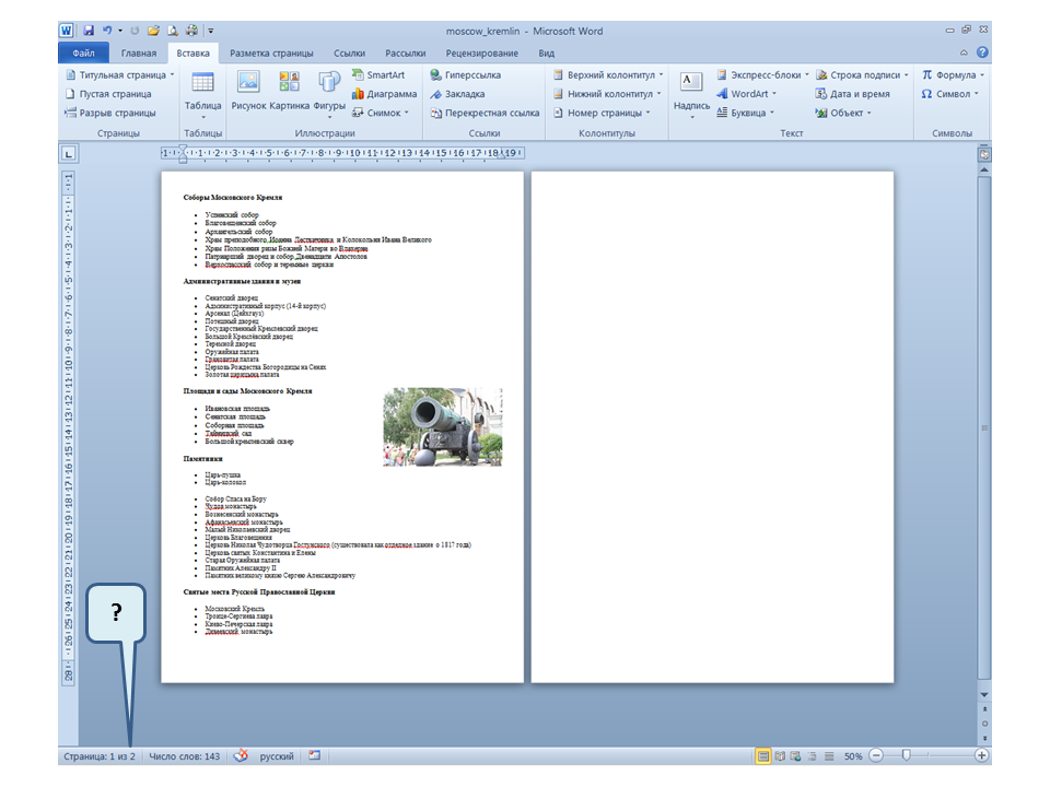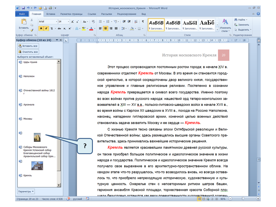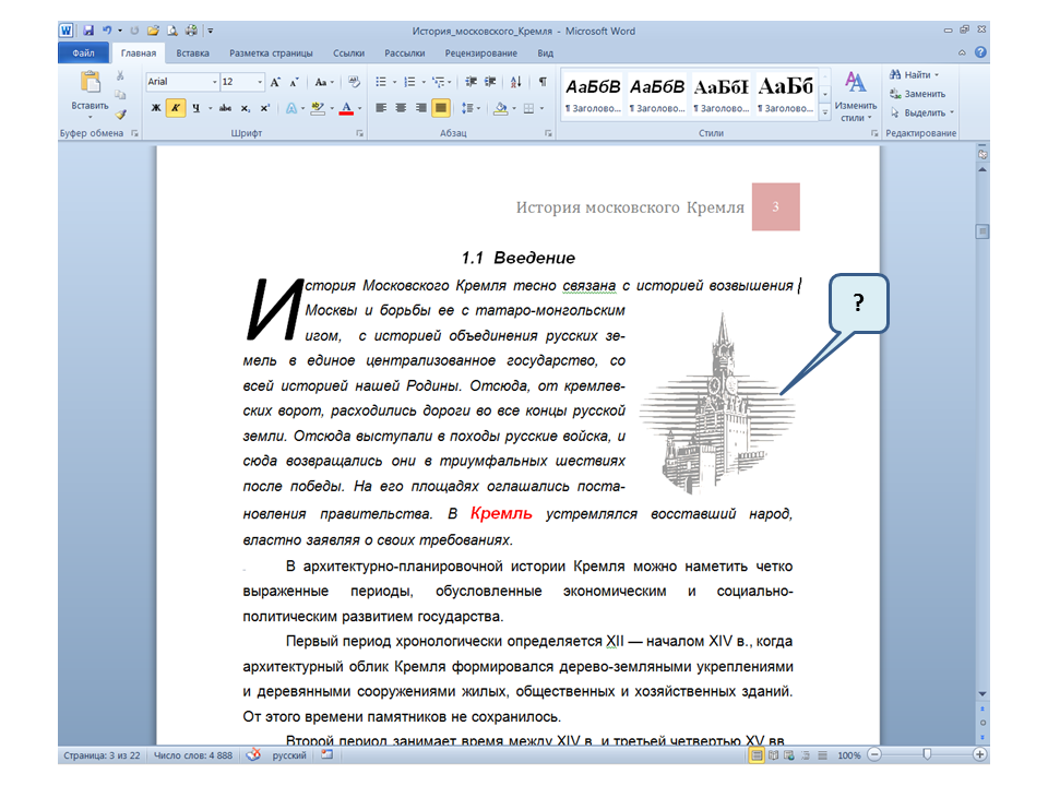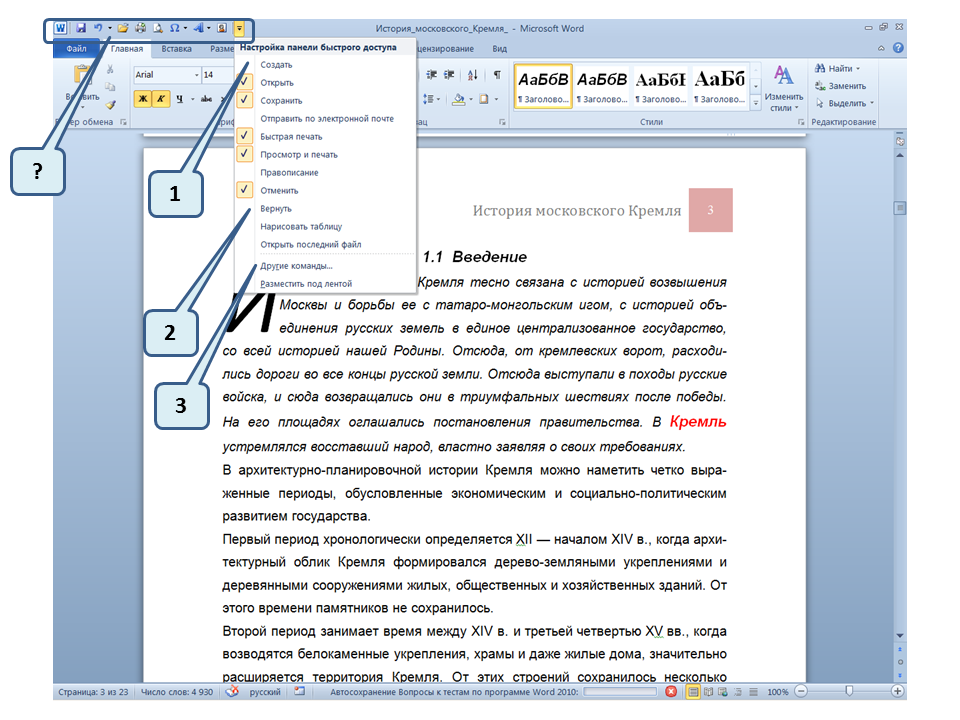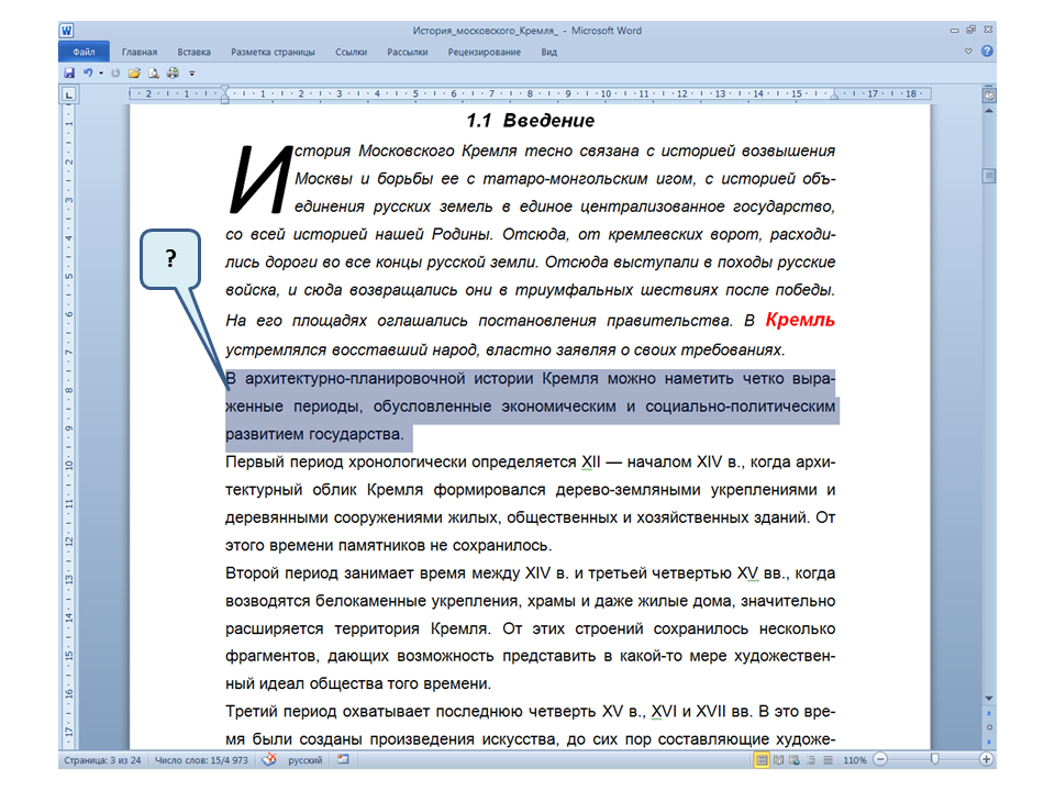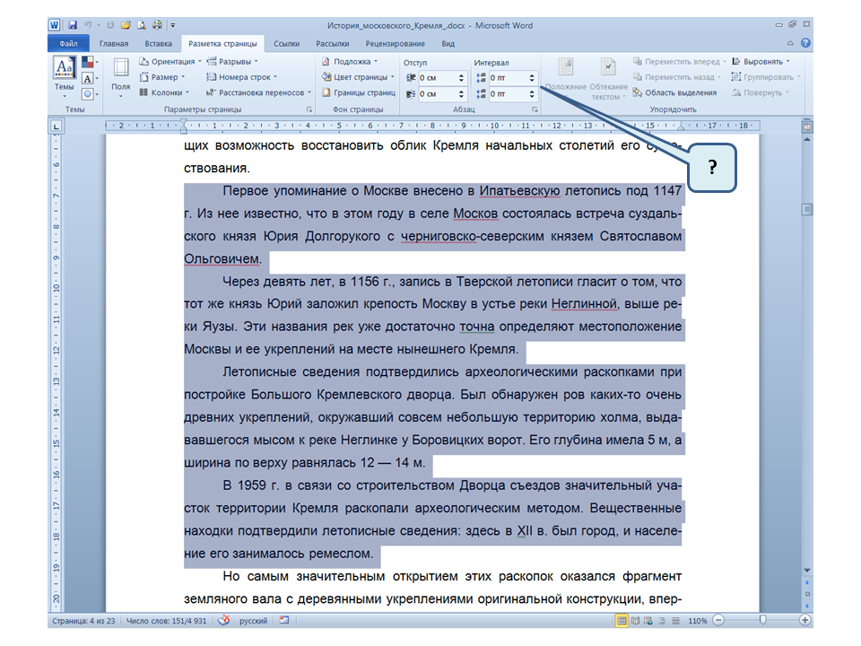 Список вопросов базы знанийПользователь Microsoft Word 2010Вопрос id:14667 В каких случаях для создания оглавления можно использовать указанный способ? ![]() ?) Заголовки в документе оформлены с использованием шрифта «Arial» ?) Заголовки в документе должны начинаться с новой страницы ?) Заголовки в документе оформлены с использованием стилей «Заголовок 1», «Заголовок 2» и т.д. ?) Оформление заголовков отличается от оформления основного текста документа Вопрос id:14668 Что необходимо сделать, чтобы в области навигации отображались заголовки документа? ![]() ?) При оформлении заголовков использовать стили ?) При оформлении заголовков использовать специальные символы ?) При оформлении заголовков использовать эффект Анимации ?) При оформлении заголовков использовать начертание полужирный курсив Вопрос id:14669 В документе уже вставлен верхний колонтитул, что произойдет при вставке нового верхнего колонтитула? ![]() ?) Откроется диалоговое окно с запросом на замену верхнего колонтитула ?) Новый колонтитул заменит старый ?) В документ будет вставлено два варианта колонтитулов ?) Пока старый колонтитул не будет удален, новый не вставиться Вопрос id:14670 Что произойдет если на Панели быстрого доступа нажать значок «Быстрая печать»? ![]() ?) Распечатается только текст, картинки и таблицы распечатываться не будут ?) Весь документ распечатается полностью в одном экземпляре ?) Распечатается текущая страница, т.е. страница, которая видна на экране ?) Появиться запрос о режиме печати Вопрос id:14671 Какой вкладкой следует воспользоваться для расстановки переносов в документе? ![]() ?) Главная (1) ?) Вставка (2) ?) Разметка страницы (3) ?) Вид (4) Вопрос id:14672 Каким элементом горизонтальной линейки следует воспользоваться для установки отступа слева первой строки абзаца? ![]() ?) 1 ?) 2 ?) 4 ?) 3 Вопрос id:14673 Для каких целей используется указанный элемент? ![]() ?) Для установки интервалов между символами текста ?) Для установки интервалов между строками в тексте ?) Для установки интервалов между словами в предложении ?) Для установки интервалов между абзацами Вопрос id:14674 Что номеруют нумерованные списки? ![]() ?) Слова в предложении ?) Страницы в документе ?) Абзацы в тексте ?) Строки в абзаце Вопрос id:14675 В приведенном предложении слово подчеркнуто красной волнистой линией, в чем причина и как убрать это подчеркивание? ![]() ?) В этом слове грамматическая ошибка, нужно исправить ошибку ?) Один из символов в этом слове написан на английском языке, нужно исправить символ ?) Для этого слова выбрано оформление - нижняя граница, линия красного цвета, нужно очистить формат ?) Для этого слова выбрано начертание Подчёркнутый, линия красного цвета, нужно очистить формат Вопрос id:14676 Как выделить весь текст в документе? ![]() ?) Трижды щелкнуть на левом поле напротив любого абзаца текста левой клавишей мышки ?) Воспользоваться вкладкой Главная ?) Трижды щелкнуть на правом поле напротив любого абзаца текста левой клавишей мышки ?) Воспользоваться вкладкой Файл Вопрос id:14677 Для каких целей можно использовать этот значок в окне вкладки Файл? ![]() ?) Чтобы этот документ не смог открыть другой пользователь ?) Для удаления документа из этого списка ?) Для закрепления документа в этом списке ?) Чтобы этот документ открывался в режиме "только чтение" Вопрос id:14678 Какой режим просмотра документа изображен на рисунке? ![]() ?) Чтение ?) Разметка ст