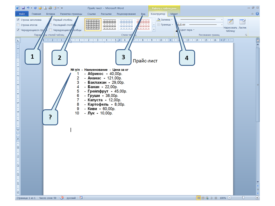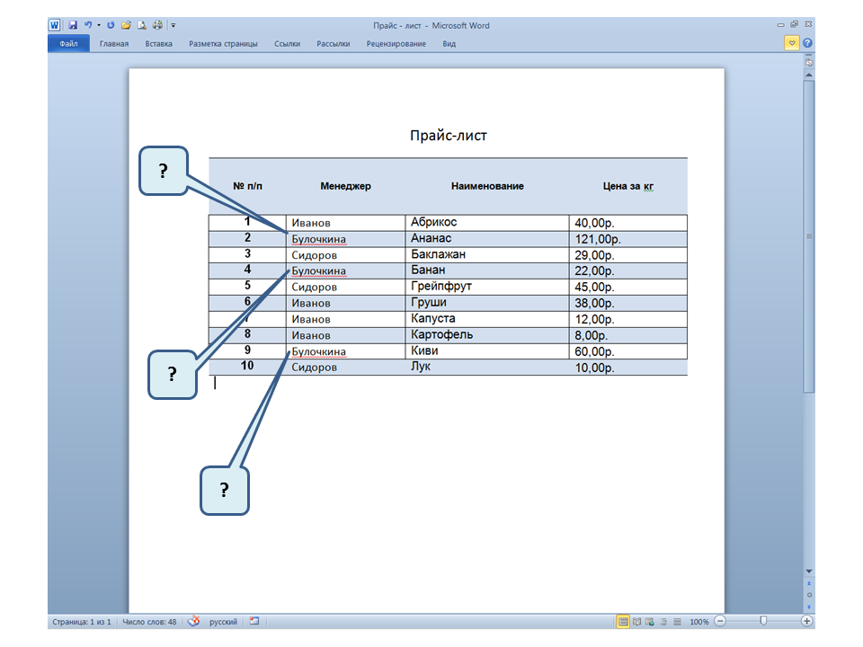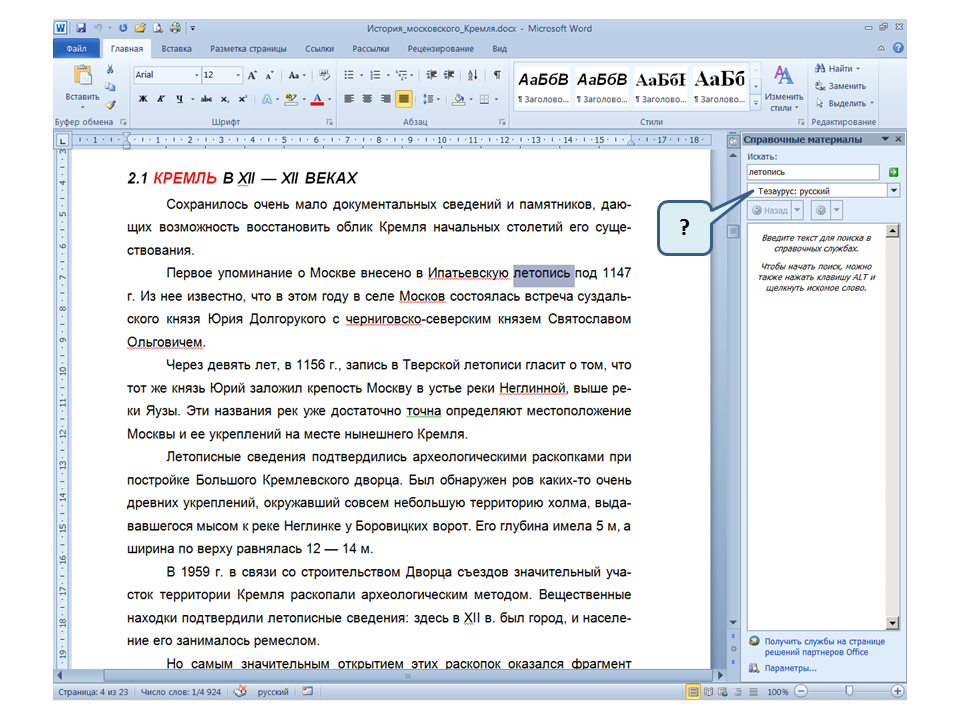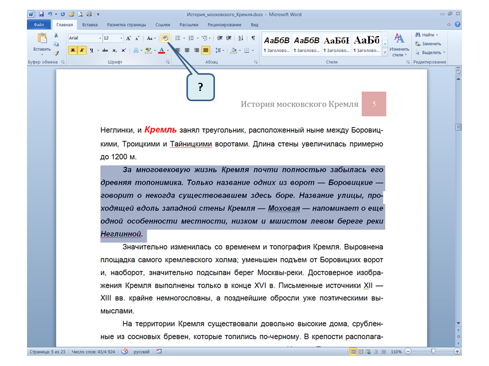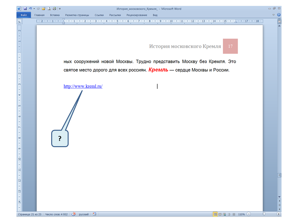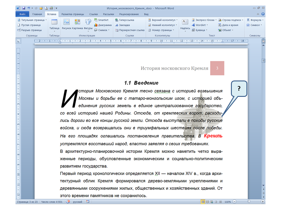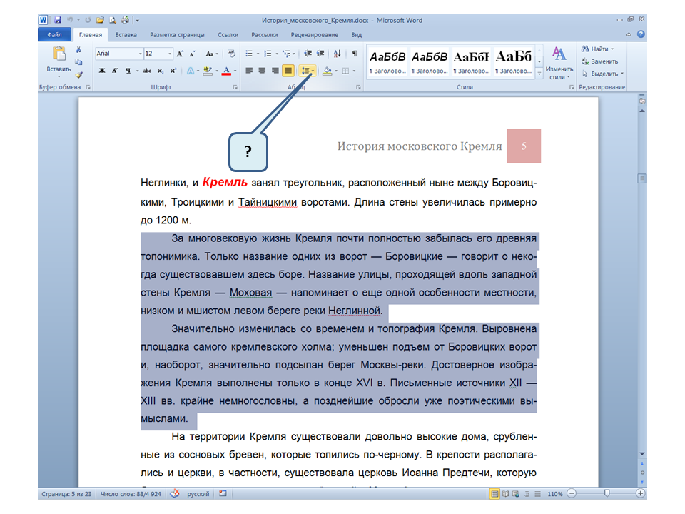Список вопросов базы знанийПользователь Microsoft Word 2010Вопрос id:14667 В каких случаях для создания оглавления можно использовать указанный способ? ![]() ?) Заголовки в документе оформлены с использованием шрифта «Arial» ?) Заголовки в документе должны начинаться с новой страницы ?) Заголовки в документе оформлены с использованием стилей «Заголовок 1», «Заголовок 2» и т.д. ?) Оформление заголовков отличается от оформления основного текста документа Вопрос id:14668 Что необходимо сделать, чтобы в области навигации отображались заголовки документа? ![]() ?) При оформлении заголовков использовать стили ?) При оформлении заголовков использовать специальные символы ?) При оформлении заголовков использовать эффект Анимации ?) При оформлении заголовков использовать начертание полужирный курсив Вопрос id:14669 В документе уже вставлен верхний колонтитул, что произойдет при вставке нового верхнего колонтитула? ![]() ?) Откроется диалоговое окно с запросом на замену верхнего колонтитула ?) Новый колонтитул заменит старый ?) В документ будет вставлено два варианта колонтитулов ?) Пока старый колонтитул не будет удален, новый не вставиться Вопрос id:14670 Что произойдет если на Панели быстрого доступа нажать значок «Быстрая печать»? ![]() ?) Распечатается только текст, картинки и таблицы распечатываться не будут ?) Весь документ распечатается полностью в одном экземпляре ?) Распечатается текущая страница, т.е. страница, которая видна на экране ?) Появиться запрос о режиме печати Вопрос id:14671 Какой вкладкой следует воспользоваться для расстановки переносов в документе? ![]() ?) Главная (1) ?) Вставка (2) ?) Разметка страницы (3) ?) Вид (4) Вопрос id:14672 Каким элементом горизонтальной линейки следует воспользоваться для установки отступа слева первой строки абзаца? ![]() ?) 1 ?) 2 ?) 4 ?) 3 Вопрос id:14673 Для каких целей используется указанный элемент? ![]() ?) Для установки интервалов между символами текста ?) Для установки интервалов между строками в тексте ?) Для установки интервалов между словами в предложении ?) Для установки интервалов между абзацами Вопрос id:14674 Что номеруют нумерованные списки? ![]() ?) Слова в предложении ?) Страницы в документе ?) Абзацы в тексте ?) Строки в абзаце Вопрос id:14675 В приведенном предложении слово подчеркнуто красной волнистой линией, в чем причина и как убрать это подчеркивание? ![]() ?) В этом слове грамматическая ошибка, нужно исправить ошибку ?) Один из символов в этом слове написан на английском языке, нужно исправить символ ?) Для этого слова выбрано оформление - нижняя граница, линия красного цвета, нужно очистить формат ?) Для этого слова выбрано начертание Подчёркнутый, линия красного цвета, нужно очистить формат Вопрос id:14676 Как выделить весь текст в документе? ![]() ?) Трижды щелкнуть на левом поле напротив любого абзаца текста левой клавишей мышки ?) Воспользоваться вкладкой Главная ?) Трижды щелкнуть на правом поле напротив любого абзаца текста левой клавишей мышки ?) Воспользоваться вкладкой Файл Вопрос id:14677 Для каких целей можно использовать этот значок в окне вкладки Файл? ![]() ?) Чтобы этот документ не смог открыть другой пользователь ?) Для удаления документа из этого списка ?) Для закрепления документа в этом списке ?) Чтобы этот документ открывался в режиме "только чтение" Вопрос id:14678 Какой режим просмотра документа изображен на рисунке? ![]() ?) Чтение ?) Разметка ст