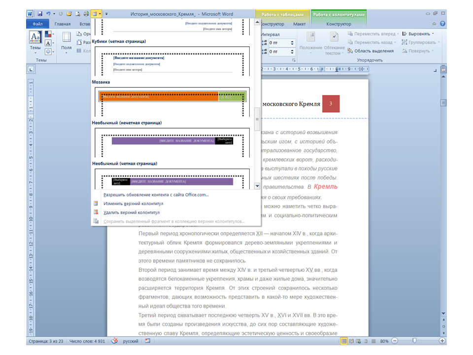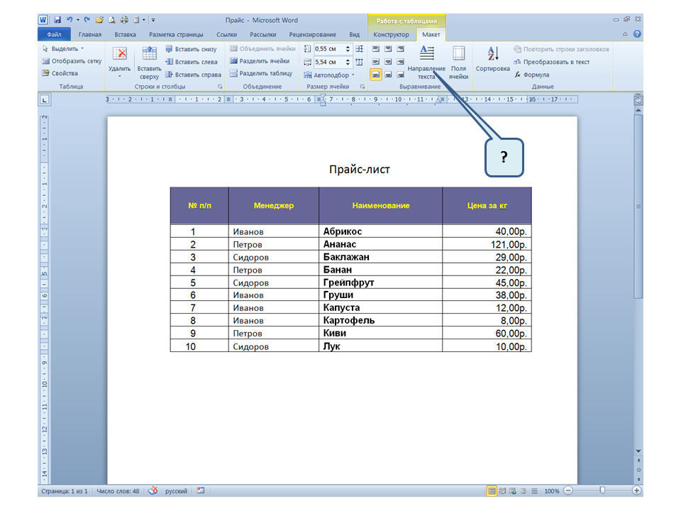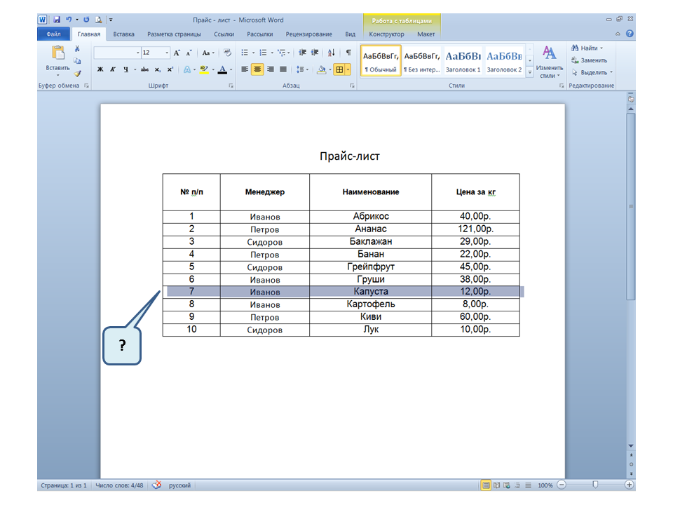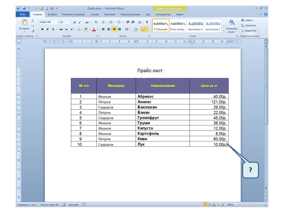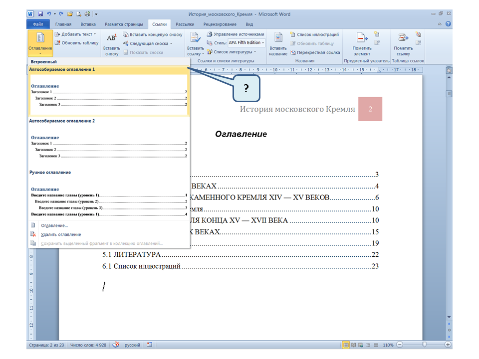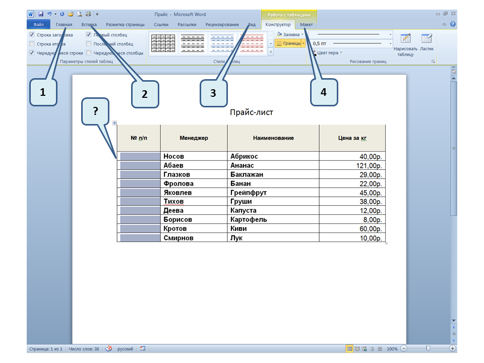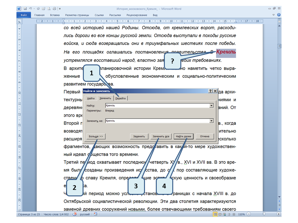 Список вопросов базы знанийПользователь Microsoft Word 2010Вопрос id:14667 В каких случаях для создания оглавления можно использовать указанный способ? ![]() ?) Заголовки в документе оформлены с использованием шрифта «Arial» ?) Заголовки в документе должны начинаться с новой страницы ?) Заголовки в документе оформлены с использованием стилей «Заголовок 1», «Заголовок 2» и т.д. ?) Оформление заголовков отличается от оформления основного текста документа Вопрос id:14668 Что необходимо сделать, чтобы в области навигации отображались заголовки документа? ![]() ?) При оформлении заголовков использовать стили ?) При оформлении заголовков использовать специальные символы ?) При оформлении заголовков использовать эффект Анимации ?) При оформлении заголовков использовать начертание полужирный курсив Вопрос id:14669 В документе уже вставлен верхний колонтитул, что произойдет при вставке нового верхнего колонтитула? ![]() ?) Откроется диалоговое окно с запросом на замену верхнего колонтитула ?) Новый колонтитул заменит старый ?) В документ будет вставлено два варианта колонтитулов ?) Пока старый колонтитул не будет удален, новый не вставиться Вопрос id:14670 Что произойдет если на Панели быстрого доступа нажать значок «Быстрая печать»? ![]() ?) Распечатается только текст, картинки и таблицы распечатываться не будут ?) Весь документ распечатается полностью в одном экземпляре ?) Распечатается текущая страница, т.е. страница, которая видна на экране ?) Появиться запрос о режиме печати Вопрос id:14671 Какой вкладкой следует воспользоваться для расстановки переносов в документе? ![]() ?) Главная (1) ?) Вставка (2) ?) Разметка страницы (3) ?) Вид (4) Вопрос id:14672 Каким элементом горизонтальной линейки следует воспользоваться для установки отступа слева первой строки абзаца? ![]() ?) 1 ?) 2 ?) 4 ?) 3 Вопрос id:14673 Для каких целей используется указанный элемент? ![]() ?) Для установки интервалов между символами текста ?) Для установки интервалов между строками в тексте ?) Для установки интервалов между словами в предложении ?) Для установки интервалов между абзацами Вопрос id:14674 Что номеруют нумерованные списки? ![]() ?) Слова в предложении ?) Страницы в документе ?) Абзацы в тексте ?) Строки в абзаце Вопрос id:14675 В приведенном предложении слово подчеркнуто красной волнистой линией, в чем причина и как убрать это подчеркивание? ![]() ?) В этом слове грамматическая ошибка, нужно исправить ошибку ?) Один из символов в этом слове написан на английском языке, нужно исправить символ ?) Для этого слова выбрано оформление - нижняя граница, линия красного цвета, нужно очистить формат ?) Для этого слова выбрано начертание Подчёркнутый, линия красного цвета, нужно очистить формат Вопрос id:14676 Как выделить весь текст в документе? ![]() ?) Трижды щелкнуть на левом поле напротив любого абзаца текста левой клавишей мышки ?) Воспользоваться вкладкой Главная ?) Трижды щелкнуть на правом поле напротив любого абзаца текста левой клавишей мышки ?) Воспользоваться вкладкой Файл Вопрос id:14677 Для каких целей можно использовать этот значок в окне вкладки Файл? ![]() ?) Чтобы этот документ не смог открыть другой пользователь ?) Для удаления документа из этого списка ?) Для закрепления документа в этом списке ?) Чтобы этот документ открывался в режиме "только чтение" Вопрос id:14678 Какой режим просмотра документа изображен на рисунке? ![]() ?) Чтение ?) Разметка ст