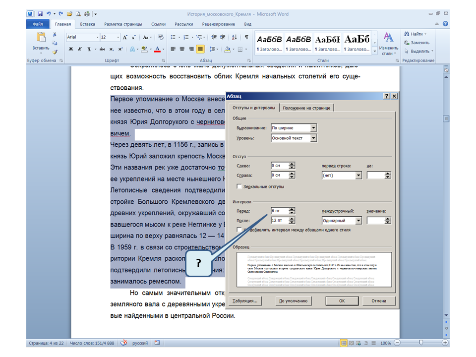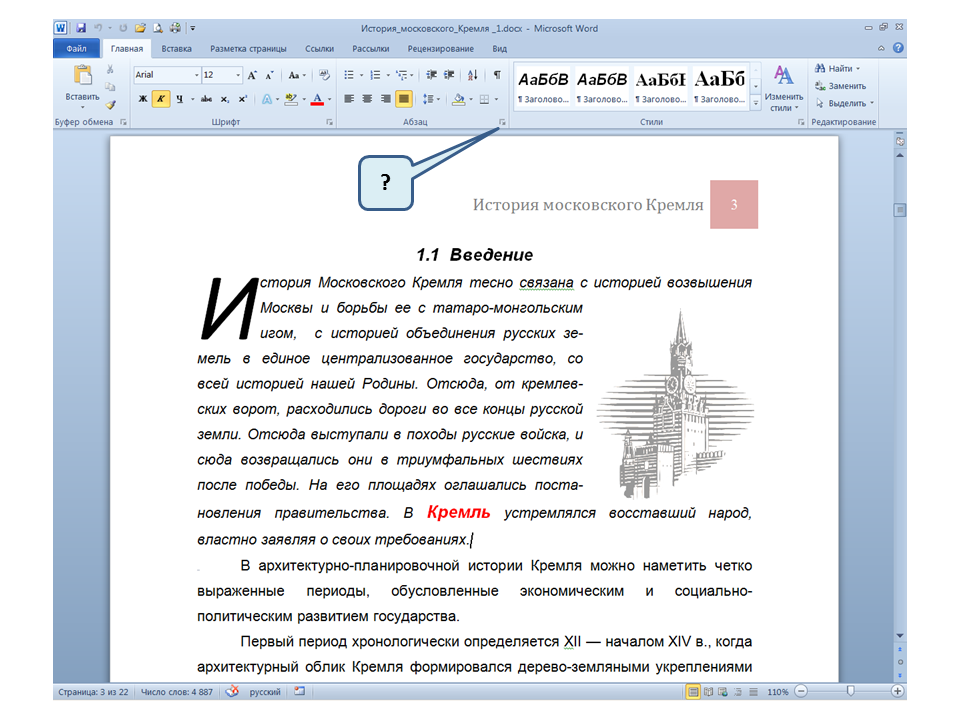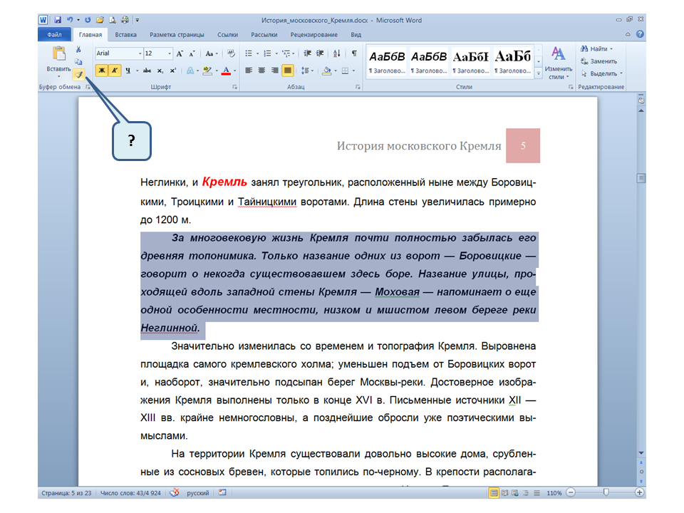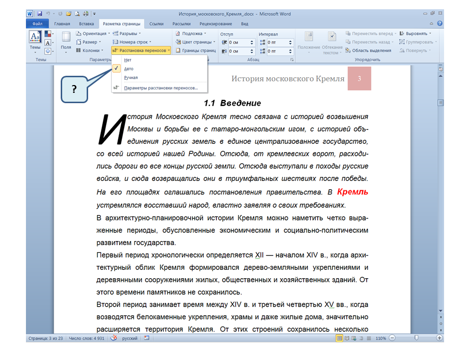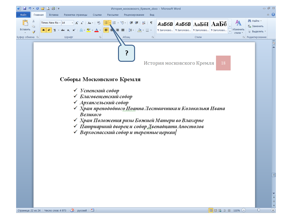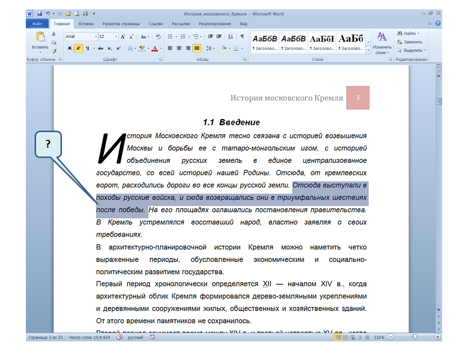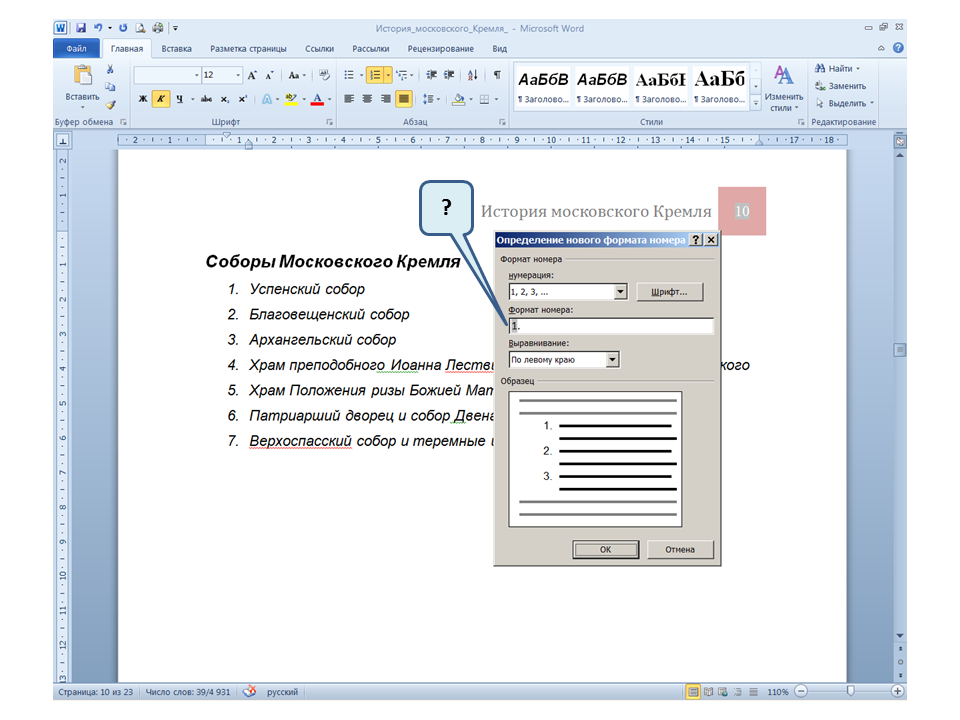 Список вопросов базы знанийПользователь Microsoft Word 2010Вопрос id:14717 Каким элементом горизонтальной линейки следует воспользоваться для установки отступа слева всех строк абзаца, кроме первой строки? ![]() ?) 2 ?) 1 ?) 4 ?) 3 Вопрос id:14718 Каким элементом следует воспользоваться, чтобы отобразить линейку? ![]() ?) Перейти во вкладку Вставка (2) ?) Перейти во вкладку Разметка страницы (1) ?) Воспользоваться значком (4) ?) Перейти во вкладку Вид (3) Вопрос id:14719 Для работы Вы часто используете вставку в документ символов, которых нет на клавиатуре, как ускорить работу, чтобы не переходить на вкладку Вставку? ![]() ?) Нажав последовательно клавиши Alt ⇒ С ⇒ З ?) Добавить значок на Панель быстрого доступа ?) Добавить значок на мини-панель ?) Перетащить значок на вкладку Главная Вопрос id:14720 В каких единицах измеряется размер шрифта в Word? ![]() ?) в миллиметрах ?) в пунктах ?) в сантиметрах ?) в дюймах Вопрос id:14721 В документе установлен автоматический перенос слов, каким элементом следует воспользоваться, чтобы в выделенном абзаце убрать перенос слов? ![]() ?) 1 ?) 3 ?) 2 ?) Это сделать нельзя Вопрос id:14722 В документ вставлена таблица, которая располагается на двух листах, какую Вкладку следует использовать, чтобы каждый лист начинался с заголовка таблицы? ![]() ?) Макет (3) ?) Вставка (1) ?) Конструктор (2) ?) Такой возможности нет, и заголовок нужно копировать Вопрос id:14723 Для приведенной таблицы установлен режим автоподбора (Автоподбор по содержимому). Что произойдет при изменении ориентации страницы (книжная на альбомную)? ![]() ?) Ширина столбцов автоматически измениться ?) Размеры таблицы не изменяться ?) Высота строк и ширина столбцов автоматически измениться ?) Высота строк автоматически измениться Вопрос id:14724 Каким элементом во вкладке Формат можно воспользоваться, чтобы преобразовать вставленный элемент WordArt в такой вид? ![]() ?) 4 ?) 1 ?) 3 ?) 2 Вопрос id:14725 Какой вкладкой следует воспользоваться для разбивки текста на несколько колонок? ![]() ?) Вставка (1) ?) Вид (4) ?) Разметка страницы (2) ?) Рецензирование (3) Вопрос id:14726 При попытке ввести указанный размер шрифта для выделенного абзаца, выдается сообщение «Указано неверное число», в чем причина ошибки? ![]() ?) Размер шрифта должен быть кратным 0,5 ?) Размер шрифта может быть только целым числом ?) Размер шрифта можно выбирать только из списка ?) Такой размер можно набрать, только используя мини-панель Вопрос id:14727 Какой вкладкой следует воспользоваться для вставки сносок в документе? ![]() ?) Главная (1) ?) Ссылки (4) ?) Разметка страницы (3) ?) Вставка (2) Вопрос id:14728 Что можно установить с помощью этого интервала? ![]() ?) Расстояние между абзацами текста ?) Расстояние между строками текста ?) Расстояние между словами текста ?) Расстояние между символами текста Вопрос id:14729 Для каких целей можно использовать указанный элемент? ![]() ?) Для увеличения и уменьшения левого отступа абзаца ?) Для установки отступа первой строки абзаца ?) Для уменьшения левого и правого отступов абзаца ?) Для увеличения левого и правого отступов абзаца Вопрос id:14730 Каким элементом горизонтальной линейки следует воспользоваться для установки отступа слева всех строк абзаца? ![]() ?) 3 ?) 4 ?) 2 ?) 1 Вопрос id:14731 После оформления абзаца (1) вы хотите применить это форматирование к нескольким абзацам (2) и (3) с использованием значка "Формат по образцу", что для этого нужно сделать? ![]() ?) Сделать один щелчок левой клавиш