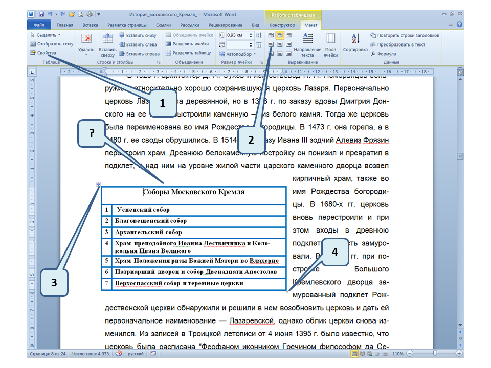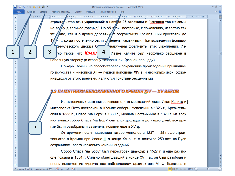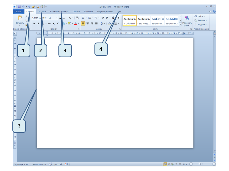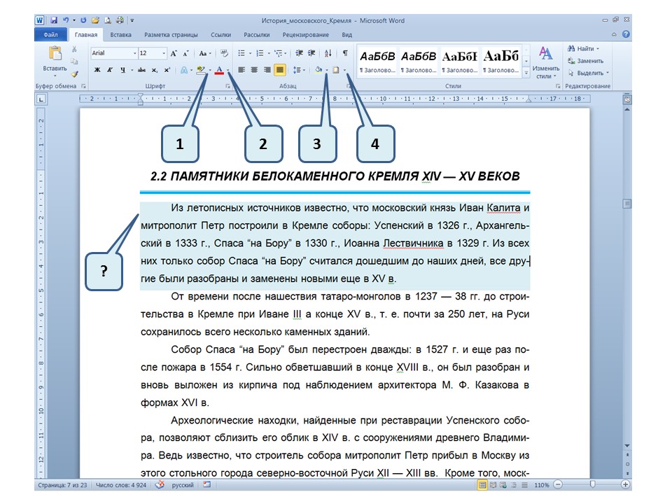 ![]() ?) Строгий ?) Заголовок 1, Заголовок 2 и т.д. ?) Название ?) Обычный Вопрос id:14736 Каким элементом во вкладке Формат можно воспользоваться, чтобы преобразовать вставленный элемент WordArt в такой вид? ![]() ?) 4 ?) 3 ?) 1 ?) 2 Вопрос id:14737 Вы хотите изменить ширину столбца в таблице, буксируя границу, какую клавишу нужно держать, чтобы на линейке отобразились размеры ширины столбца? ![]() ?) Backspace ?) Tab ?) Alt ?) Ctrl Вопрос id:14738 Какой вкладкой следует воспользоваться, чтобы объединить ячейки в первой строке таблицы? ![]() ?) Макет (4) ?) Конструктор (3) ?) Вставка (2) ?) Главная (1) Вопрос id:14739 Что можно установить с помощью этого интервала? ![]() ?) Расстояние между абзацами текста ?) Расстояние между строками текста ?) Расстояние между словами текста ?) Расстояние между символами текста Вопрос id:14740 Каким элементом горизонтальной линейки следует воспользоваться для установки отступа справа всех строк абзаца? ![]() ?) 3 ?) 4 ?) 2 ?) 1 Вопрос id:14741 Какой вкладкой следует воспользоваться, чтобы распечатать текущую страницу? ![]() ?) 4 ?) 2 ?) 3 ?) 1 Вопрос id:14742 Каким элементом следует воспользоваться, чтобы начать абзац с новой страницы? ![]() ?) 1 ?) 3 ?) 2 ?) Это сделать нельзя Вопрос id:14743 Как называется указанный элемент интерфейса MO Word 2010? ![]() ?) Панель форматирования ?) Панель навигации ?) Лента ?) Стандартная панель Вопрос id:14744 Какой вкладкой следует воспользоваться для изменения ориентации страницы? ![]() ?) Вид (4) ?) Вставка (2) ?) Разметка страницы (3) ?) Главная (1) Вопрос id:14745 Какой режим просмотра документа изображен на рисунке? ![]() ?) Структура ?) Разметка страницы ?) Чтение ?) Черновик Вопрос id:14746 Как выделить одно предложение в тексте? ![]() ?) Дважды щелкнуть левой клавишей мышки в любом месте предложения при нажатой клавише CTRL ?) Щелкнуть левой клавишей мышки в любом месте предложения при нажатой клавише Alt ?) Щелкнуть левой клавишей мышки в любом месте предложения при нажатой клавише CTRL ?) Щелкнуть левой клавишей мышки в любом месте предложения при нажатой клавише Shift Вопрос id:14747 Какой вкладкой следует воспользоваться для применения к выделенному тексту визуальных эффектов, таких как тень, свечение или отражение? ![]() ?) Вид (4) ?) Разметка страницы (3) ?) Вставка (2) ?) Главная (1) Вопрос id:14748 Что следует сделать для перехода к редактированию и оформлению ранее созданного колонтитула? ![]() ?) Колонтитул изменить нельзя ?) Скрыть Ленту ?) Дважды щелкнуть левой кнопкой мышки по колонтитулу ?) Перейти в режим Черновик Вопрос id:14749 В каких пределах можно изменять размер шрифта Word? ![]() ?) 1 - 500 пунктов ?) 8 - 72 пунктов ?) 1 – 1638 пунктов ?) 1 – 1000 пунктов Вопрос id:14750 Как называется указанный элемент интерфейса MO Word 2010? ![]() ?) Панель навигации ?) Стандартная панель ?) Панель форматирования ?) Панель быстрого доступа Вопрос id:14751 Каким элементом следует воспользоваться, чтобы фамилии в столбце "Менеджер" выстроились по алфавиту? ![]() ?) 3 ?) 4 ?) 2 ?) 1 Вопрос id:14752 Сколько фрагментов можно одновременно разместить в области Буфера обмена МО Word 2010? ![]() ?) 12 ?) 24 ?) 1 ?) Неограниченно Вопрос id:14753 Как с помощью указателя мышки повернуть рисунок вокруг оси? ![]() ?) Перетащить, ухватившись за любую часть рисунка, кроме маркеров ?) Перетащить, ухватившись за любой маркер (2) ?) Перетащить, ухватившись за маркер (1) ?) Перетащить, ухватившись за любой маркер (3) Вопрос id:14754 Для каких целей предназначен этот элемент на ленте? ![]() ?) Для открытия диалогового окна «Абзац» ?) Для свертыва