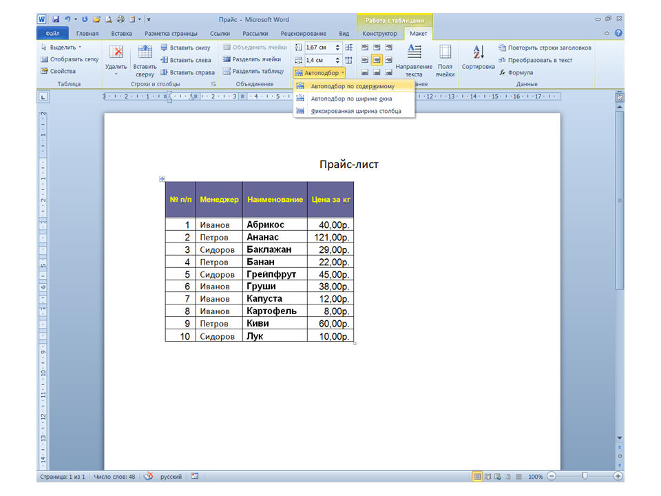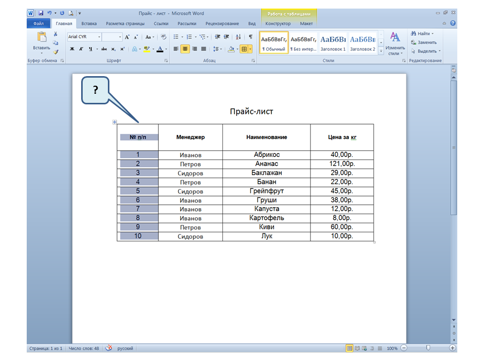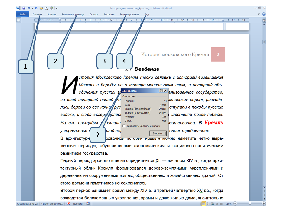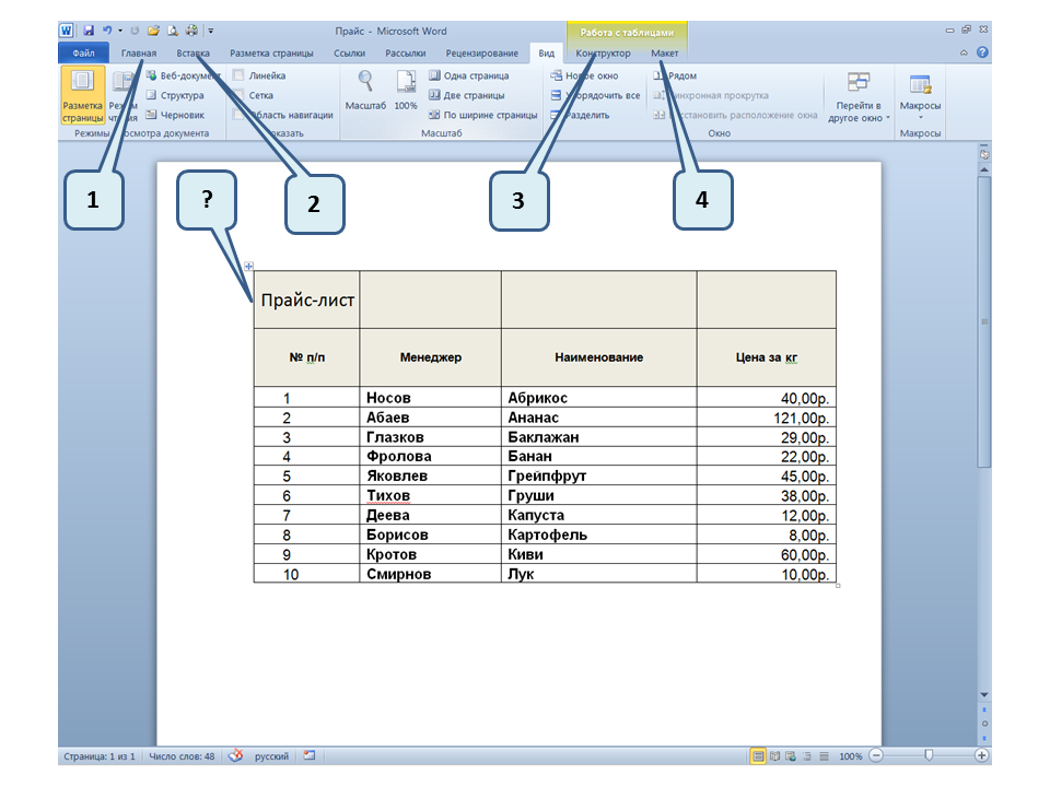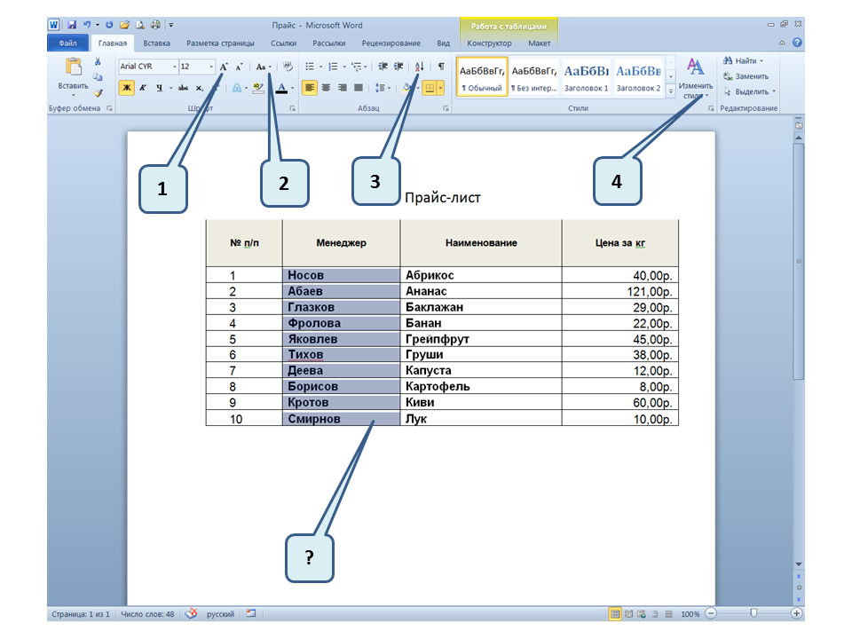 ![]() ?) Строгий ?) Заголовок 1, Заголовок 2 и т.д. ?) Название ?) Обычный Вопрос id:14736 Каким элементом во вкладке Формат можно воспользоваться, чтобы преобразовать вставленный элемент WordArt в такой вид? ![]() ?) 4 ?) 3 ?) 1 ?) 2 Вопрос id:14737 Вы хотите изменить ширину столбца в таблице, буксируя границу, какую клавишу нужно держать, чтобы на линейке отобразились размеры ширины столбца? ![]() ?) Backspace ?) Tab ?) Alt ?) Ctrl Вопрос id:14738 Какой вкладкой следует воспользоваться, чтобы объединить ячейки в первой строке таблицы? ![]() ?) Макет (4) ?) Конструктор (3) ?) Вставка (2) ?) Главная (1) Вопрос id:14739 Что можно установить с помощью этого интервала? ![]() ?) Расстояние между абзацами текста ?) Расстояние между строками текста ?) Расстояние между словами текста ?) Расстояние между символами текста Вопрос id:14740 Каким элементом горизонтальной линейки следует воспользоваться для установки отступа справа всех строк абзаца? ![]() ?) 3 ?) 4 ?) 2 ?) 1 Вопрос id:14741 Какой вкладкой следует воспользоваться, чтобы распечатать текущую страницу? ![]() ?) 4 ?) 2 ?) 3 ?) 1 Вопрос id:14742 Каким элементом следует воспользоваться, чтобы начать абзац с новой страницы? ![]() ?) 1 ?) 3 ?) 2 ?) Это сделать нельзя Вопрос id:14743 Как называется указанный элемент интерфейса MO Word 2010? ![]() ?) Панель форматирования ?) Панель навигации ?) Лента ?) Стандартная панель Вопрос id:14744 Какой вкладкой следует воспользоваться для изменения ориентации страницы? ![]() ?) Вид (4) ?) Вставка (2) ?) Разметка страницы (3) ?) Главная (1) Вопрос id:14745 Какой режим просмотра документа изображен на рисунке? ![]() ?) Структура ?) Разметка страницы ?) Чтение ?) Черновик Вопрос id:14746 Как выделить одно предложение в тексте? ![]() ?) Дважды щелкнуть левой клавишей мышки в любом месте предложения при нажатой клавише CTRL ?) Щелкнуть левой клавишей мышки в любом месте предложения при нажатой клавише Alt ?) Щелкнуть левой клавишей мышки в любом месте предложения при нажатой клавише CTRL ?) Щелкнуть левой клавишей мышки в любом месте предложения при нажатой клавише Shift Вопрос id:14747 Какой вкладкой следует воспользоваться для применения к выделенному тексту визуальных эффектов, таких как тень, свечение или отражение? ![]() ?) Вид (4) ?) Разметка страницы (3) ?) Вставка (2) ?) Главная (1) Вопрос id:14748 Что следует сделать для перехода к редактированию и оформлению ранее созданного колонтитула? ![]() ?) Колонтитул изменить нельзя ?) Скрыть Ленту ?) Дважды щелкнуть левой кнопкой мышки по колонтитулу ?) Перейти в режим Черновик Вопрос id:14749 В каких пределах можно изменять размер шрифта Word? ![]() ?) 1 - 500 пунктов ?) 8 - 72 пунктов ?) 1 – 1638 пунктов ?) 1 – 1000 пунктов Вопрос id:14750 Как называется указанный элемент интерфейса MO Word 2010? ![]() ?) Панель навигации ?) Стандартная панель ?) Панель форматирования ?) Панель быстрого доступа Вопрос id:14751 Каким элементом следует воспользоваться, чтобы фамилии в столбце "Менеджер" выстроились по алфавиту? ![]() ?) 3 ?) 4 ?) 2 ?) 1 Вопрос id:14752 Сколько фрагментов можно одновременно разместить в области Буфера обмена МО Word 2010? ![]() ?) 12 ?) 24 ?) 1 ?) Неограниченно Вопрос id:14753 Как с помощью указателя мышки повернуть рисунок вокруг оси? ![]() ?) Перетащить, ухватившись за любую часть рисунка, кроме маркеров ?) Перетащить, ухватившись за любой маркер (2) ?) Перетащить, ухватившись за маркер (1) ?) Перетащить, ухватившись за любой маркер (3) Вопрос id:14754 Для каких целей предназначен этот элемент на ленте? ![]() ?) Для открытия диалогового окна «Абзац» ?) Для свертыва