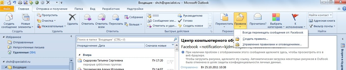 Вопрос id:14953 Что такое «RSS-каналы» в списке папок Outlook 2010? ?) Получение новостей с выбранных сайтов. ?) Способ быстрого обмена мгновенными сообщениями с выбранными пользователями. ?) Для добавление в Избранное часто посещаемых веб страниц. ?) Каналы для быстрой доставки почты с сервера Microsoft Exchange. Вопрос id:14954 Как настроить пометку определенной категорией сообщений, приходящих в папку «Входящие» с определенного адреса? ![]() ?) Щелкнуть правой кнопкой мыши на сообщении и выбрать команду Правила ?) Открыть двойным щелчком сообщение и на ленте выбрать команду Правила ?) На вкладке Главная воспользоваться кнопкой Правила и командой Создать правило ?) На вкладке Главная воспользоваться кнопкой Правила и командой Управление правилами и оповещениями Вопрос id:14955 Нужно отобразить только три дня из одной недели в календаре. Как это сделать? ?) Выделить эти дни в календаре, удерживая левую кнопку мыши. ?) Открыть вкладку «Файл – Параметры – Параметры календаря» и указать эти дни, как рабочие. ?) Использовать вкладку Вид. ?) Открыть можно только один день или всю неделю – нельзя отобразить только три дня. Вопрос id:14956 Необходимо назначить задачу, укажите правильные действия ?) Выбрать в меню Файл команду Создать, а затем команду Поручение. ?) Двойной щелчок в области отображения задач и в открывшемся окне команда - Назначить задачу ?) Чтобы назначить существующую задачу, открыть ее в списке задач и нажать кнопку - Назначить задачу. ?) Находясь в папке Задачи Правая кнопка мыши в области отображения задач и выбрать команду - Создать поручение Вопрос id:14957 Что позволяет сделать данная команда в контекстном меню? ![]() ?) Создать сообщение по одному адресу, который в списке рассылки «Бухгалтерия» используется по умолчанию. ?) Отправить в бухгалтерию мгновенное сообщение ?) Создать сообщение по всем адресам, содержащихся в списке рассылки «Бухгалтерия» ?) Создать сообщение сотрудникам бухгалтерии организации Вопрос id:14958 К чему приведет выбор данной команды меню «Файл» в папке «Входящие»? ![]() ?) К перемещению всех сообщений из папки «Входящие» в Архивные папки. ?) К сжатию сообщений в папке «Входящие» с помощью встроенного архиватора Outlook. ?) К перемещению сообщений поступивших до указанной даты в Архивные папки. ?) К сжатию сообщений в папке «Входящие» с помощью выбранного архиватора. Вопрос id:14959 Что подразумевается под кнопкой «Рабочая неделя» на ленте? ![]() ?) Семидневная неделя. ?) Неделя, состоящая из любых дней, заданных в параметрах Outlook как рабочие. ?) Пятидневная неделя (с понедельника по пятницу). ?) Шестидневная неделя (с понедельника по субботу). Вопрос id:14960 Выберите все правильные утверждения: ?) Встреча предполагает длительность менее суток. ?) События нельзя задать с точностью до часов/минут. ?) Встречи не могут быть повторяющимися. ?) События могут быть длительностью более суток. Вопрос id:14961 Что означает перечеркивание задачи в списке задач Outlook? ![]() ?) Задача была удалена. ?) Задача выполнена. ?) Задача отложена. ?) Задача просрочена. Вопрос id:14962 Какой кнопкой надо воспользоваться, чтобы пометить контакт как частный, т.е. запретить другим пользователям просматривать сведения о данном контакте ![]() ?) 2 ?) 3 ?) 1 ?) 4 Вопрос id:14963 Как отправить письмо с кнопками голосования? ?) Ввести вопрос и варианты ответа в поле Тема в квадратных скобках. ?) Создать новое сообщение, испо