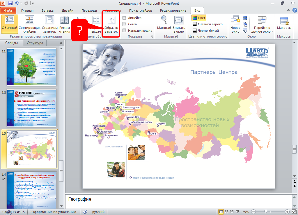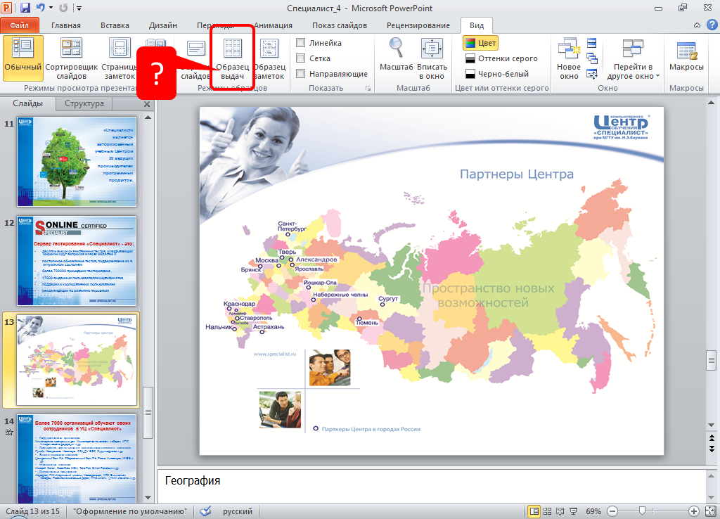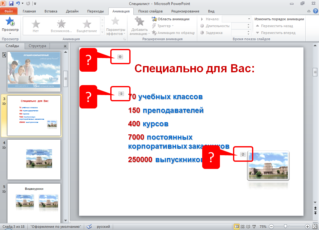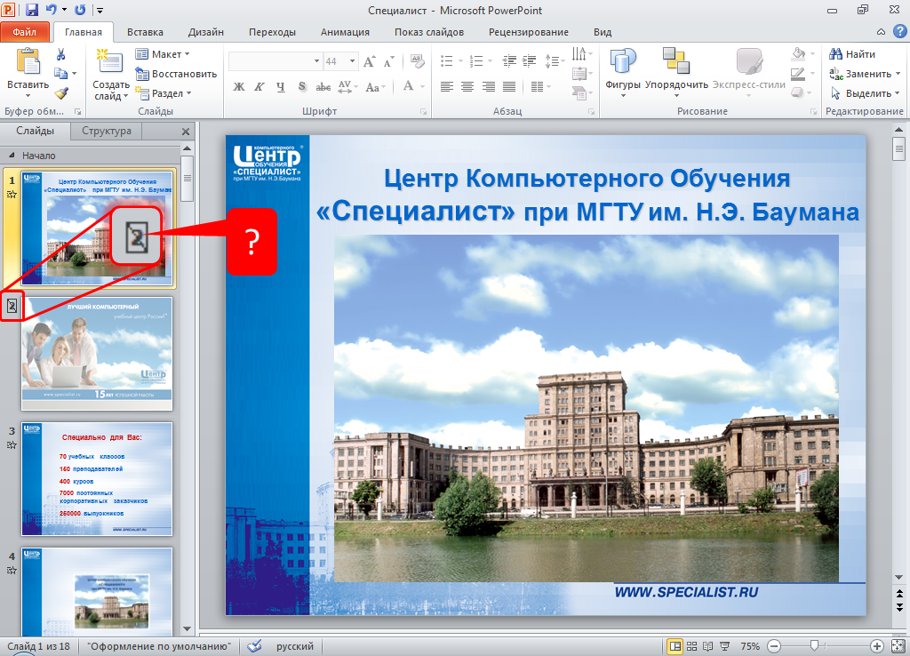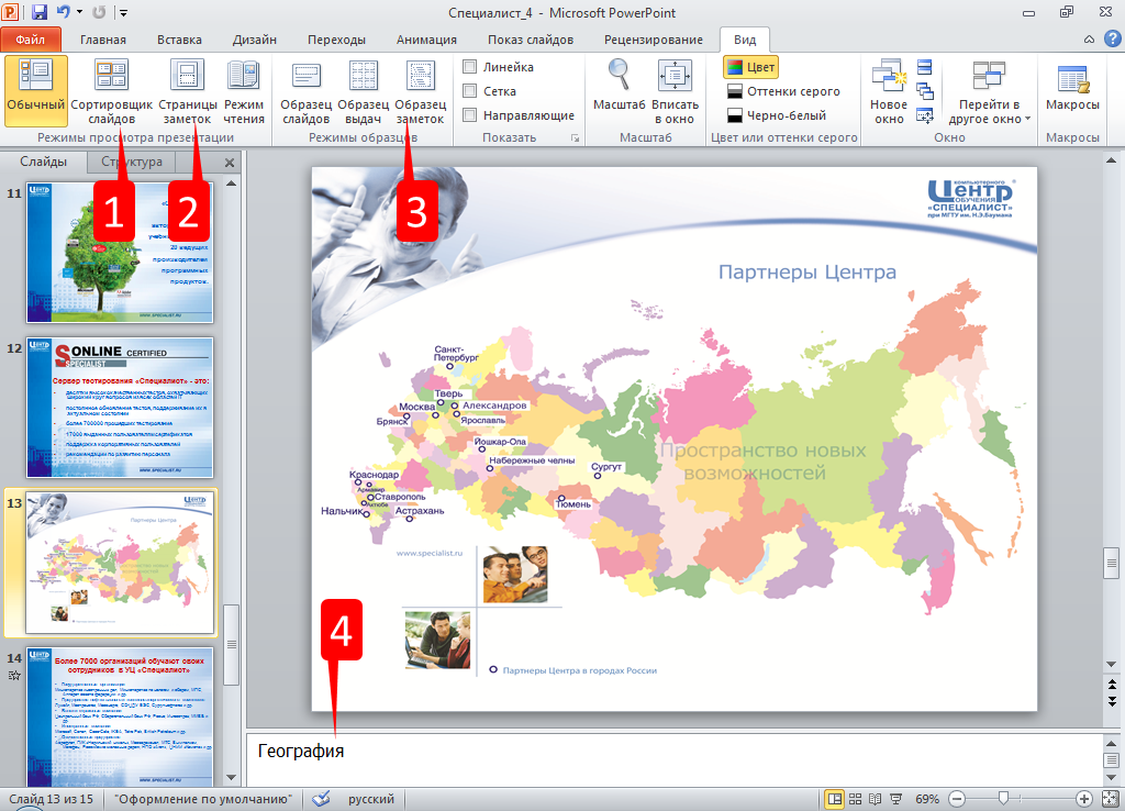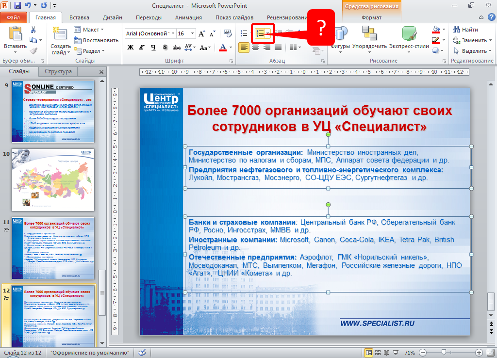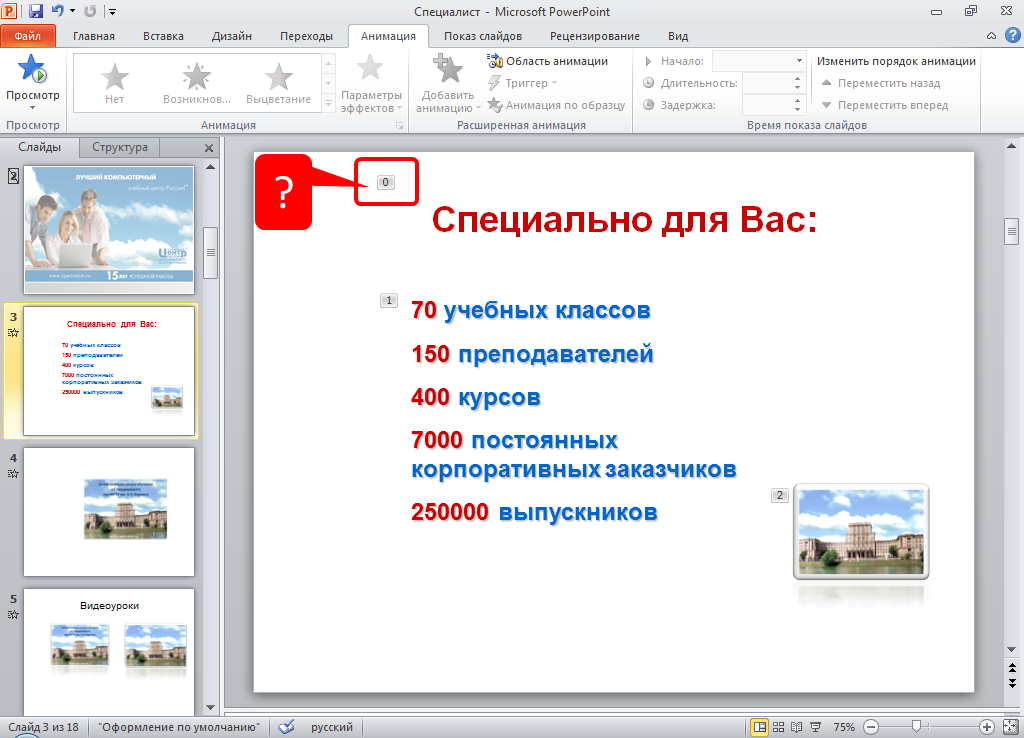 Список вопросов базы знанийПользователь Microsoft PowerPoint 2010Вопрос id:15095 Что произойдет с выделенными фигурами, если в данной ситуации выбрать указанную команду? ![]() ?) Все фигуры сместятся к левому краю слайда ?) Все фигуры выровняются по левому краю фигуры с текстом «Часть 1» ?) Текст в фигурах выровняется по левому краю фигур ?) Все фигуры пропорционально (с сохранением взаимного расположения) сместятся к левому краю слайда Вопрос id:15096 Что означают цифры около элементов слайда? ![]() ?) Продолжительность эффектов анимации этих элементов ?) Элементы добавлены разными авторами ?) Последовательность запуска анимации этих элементов при отображении слайда ?) Продолжительность интервала времени после отображения слайда, через который начинается анимация этих элементов Вопрос id:15097 Презентация содержит несколько скрытых слайдов. Будут ли они напечатаны при печати презентации? ![]() ?) Да, но только при соответствующих настройках параметров печати ?) Нет, скрытые слайды нельзя напечатать ?) Да, но только при печати выдач ?) Да, печатаются все слайды Вопрос id:15098 При создании нового слайда выбран макет «Заголовок и объект». По какому значку следует щелкнуть, чтобы добавить на слайд рисунок из графического файла? ![]() ?) 1 ?) 4 ?) 2 ?) 3 Вопрос id:15099 Для чего можно использовать указанный элемент? ![]() ?) Для изменения расположения слайдов на страницах выдач ?) Для отображения выдач перед печатью презентации ?) Для просмотра образцового оформления выдачи презентации ?) Для настройки расположения областей колонтитулов на страницах выдач Вопрос id:15100 Что означают цифра 0 около заголовка слайда? ![]() ?) Заголовок не будет отображаться при показе презентации ?) Эффект анимации заголовка отключен ?) Эффект анимации заголовка запускается одновременно с отображением слайда ?) Продолжительность анимации заголовка 0 секунд Вопрос id:15101 Каким элементом следует воспользоваться для перехода в режим просмотра «Сортировщик слайдов»? ![]() ?) 1 ?) 3 ?) 4 ?) 2 Вопрос id:15102 Каким элементом следует воспользоваться для показа презентации в непрерывном режиме? ![]() ?) 2 ?) 3 ?) 4 ?) 1 Вопрос id:15103 С использованием темы создана новая презентация. Можно ли в последующем изменить оформление этой презентации? ![]() ?) Да, но только путем выбора другой темы ?) Нет ?) Да, но только путем добавления новых слайдов ?) Да Вопрос id:15104 Для заголовка слайда установлено несколько эффектов анимации. Какой из них является анимацией входа элемента на слайд? ![]() ?) 4 ?) 1 ?) 2 ?) 3 Вопрос id:15105 В презентацию добавляется слайд указанного вида. Куда будет добавлен новый слайд? ![]() ?) Место добавления слайда надо будет выбрать в специальном окне ?) Перед текущим слайдом ?) После текущего слайда ?) В начало презентации Вопрос id:15106 Каким элементом следует воспользоваться для просмотра заметок на своем компьютере при демонстрации презентации на экране? ![]() ?) 1 ?) 3 ?) 2 ?) 4 Вопрос id:15107 Что означает указанный значок около номера слайда (выберите все правильные ответы)? ![]() ?) Для слайда установлен эффект перехода ?) Слайд защищен от изменений ?) Слайд не будет демонстрироваться при показе презентации ?) На слайде используются эффекты анимации ?) Слайд будет демонстрироваться только при показе презентации в автоматическом режиме Вопрос id:15108 Почему номер слайда зачеркнут? ![]() ?) Номер страницы слайда не будет отображаться при печати презентации ?) Слайд от