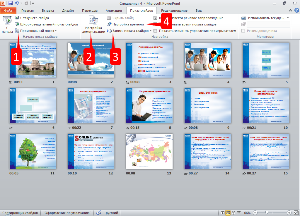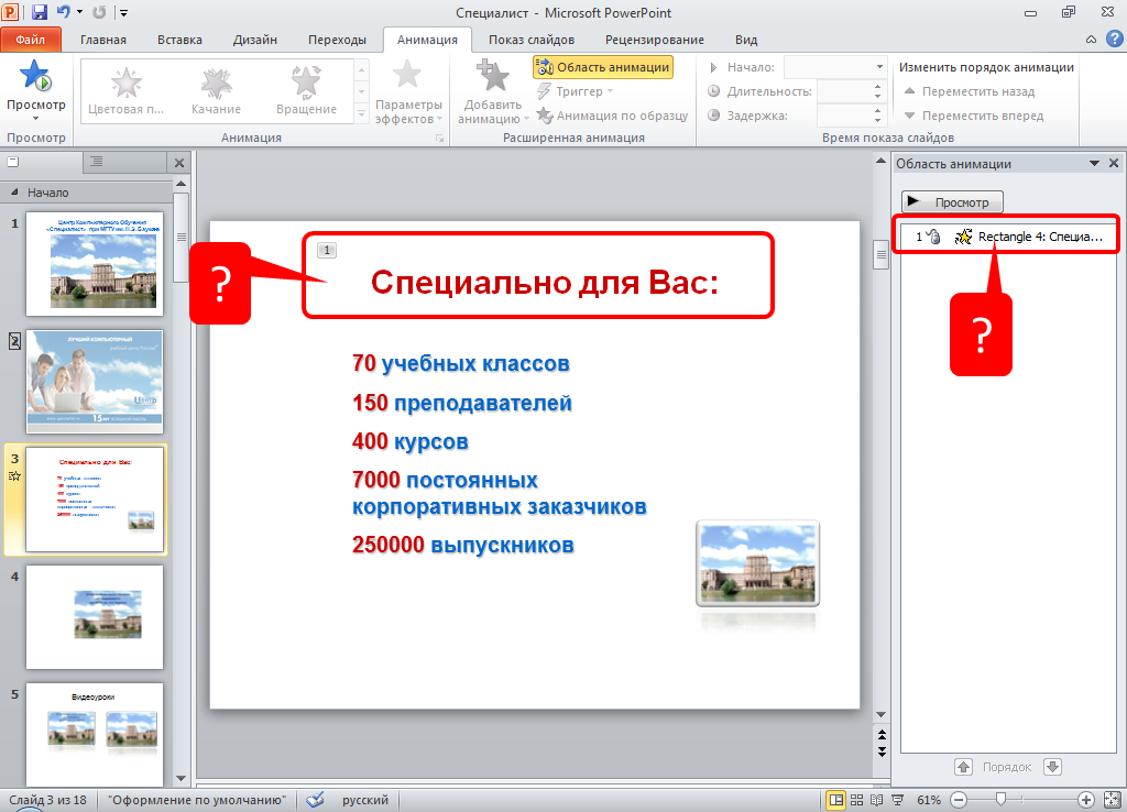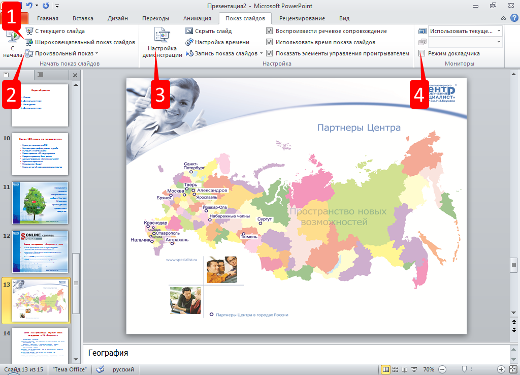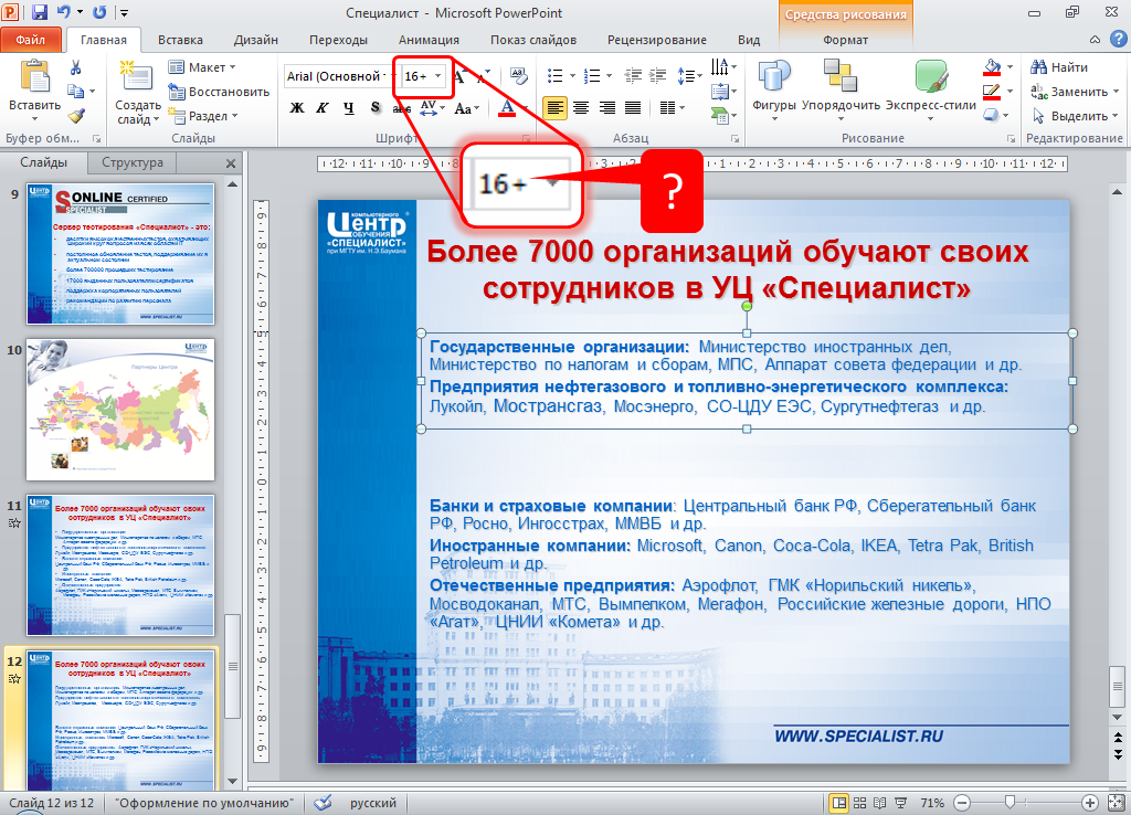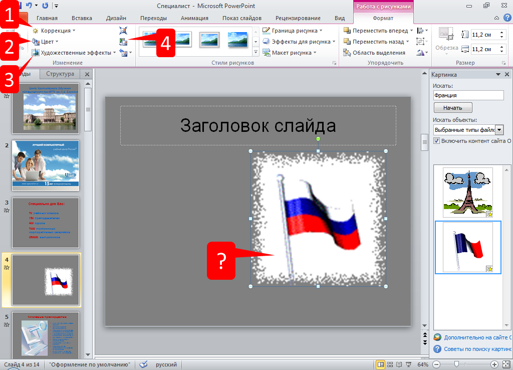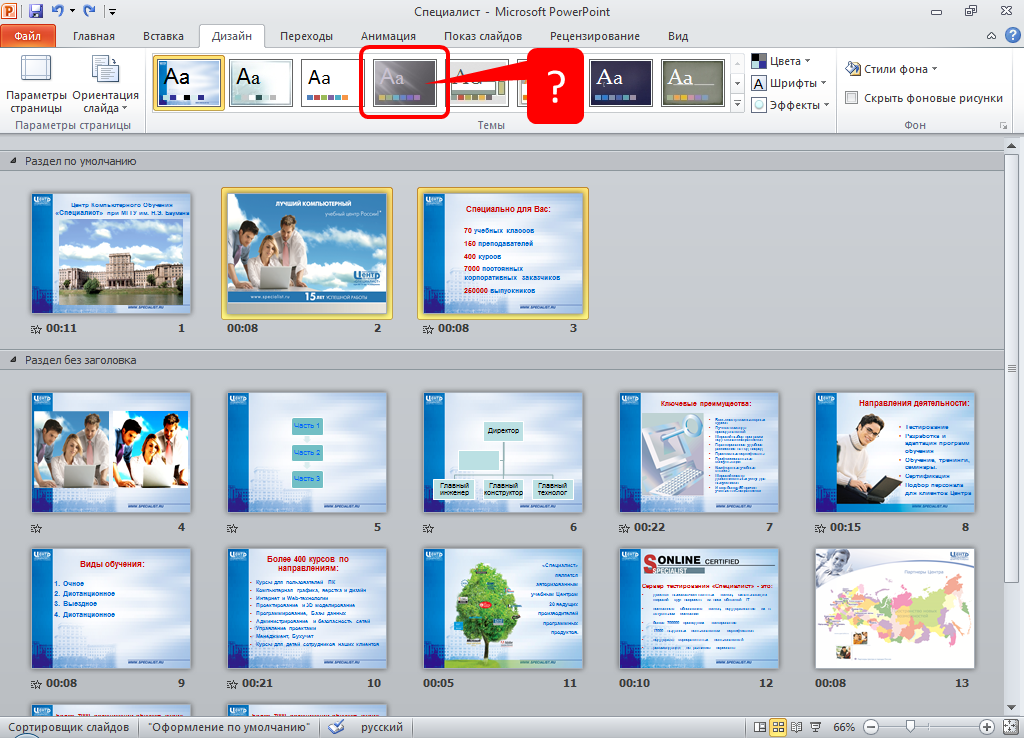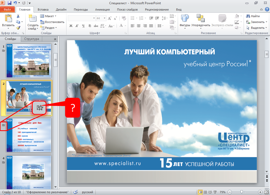 Список вопросов базы знанийПользователь Microsoft PowerPoint 2010Вопрос id:15095 Что произойдет с выделенными фигурами, если в данной ситуации выбрать указанную команду? ![]() ?) Все фигуры сместятся к левому краю слайда ?) Все фигуры выровняются по левому краю фигуры с текстом «Часть 1» ?) Текст в фигурах выровняется по левому краю фигур ?) Все фигуры пропорционально (с сохранением взаимного расположения) сместятся к левому краю слайда Вопрос id:15096 Что означают цифры около элементов слайда? ![]() ?) Продолжительность эффектов анимации этих элементов ?) Элементы добавлены разными авторами ?) Последовательность запуска анимации этих элементов при отображении слайда ?) Продолжительность интервала времени после отображения слайда, через который начинается анимация этих элементов Вопрос id:15097 Презентация содержит несколько скрытых слайдов. Будут ли они напечатаны при печати презентации? ![]() ?) Да, но только при соответствующих настройках параметров печати ?) Нет, скрытые слайды нельзя напечатать ?) Да, но только при печати выдач ?) Да, печатаются все слайды Вопрос id:15098 При создании нового слайда выбран макет «Заголовок и объект». По какому значку следует щелкнуть, чтобы добавить на слайд рисунок из графического файла? ![]() ?) 1 ?) 4 ?) 2 ?) 3 Вопрос id:15099 Для чего можно использовать указанный элемент? ![]() ?) Для изменения расположения слайдов на страницах выдач ?) Для отображения выдач перед печатью презентации ?) Для просмотра образцового оформления выдачи презентации ?) Для настройки расположения областей колонтитулов на страницах выдач Вопрос id:15100 Что означают цифра 0 около заголовка слайда? ![]() ?) Заголовок не будет отображаться при показе презентации ?) Эффект анимации заголовка отключен ?) Эффект анимации заголовка запускается одновременно с отображением слайда ?) Продолжительность анимации заголовка 0 секунд Вопрос id:15101 Каким элементом следует воспользоваться для перехода в режим просмотра «Сортировщик слайдов»? ![]() ?) 1 ?) 3 ?) 4 ?) 2 Вопрос id:15102 Каким элементом следует воспользоваться для показа презентации в непрерывном режиме? ![]() ?) 2 ?) 3 ?) 4 ?) 1 Вопрос id:15103 С использованием темы создана новая презентация. Можно ли в последующем изменить оформление этой презентации? ![]() ?) Да, но только путем выбора другой темы ?) Нет ?) Да, но только путем добавления новых слайдов ?) Да Вопрос id:15104 Для заголовка слайда установлено несколько эффектов анимации. Какой из них является анимацией входа элемента на слайд? ![]() ?) 4 ?) 1 ?) 2 ?) 3 Вопрос id:15105 В презентацию добавляется слайд указанного вида. Куда будет добавлен новый слайд? ![]() ?) Место добавления слайда надо будет выбрать в специальном окне ?) Перед текущим слайдом ?) После текущего слайда ?) В начало презентации Вопрос id:15106 Каким элементом следует воспользоваться для просмотра заметок на своем компьютере при демонстрации презентации на экране? ![]() ?) 1 ?) 3 ?) 2 ?) 4 Вопрос id:15107 Что означает указанный значок около номера слайда (выберите все правильные ответы)? ![]() ?) Для слайда установлен эффект перехода ?) Слайд защищен от изменений ?) Слайд не будет демонстрироваться при показе презентации ?) На слайде используются эффекты анимации ?) Слайд будет демонстрироваться только при показе презентации в автоматическом режиме Вопрос id:15108 Почему номер слайда зачеркнут? ![]() ?) Номер страницы слайда не будет отображаться при печати презентации ?) Слайд от