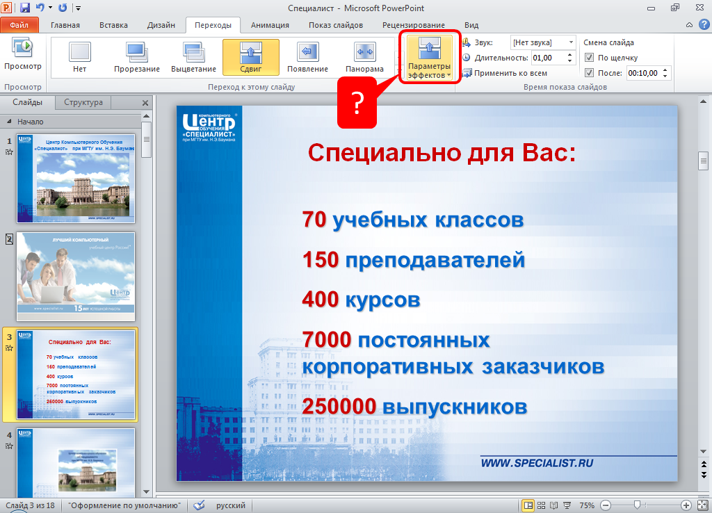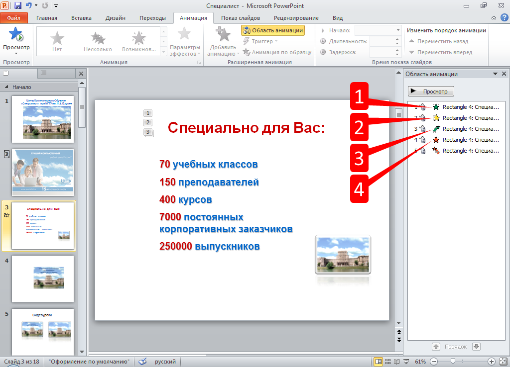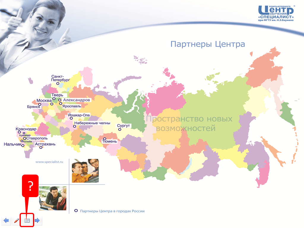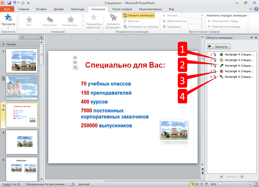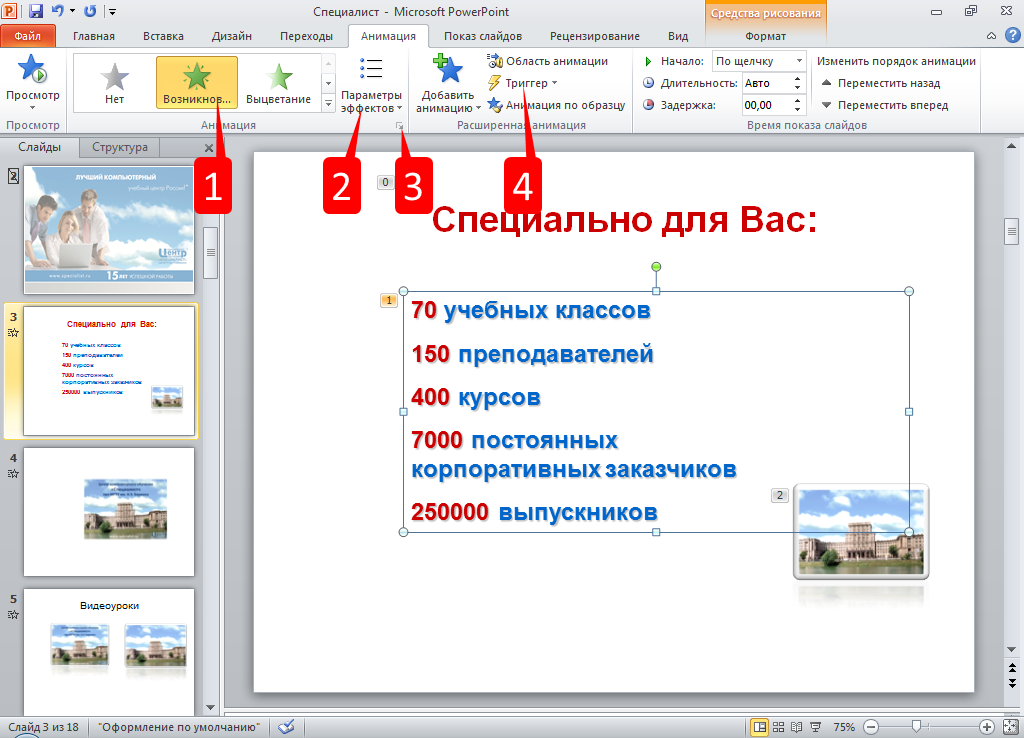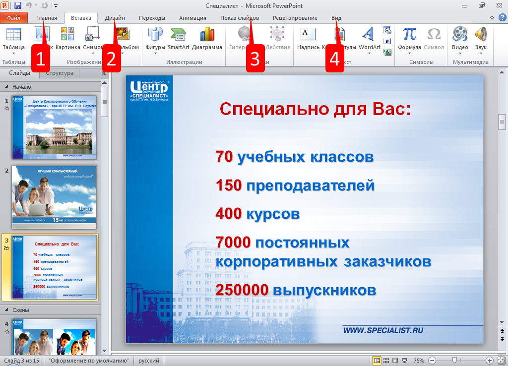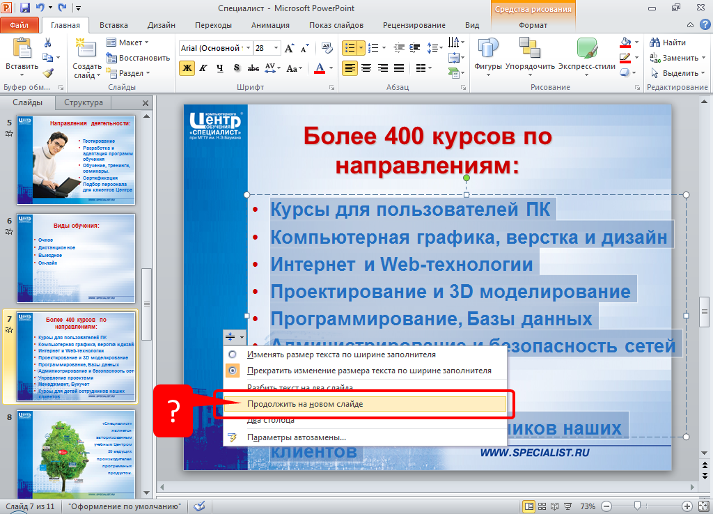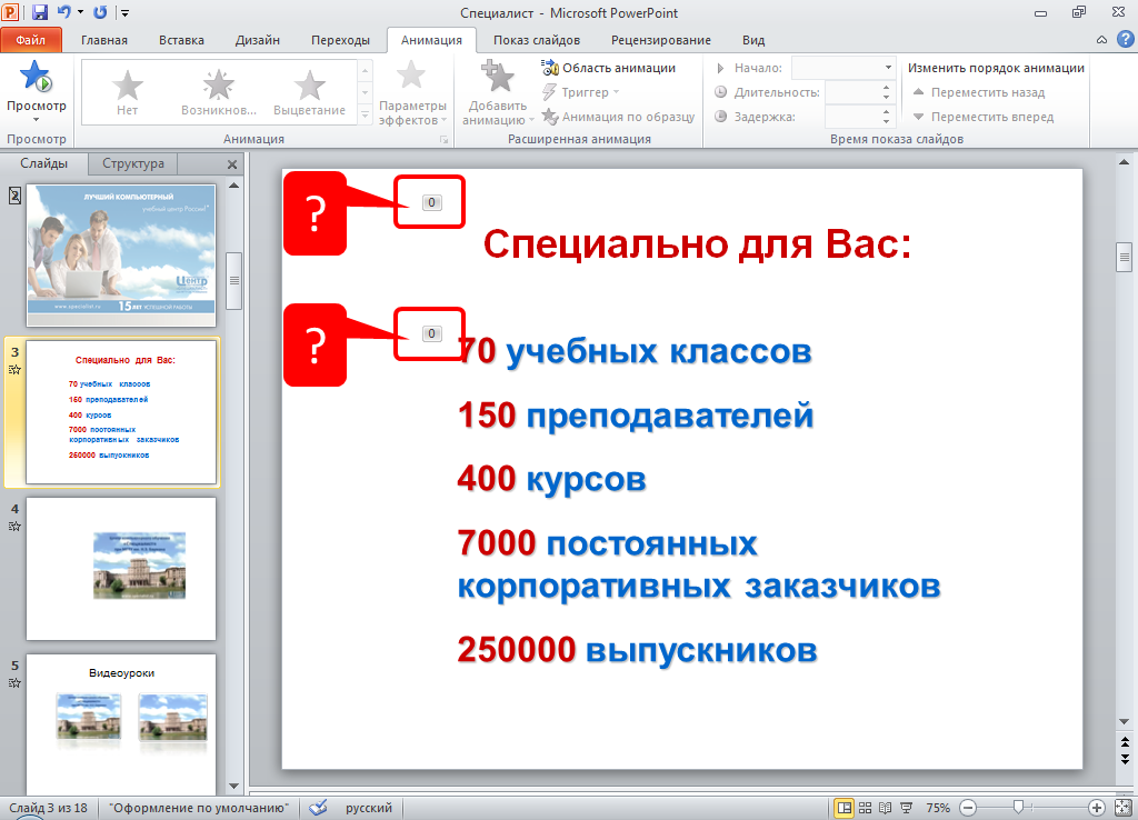 Список вопросов базы знанийПользователь Microsoft PowerPoint 2010Вопрос id:15095 Что произойдет с выделенными фигурами, если в данной ситуации выбрать указанную команду? ![]() ?) Все фигуры сместятся к левому краю слайда ?) Все фигуры выровняются по левому краю фигуры с текстом «Часть 1» ?) Текст в фигурах выровняется по левому краю фигур ?) Все фигуры пропорционально (с сохранением взаимного расположения) сместятся к левому краю слайда Вопрос id:15096 Что означают цифры около элементов слайда? ![]() ?) Продолжительность эффектов анимации этих элементов ?) Элементы добавлены разными авторами ?) Последовательность запуска анимации этих элементов при отображении слайда ?) Продолжительность интервала времени после отображения слайда, через который начинается анимация этих элементов Вопрос id:15097 Презентация содержит несколько скрытых слайдов. Будут ли они напечатаны при печати презентации? ![]() ?) Да, но только при соответствующих настройках параметров печати ?) Нет, скрытые слайды нельзя напечатать ?) Да, но только при печати выдач ?) Да, печатаются все слайды Вопрос id:15098 При создании нового слайда выбран макет «Заголовок и объект». По какому значку следует щелкнуть, чтобы добавить на слайд рисунок из графического файла? ![]() ?) 1 ?) 4 ?) 2 ?) 3 Вопрос id:15099 Для чего можно использовать указанный элемент? ![]() ?) Для изменения расположения слайдов на страницах выдач ?) Для отображения выдач перед печатью презентации ?) Для просмотра образцового оформления выдачи презентации ?) Для настройки расположения областей колонтитулов на страницах выдач Вопрос id:15100 Что означают цифра 0 около заголовка слайда? ![]() ?) Заголовок не будет отображаться при показе презентации ?) Эффект анимации заголовка отключен ?) Эффект анимации заголовка запускается одновременно с отображением слайда ?) Продолжительность анимации заголовка 0 секунд Вопрос id:15101 Каким элементом следует воспользоваться для перехода в режим просмотра «Сортировщик слайдов»? ![]() ?) 1 ?) 3 ?) 4 ?) 2 Вопрос id:15102 Каким элементом следует воспользоваться для показа презентации в непрерывном режиме? ![]() ?) 2 ?) 3 ?) 4 ?) 1 Вопрос id:15103 С использованием темы создана новая презентация. Можно ли в последующем изменить оформление этой презентации? ![]() ?) Да, но только путем выбора другой темы ?) Нет ?) Да, но только путем добавления новых слайдов ?) Да Вопрос id:15104 Для заголовка слайда установлено несколько эффектов анимации. Какой из них является анимацией входа элемента на слайд? ![]() ?) 4 ?) 1 ?) 2 ?) 3 Вопрос id:15105 В презентацию добавляется слайд указанного вида. Куда будет добавлен новый слайд? ![]() ?) Место добавления слайда надо будет выбрать в специальном окне ?) Перед текущим слайдом ?) После текущего слайда ?) В начало презентации Вопрос id:15106 Каким элементом следует воспользоваться для просмотра заметок на своем компьютере при демонстрации презентации на экране? ![]() ?) 1 ?) 3 ?) 2 ?) 4 Вопрос id:15107 Что означает указанный значок около номера слайда (выберите все правильные ответы)? ![]() ?) Для слайда установлен эффект перехода ?) Слайд защищен от изменений ?) Слайд не будет демонстрироваться при показе презентации ?) На слайде используются эффекты анимации ?) Слайд будет демонстрироваться только при показе презентации в автоматическом режиме Вопрос id:15108 Почему номер слайда зачеркнут? ![]() ?) Номер страницы слайда не будет отображаться при печати презентации ?) Слайд от