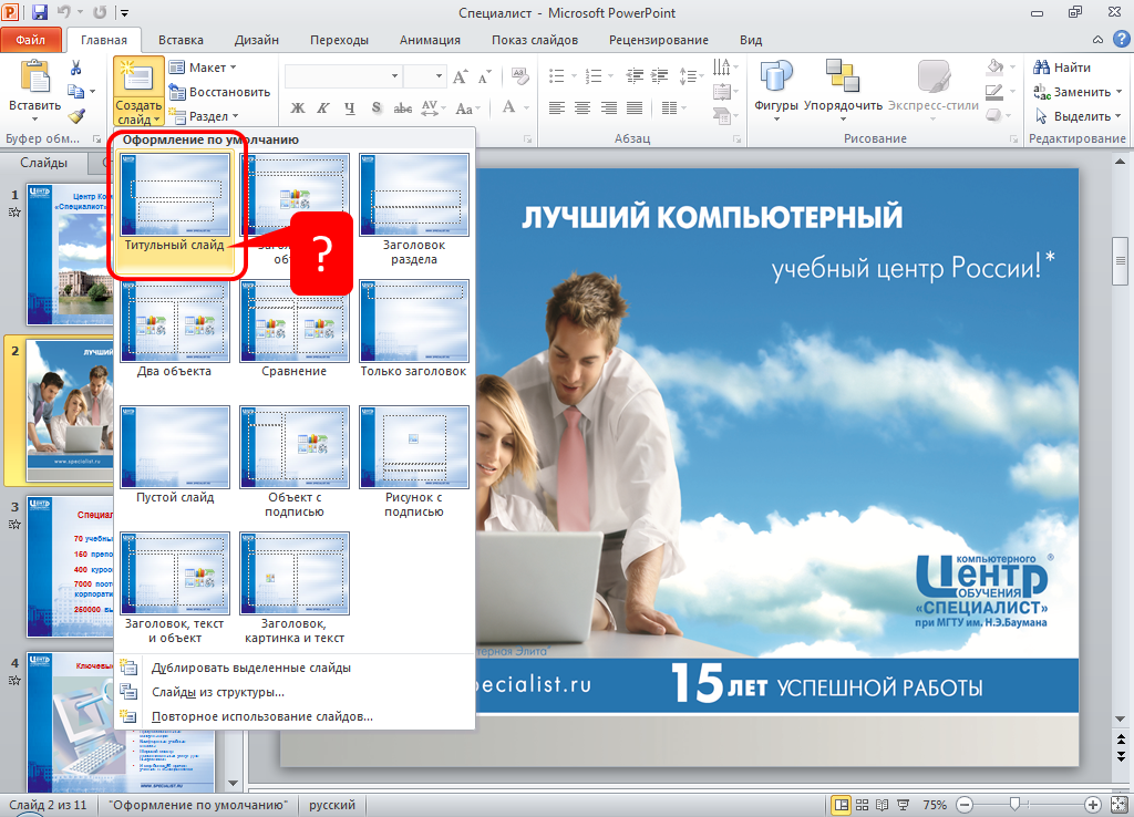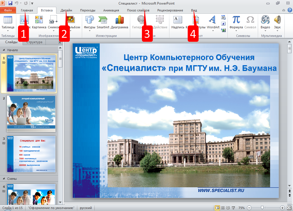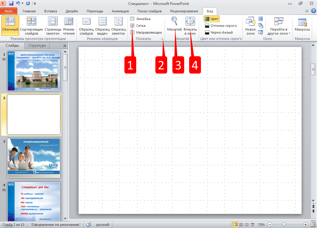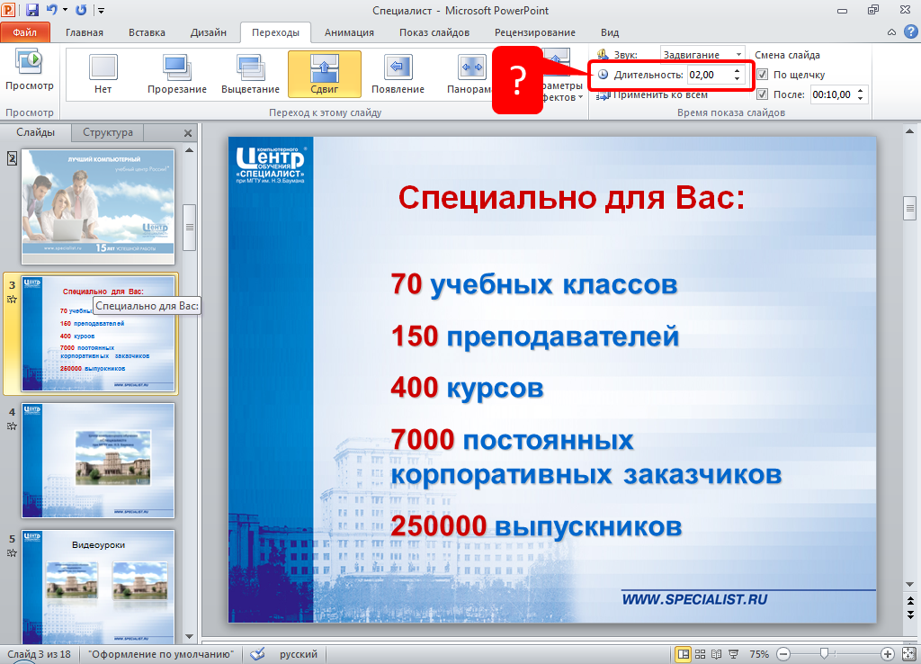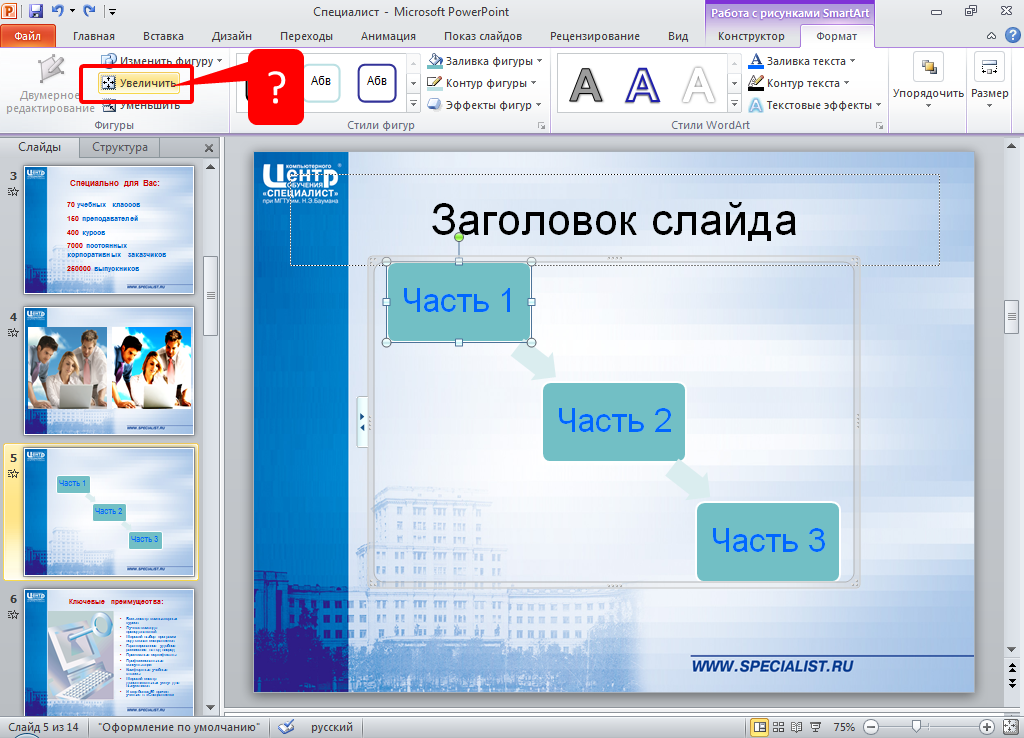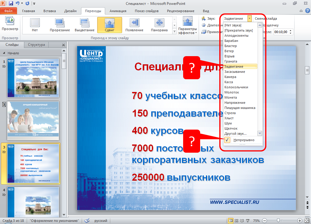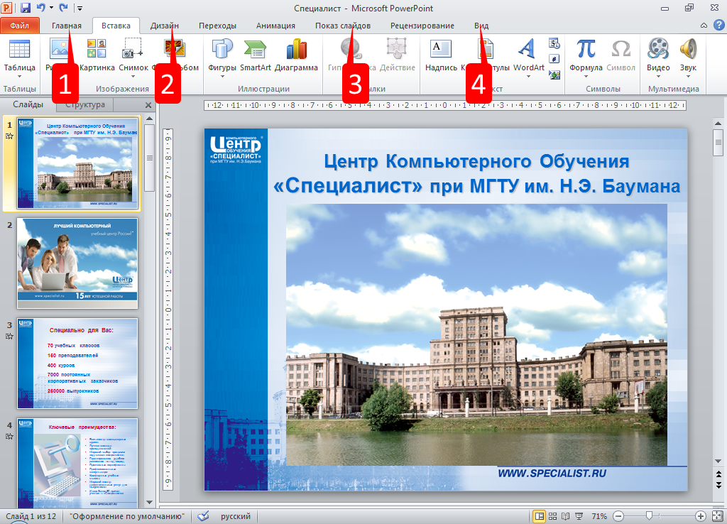 Список вопросов базы знанийПользователь Microsoft PowerPoint 2010Вопрос id:15095 Что произойдет с выделенными фигурами, если в данной ситуации выбрать указанную команду? ![]() ?) Все фигуры сместятся к левому краю слайда ?) Все фигуры выровняются по левому краю фигуры с текстом «Часть 1» ?) Текст в фигурах выровняется по левому краю фигур ?) Все фигуры пропорционально (с сохранением взаимного расположения) сместятся к левому краю слайда Вопрос id:15096 Что означают цифры около элементов слайда? ![]() ?) Продолжительность эффектов анимации этих элементов ?) Элементы добавлены разными авторами ?) Последовательность запуска анимации этих элементов при отображении слайда ?) Продолжительность интервала времени после отображения слайда, через который начинается анимация этих элементов Вопрос id:15097 Презентация содержит несколько скрытых слайдов. Будут ли они напечатаны при печати презентации? ![]() ?) Да, но только при соответствующих настройках параметров печати ?) Нет, скрытые слайды нельзя напечатать ?) Да, но только при печати выдач ?) Да, печатаются все слайды Вопрос id:15098 При создании нового слайда выбран макет «Заголовок и объект». По какому значку следует щелкнуть, чтобы добавить на слайд рисунок из графического файла? ![]() ?) 1 ?) 4 ?) 2 ?) 3 Вопрос id:15099 Для чего можно использовать указанный элемент? ![]() ?) Для изменения расположения слайдов на страницах выдач ?) Для отображения выдач перед печатью презентации ?) Для просмотра образцового оформления выдачи презентации ?) Для настройки расположения областей колонтитулов на страницах выдач Вопрос id:15100 Что означают цифра 0 около заголовка слайда? ![]() ?) Заголовок не будет отображаться при показе презентации ?) Эффект анимации заголовка отключен ?) Эффект анимации заголовка запускается одновременно с отображением слайда ?) Продолжительность анимации заголовка 0 секунд Вопрос id:15101 Каким элементом следует воспользоваться для перехода в режим просмотра «Сортировщик слайдов»? ![]() ?) 1 ?) 3 ?) 4 ?) 2 Вопрос id:15102 Каким элементом следует воспользоваться для показа презентации в непрерывном режиме? ![]() ?) 2 ?) 3 ?) 4 ?) 1 Вопрос id:15103 С использованием темы создана новая презентация. Можно ли в последующем изменить оформление этой презентации? ![]() ?) Да, но только путем выбора другой темы ?) Нет ?) Да, но только путем добавления новых слайдов ?) Да Вопрос id:15104 Для заголовка слайда установлено несколько эффектов анимации. Какой из них является анимацией входа элемента на слайд? ![]() ?) 4 ?) 1 ?) 2 ?) 3 Вопрос id:15105 В презентацию добавляется слайд указанного вида. Куда будет добавлен новый слайд? ![]() ?) Место добавления слайда надо будет выбрать в специальном окне ?) Перед текущим слайдом ?) После текущего слайда ?) В начало презентации Вопрос id:15106 Каким элементом следует воспользоваться для просмотра заметок на своем компьютере при демонстрации презентации на экране? ![]() ?) 1 ?) 3 ?) 2 ?) 4 Вопрос id:15107 Что означает указанный значок около номера слайда (выберите все правильные ответы)? ![]() ?) Для слайда установлен эффект перехода ?) Слайд защищен от изменений ?) Слайд не будет демонстрироваться при показе презентации ?) На слайде используются эффекты анимации ?) Слайд будет демонстрироваться только при показе презентации в автоматическом режиме Вопрос id:15108 Почему номер слайда зачеркнут? ![]() ?) Номер страницы слайда не будет отображаться при печати презентации ?) Слайд от