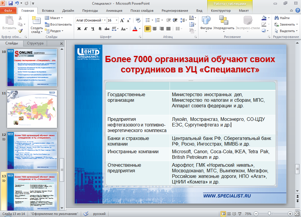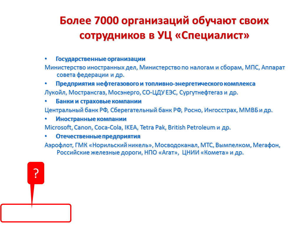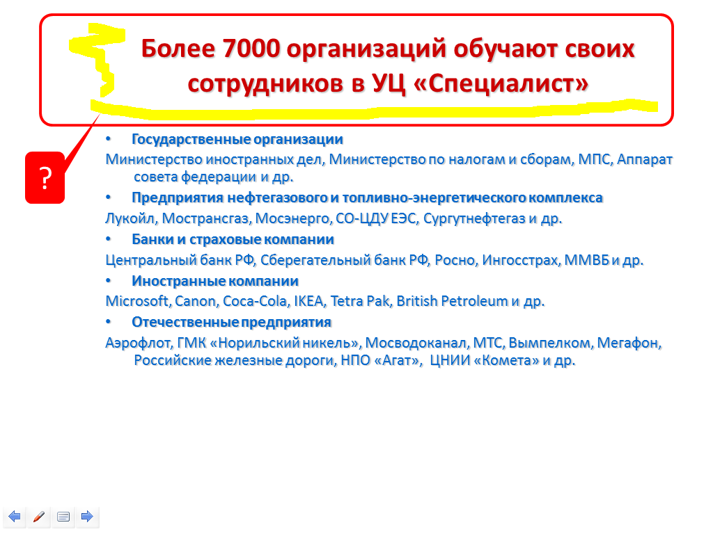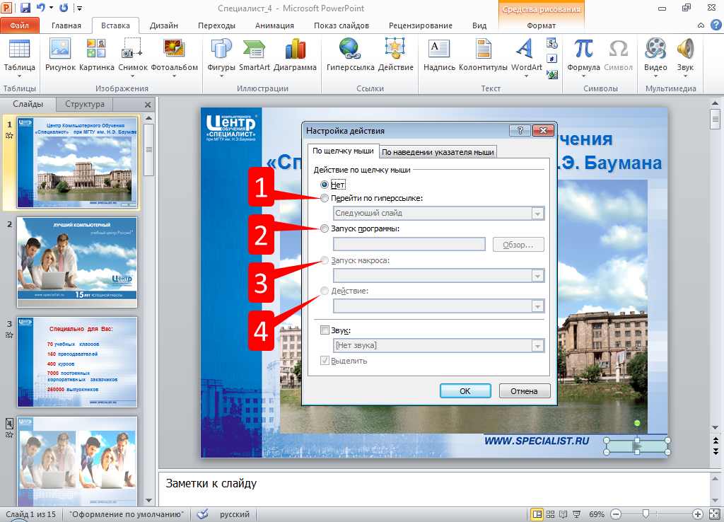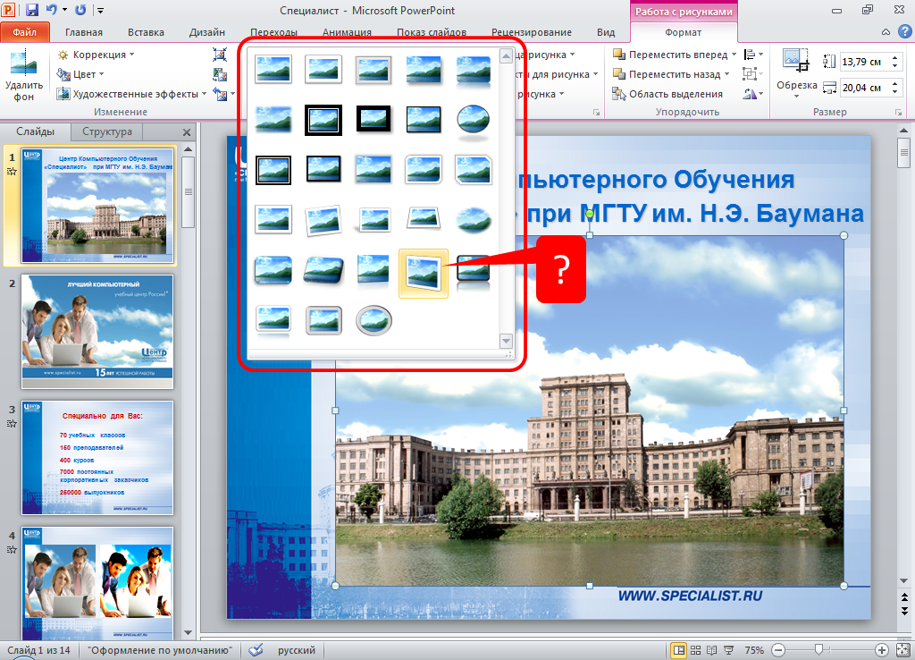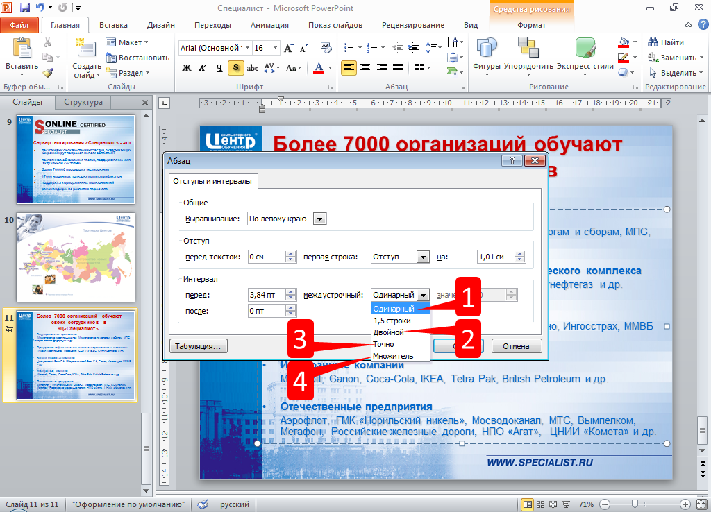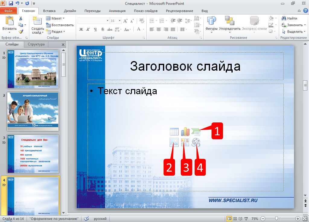 Список вопросов базы знанийПользователь Microsoft PowerPoint 2010Вопрос id:15095 Что произойдет с выделенными фигурами, если в данной ситуации выбрать указанную команду? ![]() ?) Все фигуры сместятся к левому краю слайда ?) Все фигуры выровняются по левому краю фигуры с текстом «Часть 1» ?) Текст в фигурах выровняется по левому краю фигур ?) Все фигуры пропорционально (с сохранением взаимного расположения) сместятся к левому краю слайда Вопрос id:15096 Что означают цифры около элементов слайда? ![]() ?) Продолжительность эффектов анимации этих элементов ?) Элементы добавлены разными авторами ?) Последовательность запуска анимации этих элементов при отображении слайда ?) Продолжительность интервала времени после отображения слайда, через который начинается анимация этих элементов Вопрос id:15097 Презентация содержит несколько скрытых слайдов. Будут ли они напечатаны при печати презентации? ![]() ?) Да, но только при соответствующих настройках параметров печати ?) Нет, скрытые слайды нельзя напечатать ?) Да, но только при печати выдач ?) Да, печатаются все слайды Вопрос id:15098 При создании нового слайда выбран макет «Заголовок и объект». По какому значку следует щелкнуть, чтобы добавить на слайд рисунок из графического файла? ![]() ?) 1 ?) 4 ?) 2 ?) 3 Вопрос id:15099 Для чего можно использовать указанный элемент? ![]() ?) Для изменения расположения слайдов на страницах выдач ?) Для отображения выдач перед печатью презентации ?) Для просмотра образцового оформления выдачи презентации ?) Для настройки расположения областей колонтитулов на страницах выдач Вопрос id:15100 Что означают цифра 0 около заголовка слайда? ![]() ?) Заголовок не будет отображаться при показе презентации ?) Эффект анимации заголовка отключен ?) Эффект анимации заголовка запускается одновременно с отображением слайда ?) Продолжительность анимации заголовка 0 секунд Вопрос id:15101 Каким элементом следует воспользоваться для перехода в режим просмотра «Сортировщик слайдов»? ![]() ?) 1 ?) 3 ?) 4 ?) 2 Вопрос id:15102 Каким элементом следует воспользоваться для показа презентации в непрерывном режиме? ![]() ?) 2 ?) 3 ?) 4 ?) 1 Вопрос id:15103 С использованием темы создана новая презентация. Можно ли в последующем изменить оформление этой презентации? ![]() ?) Да, но только путем выбора другой темы ?) Нет ?) Да, но только путем добавления новых слайдов ?) Да Вопрос id:15104 Для заголовка слайда установлено несколько эффектов анимации. Какой из них является анимацией входа элемента на слайд? ![]() ?) 4 ?) 1 ?) 2 ?) 3 Вопрос id:15105 В презентацию добавляется слайд указанного вида. Куда будет добавлен новый слайд? ![]() ?) Место добавления слайда надо будет выбрать в специальном окне ?) Перед текущим слайдом ?) После текущего слайда ?) В начало презентации Вопрос id:15106 Каким элементом следует воспользоваться для просмотра заметок на своем компьютере при демонстрации презентации на экране? ![]() ?) 1 ?) 3 ?) 2 ?) 4 Вопрос id:15107 Что означает указанный значок около номера слайда (выберите все правильные ответы)? ![]() ?) Для слайда установлен эффект перехода ?) Слайд защищен от изменений ?) Слайд не будет демонстрироваться при показе презентации ?) На слайде используются эффекты анимации ?) Слайд будет демонстрироваться только при показе презентации в автоматическом режиме Вопрос id:15108 Почему номер слайда зачеркнут? ![]() ?) Номер страницы слайда не будет отображаться при печати презентации ?) Слайд от
