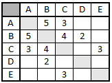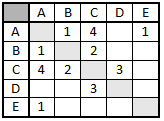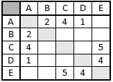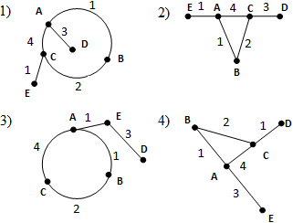В таблице приведена стоимость перевозки пассажиров между соседними населенными пунктами. Укажите схему, соответствующую таблице. ?) ![]() ?) ![]() ?) ![]() ?) ![]() Вопрос id:395868 Тема/шкала: B5-Анализ информационных моделей-Таблицы и схемы