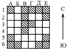 Вопрос id:396702 Тема/шкала: B14-Выполнение алгоритмов для исполнителя Робот-Нестандартные задачи Исследуя записи в тетради одного из пиратов, кладоискатели обнаружили следующие указания: 1.60 шагов на юг 2.30 шагов на восток 3.30 шагов на север 4.60 шагов на юг Предположительно, этому алгоритму должен следовать человек, желающий найти закопанный клад. Продолжив свои исследования, кладоискатели обнаружили также и карту острова, на котором должен располагаться тайник с кладом (см. рис.). Сторона каждого квадрата на этой карте приблизительно равна 30 шагам. Заштрихованный квадрат означает непроходимую местность (например, море), белый квадрат – проходимые участки суши.