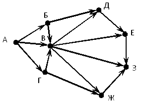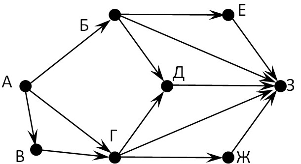 Вопрос id:396803 Тема/шкала: B15-Поиск путей в графе-Поиск количества путей На рисунке – схема дорог, связывающих города А, Б, В, Г, Д, Е, Ж, З. По каждой дороге можно двигаться только в одном направлении, указанном стрелкой. Сколько существует различных путей из города А в город З?
